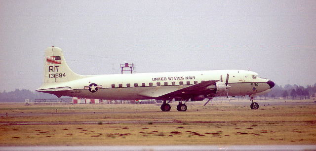 1980年2月ルーク空軍基地で撮影したVr-53のC-118B、上の写真と違い”RT”は、グリーンのベルトの中に書かれていた。胴体後部の国籍マークの右下に所属部隊である”VR-53”と記入されている。何と少しぶれた写真となって見苦しいが、珍しい機体なので掲載する事とした。この後にC-9Bに機種変更して厚木にも飛来したことがあるが、私は撮り逃している。このC-118Bと言う機体、WWUに作られたC-54を機内を与圧化して民間機改造したもの、これを再び海軍はC-118と銘打って軍用機として利用した。使い安い機体であったようで、海軍では1980年代の初めまで使い続けた。C-54とC-118は、この後台湾でも軍用機として使われている機体を目にすることになる。