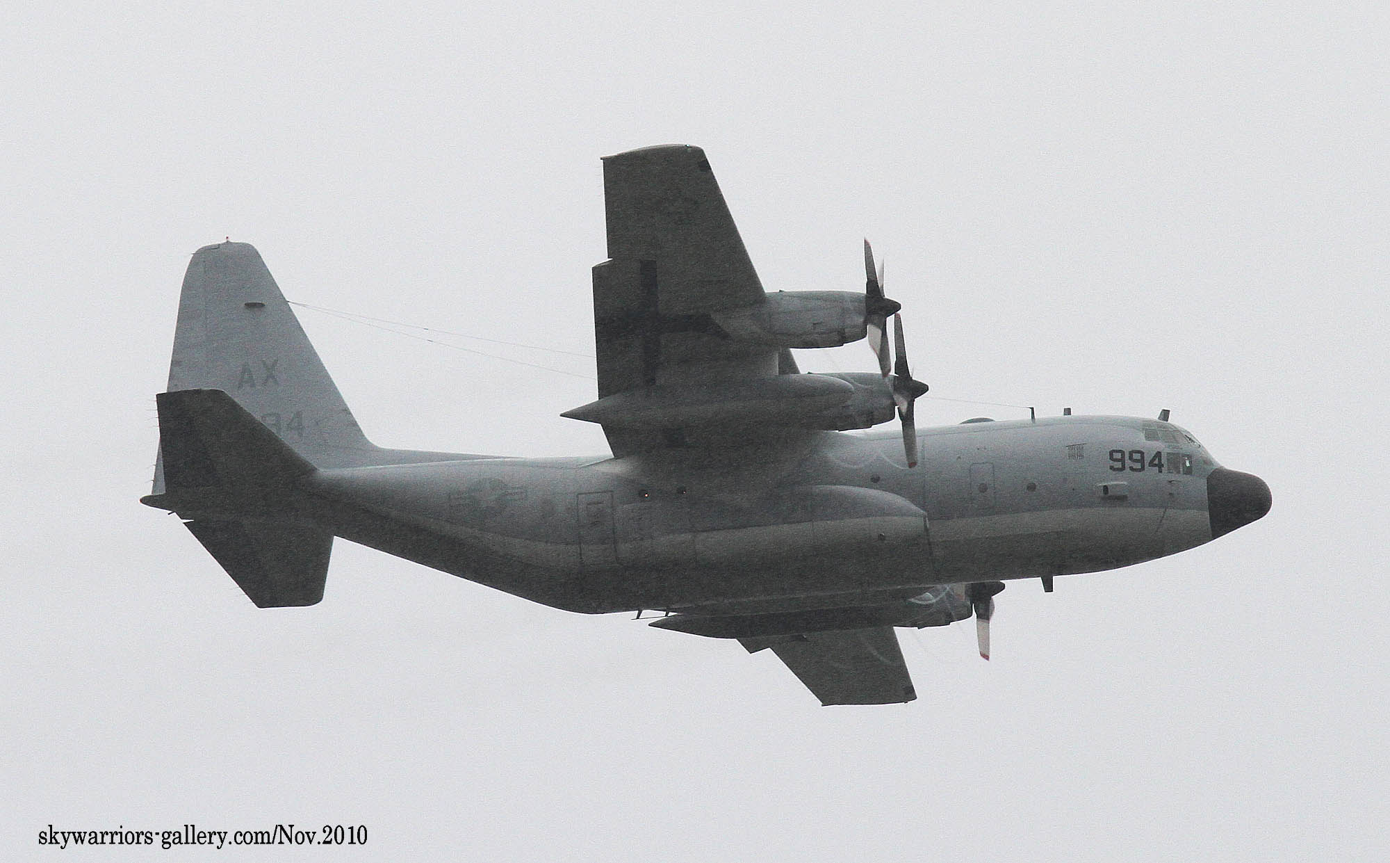 2010/11/30 嘉手納を離陸するVR-53のC-130T。私にとっては初物のAX-994。しかも鼻黒の機首。この日は残念ながら小降りの雨の中、離陸して行ったので写真が証拠写真程度の内容。Bu.No.164994であるが、 Bu.No.164995のC-130TもVR-53の所属だ。確認されているのは、164994,164995,164997,164998の4機だそうである。