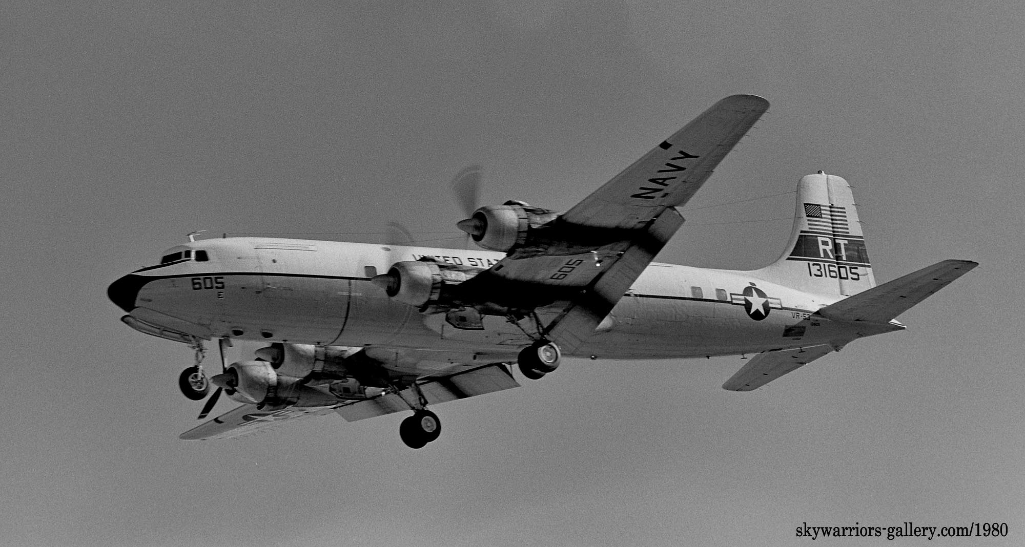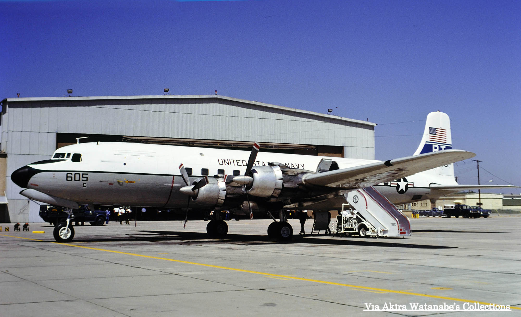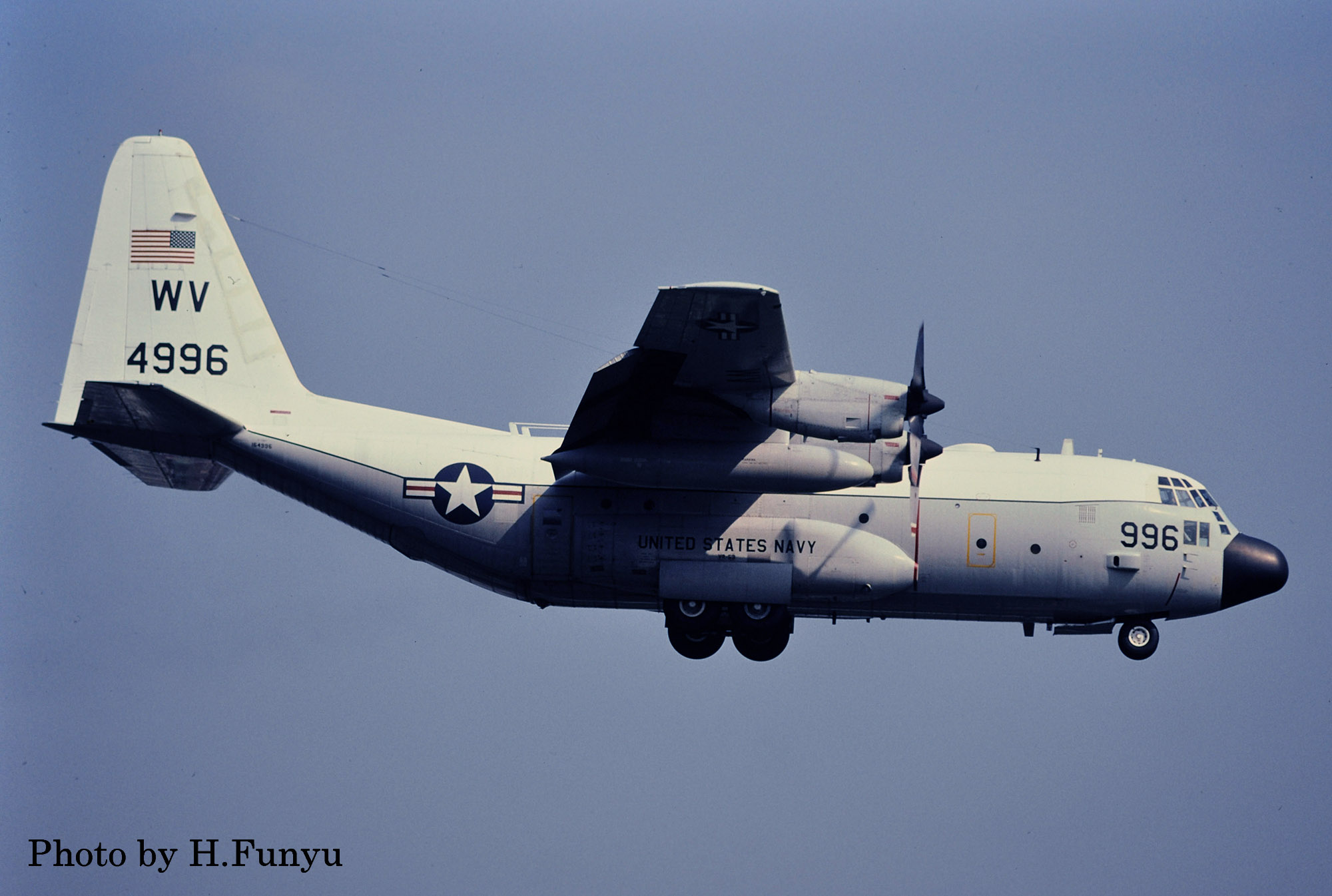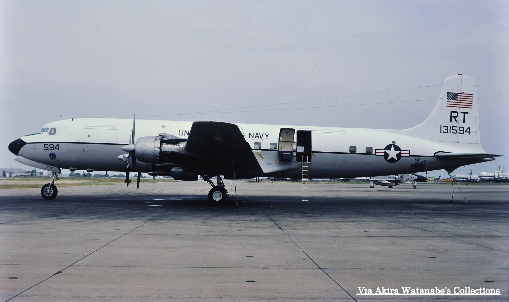 1976年秋の曇り空の厚木基地に1機の4発プロペラ機が降り立った。1976〜1977までは、輸送任務をおびたプロペラ輸送機の存在は珍しくは無く、4発機C-118Bも日本では”RZ”のレターを入れたC-118Bを見ることができた。しかし、その日降りた機体の尾翼に、それまで見たことも無い”RT”と書かれてあった。家に帰って文献を確認したら、何とNASメンフィスを本拠地にしているVR-53で 厚木基地にはめったの来ない「ド珍機」であったのだ。この数ヵ月後 厚木の友人が、ケフラビックから飛来したVR-51”RV”のC-118Bを撮っているが、レシプロ輸送機時代の終焉にあたり厚木基地では連続して珍しい部隊が撮れた。(2006年2月 記)