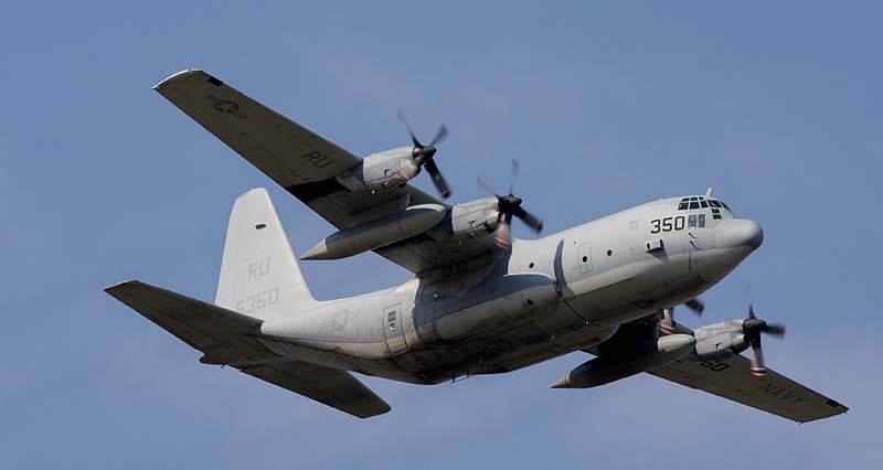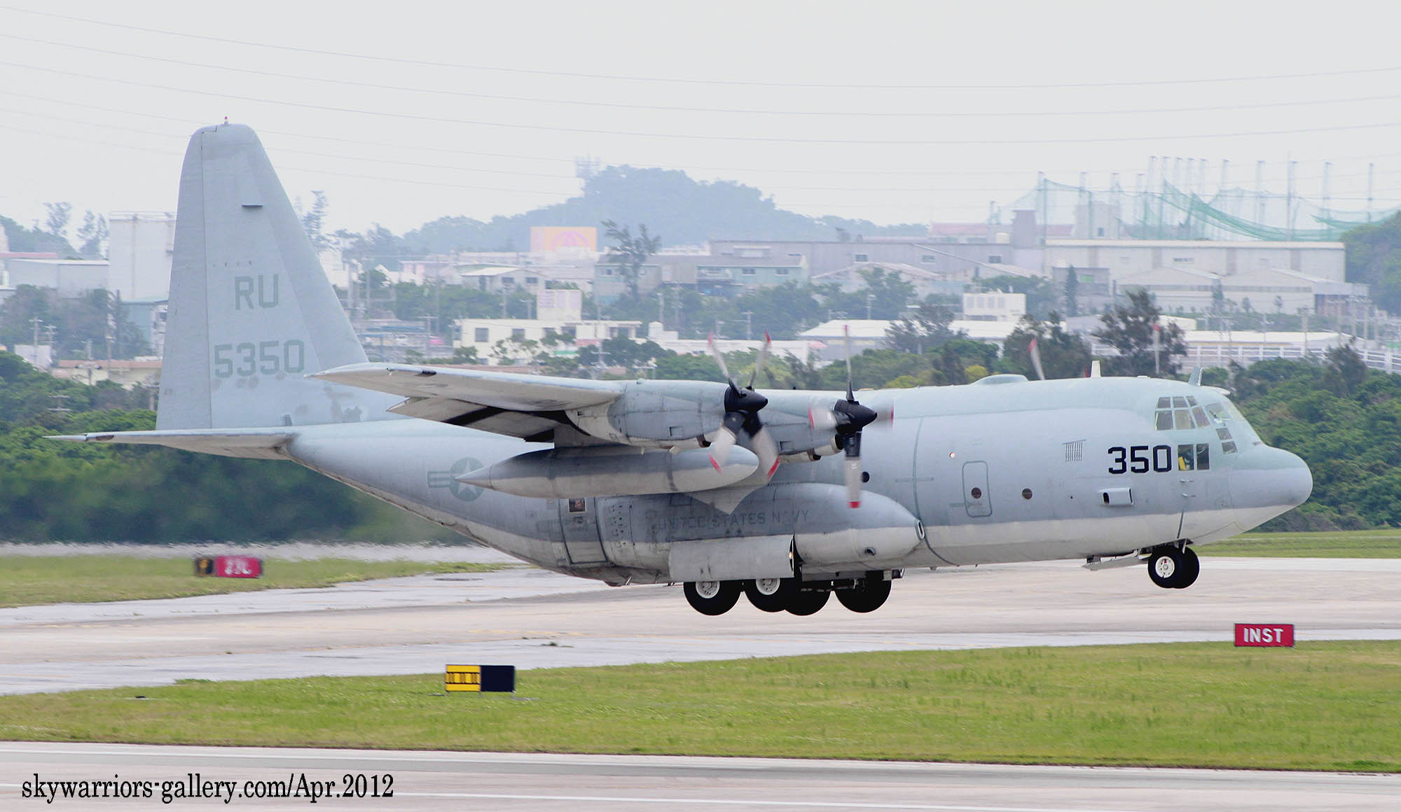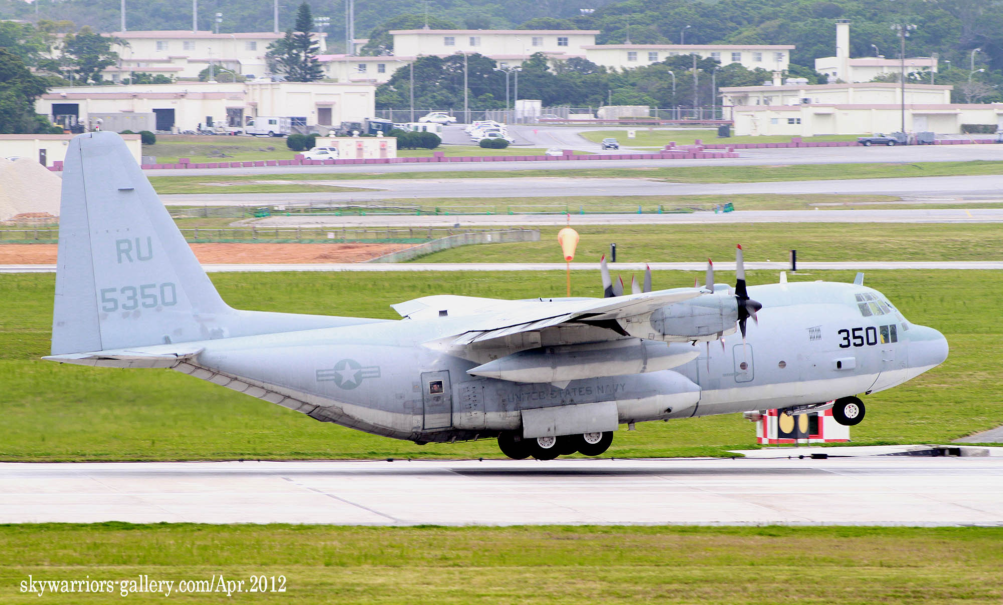 ↑ 2012年4月某日嘉手納基地に着陸するVR-55のC-130T。VR-55はC-130Tを受領した5つの飛行隊の一つであるが、165349、165350、165351の連番の機体の他、165379が確認されている。上のRU-350とRU-351は、写真のように淡い2色のグレー迷彩であるが、その他は濃いグレー塗装に塗られているそうだ。
