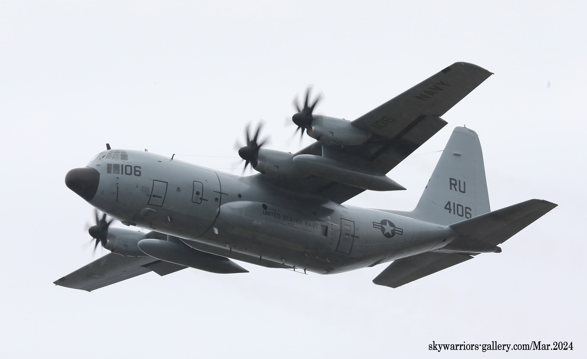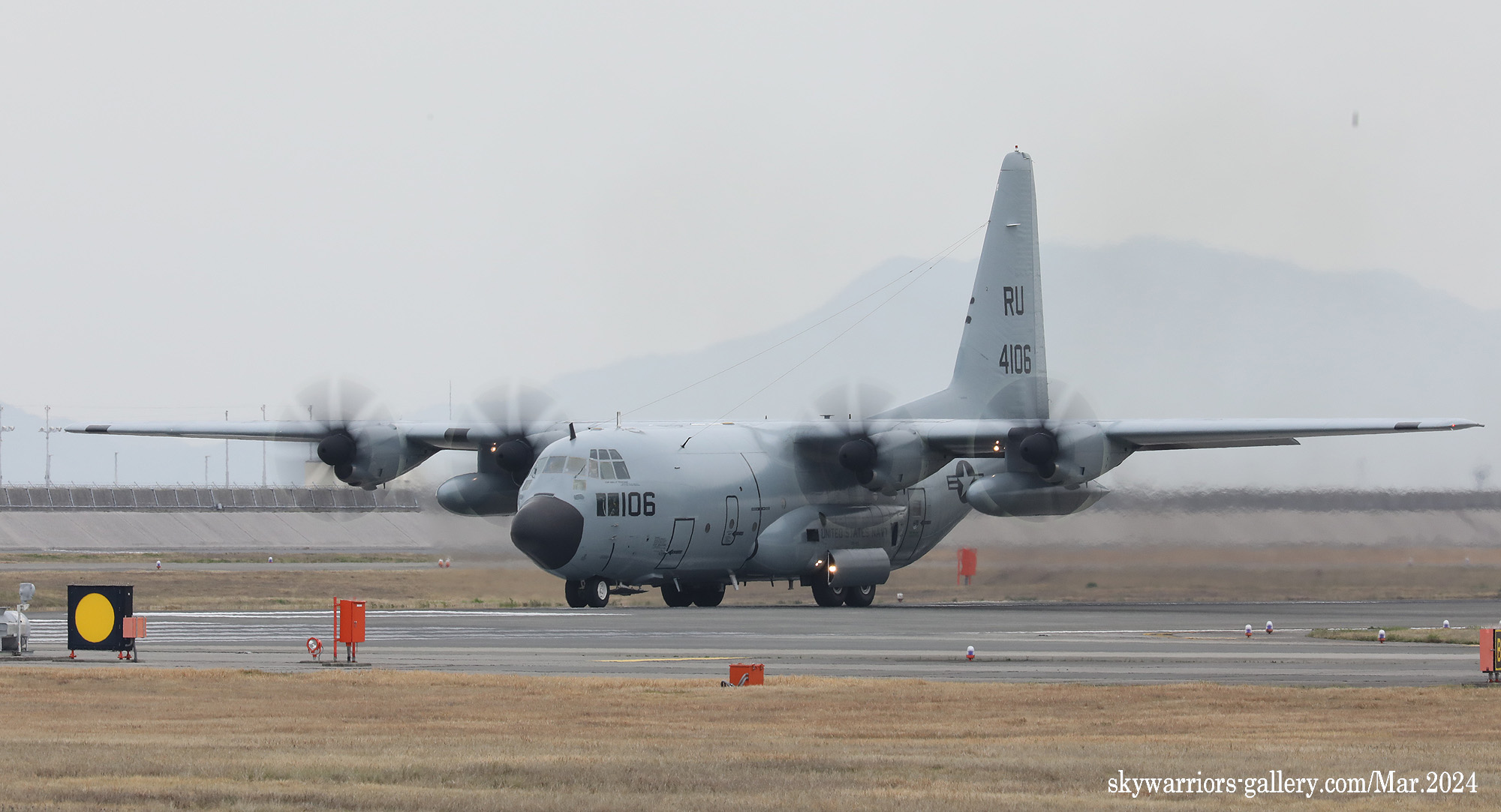 ↑ 2024年3月28日13;00過ぎに岩国基地に着陸したVR-55のKC-130T/Bu.No.164106。機体下面までオールグレーに塗られた新塗装。