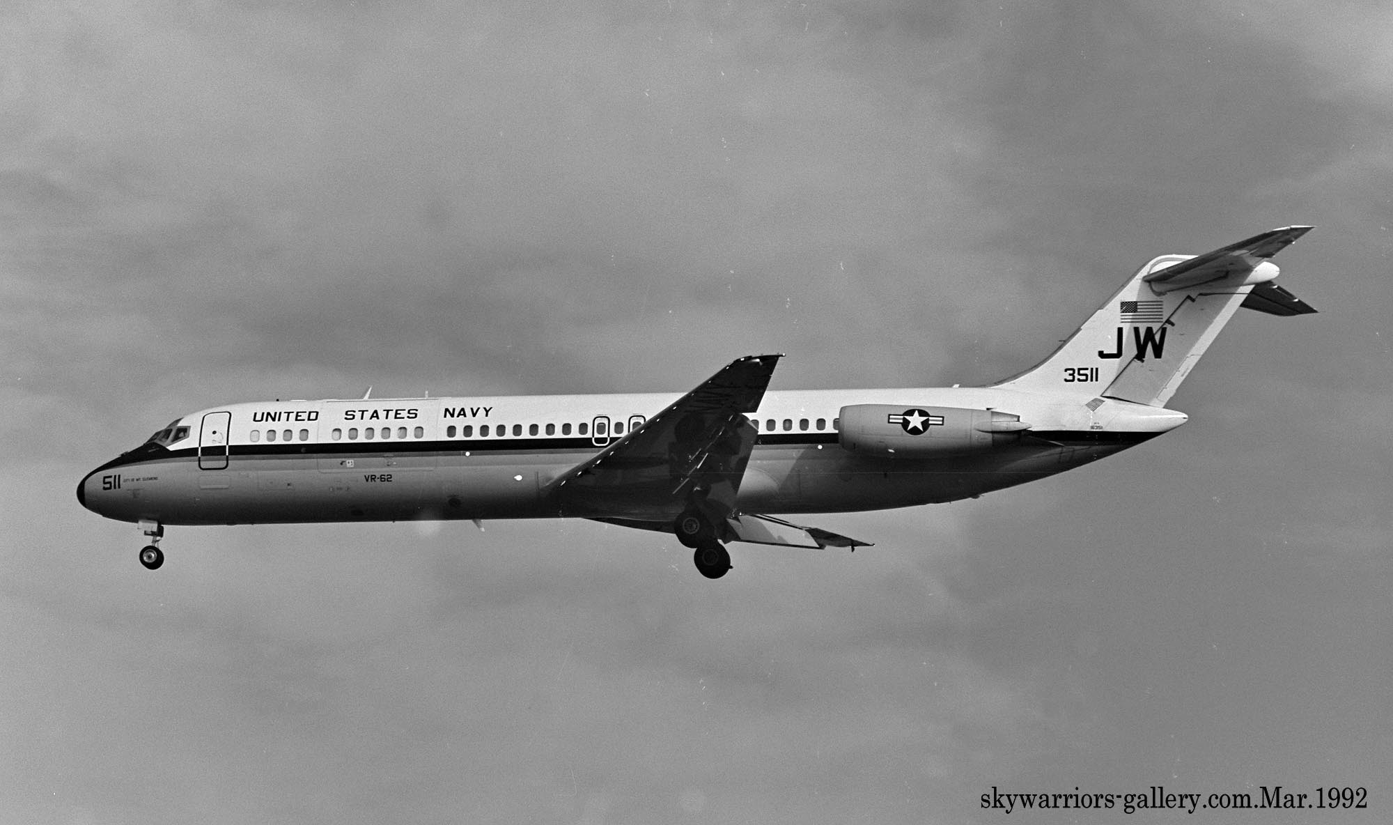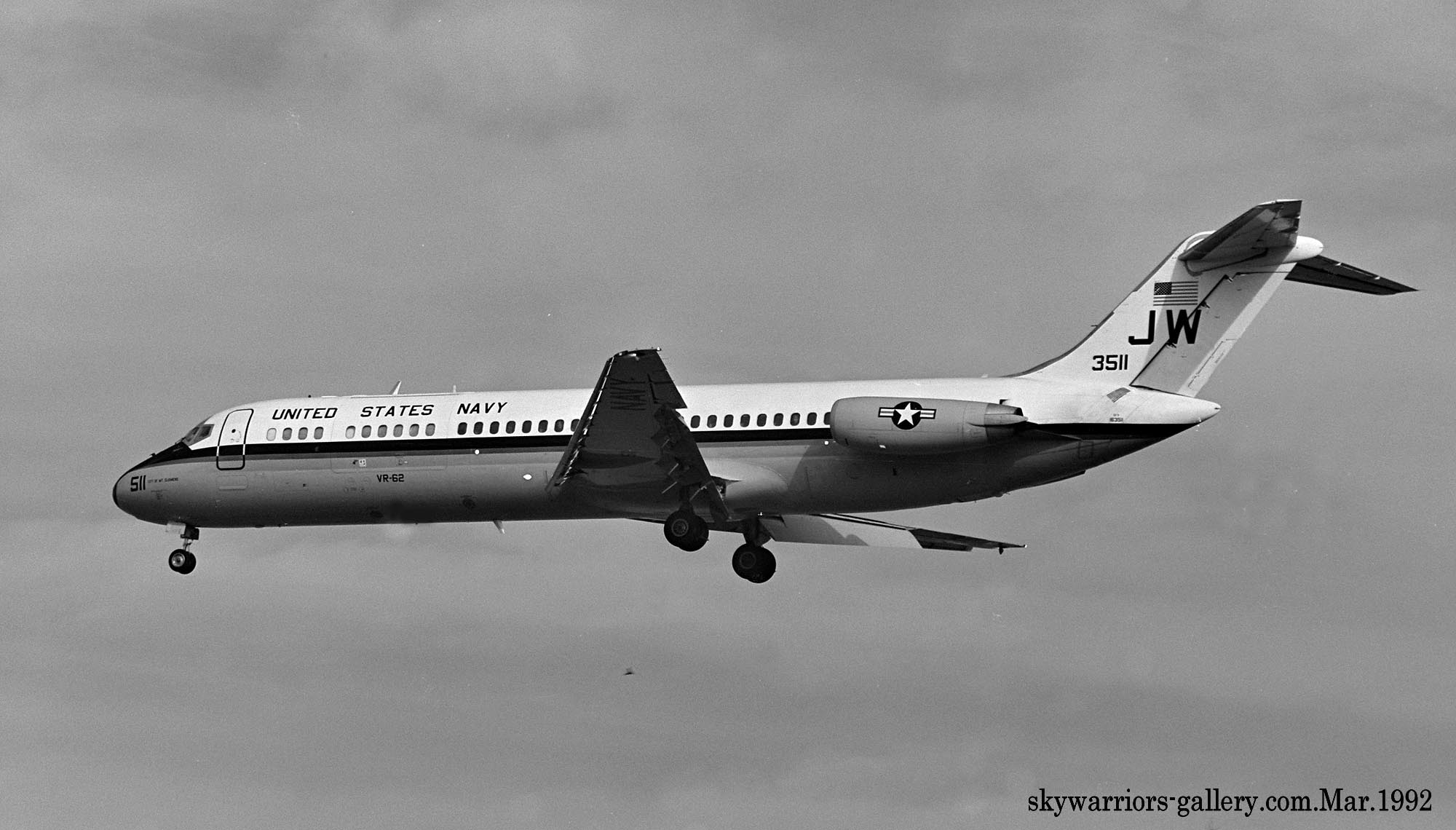 1987年 CVW-5に初めてFA-18Aが配備され まずVFA-195の初飛来があった際に厚木基地に降りたVR-62のC-9B。この当時 超がつくほど珍しい部隊だったが、FA-18Aの初飛来を目当てに厚木に来た航空ファンは、運よくこの機体を撮ることができた訳だ。隣にいた厚木のマニア君の独り言が聞こえた・・・「本来なら超ど珍機が、今日降りたんで一発でイモになった」・・・気持ちはわかります。