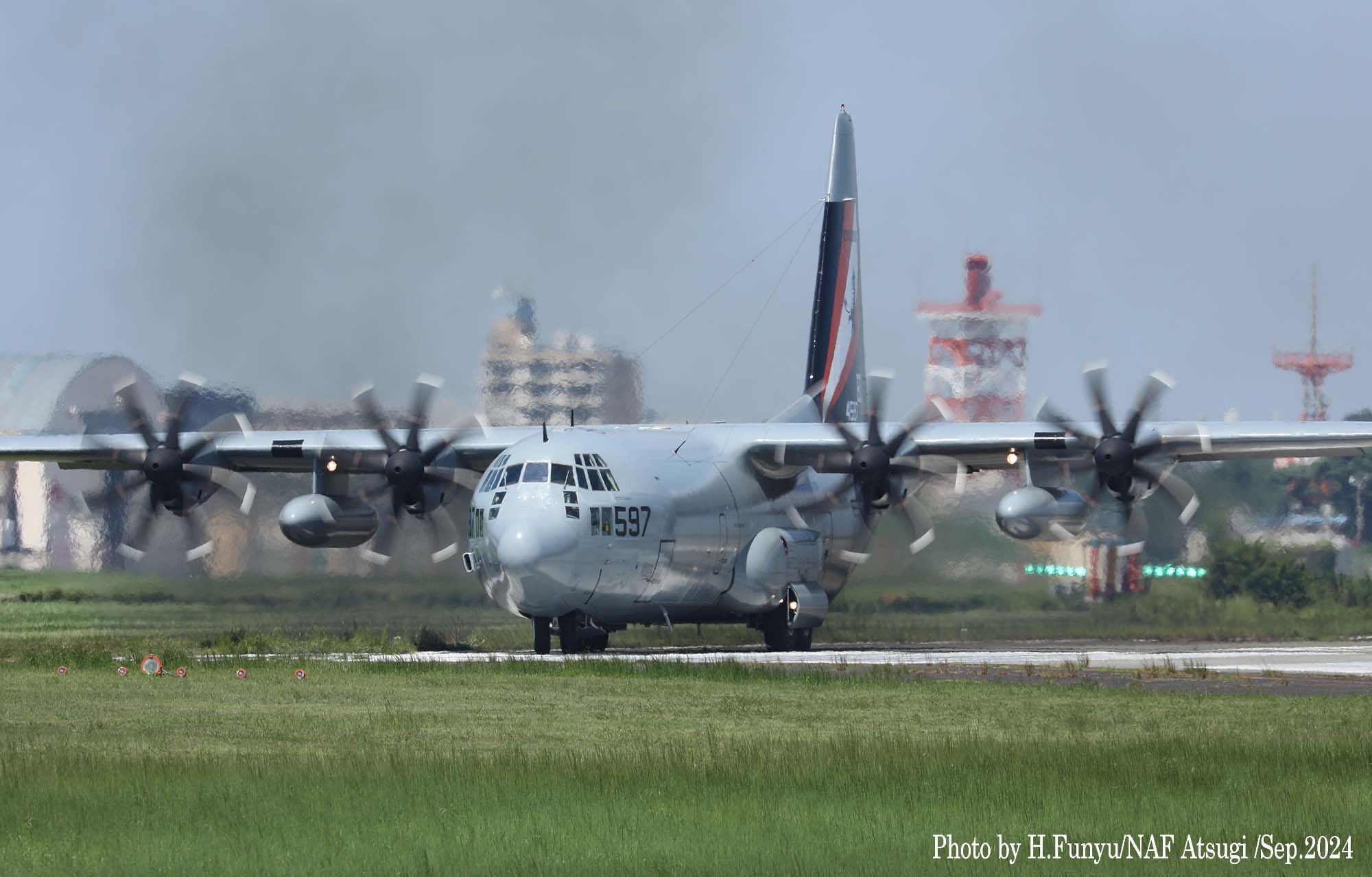 ↑ 2024年9月フニュフニュ師匠が、怪我をしていたい足を引きずりながら厚木基地で撮影したVR-64のKC-130T-30。何とカラーリングされた尾翼とストレッジした胴体をもつ貴重な撮影ターゲットである。”BD”は、元々P-3オライオン哨戒機部隊から輸送部隊に転換した飛行隊。尾翼に描かれた鳥は、鷲ではなくコンドルである。