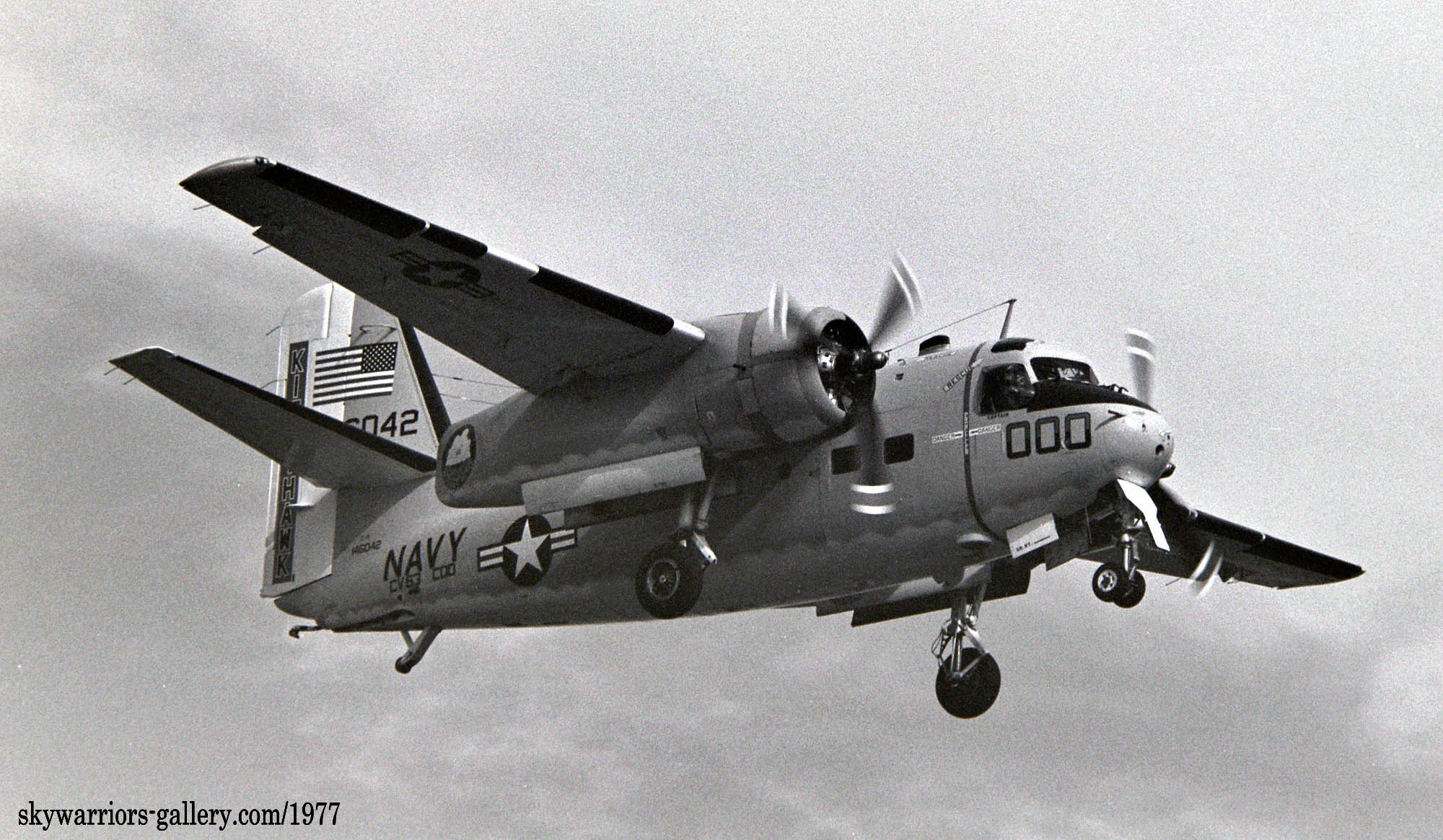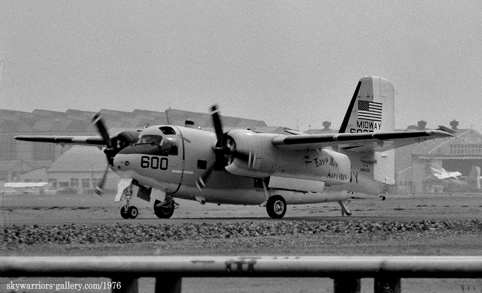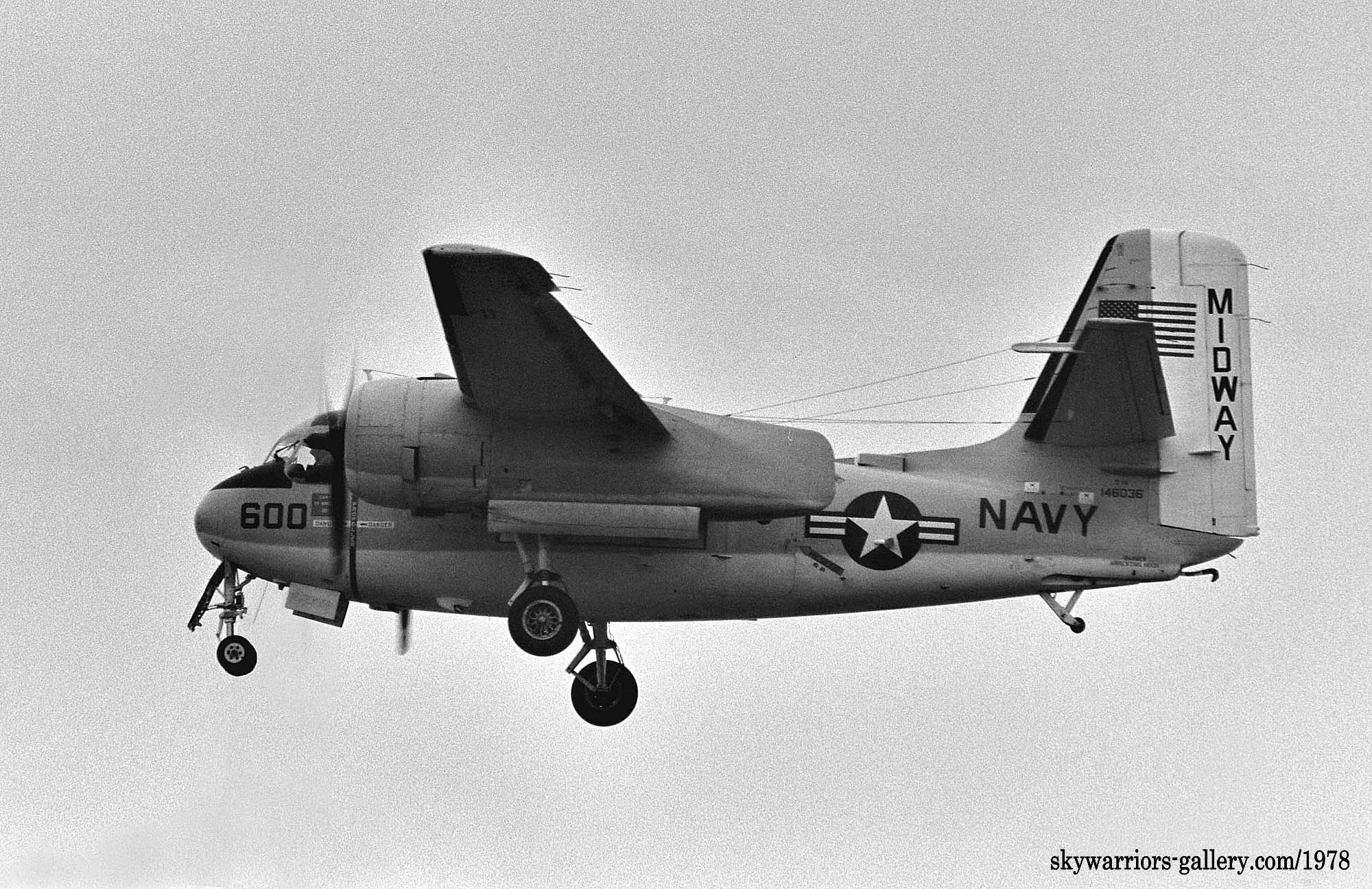 ↑ 1978年、厚木基地に着陸する空母キティ・ホークの艦載輸送機のもう1機のC-1A/Bu.No.14602。尾翼に書かれた艦名の表示が微妙に異なる。