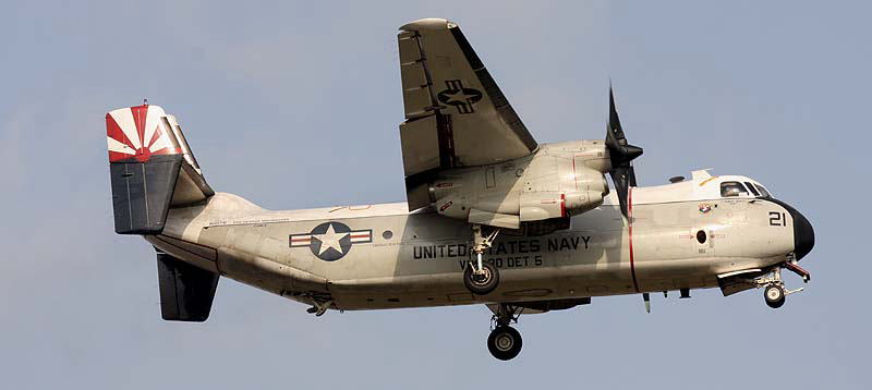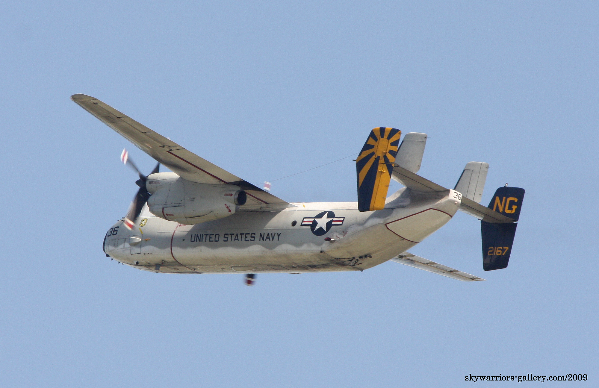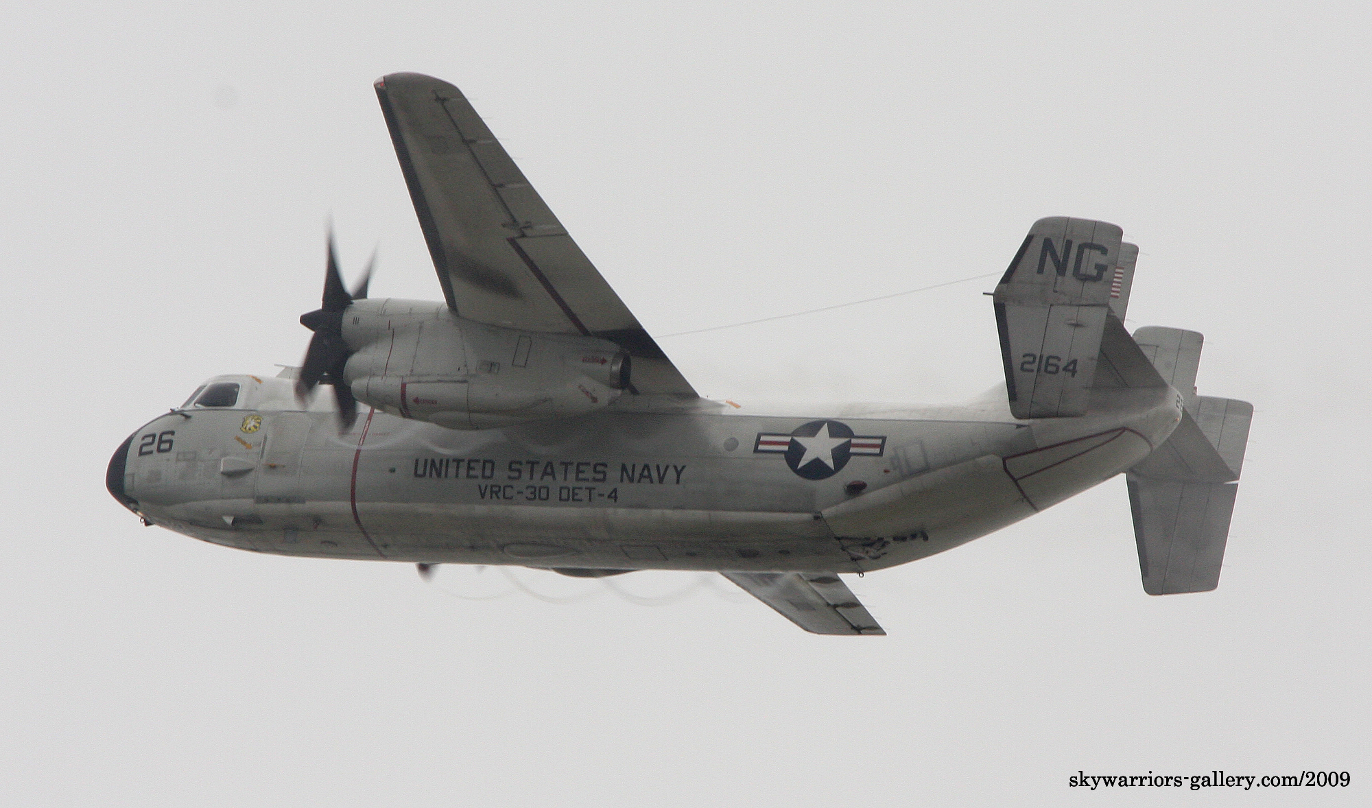 ↑ 2009年3月 嘉手納基地から離陸し空母へ向かうVRC-30 Det-4の2機のC-2A.尾翼のテールレターは、”NG”に変えられている。この時付近の海域には、原子力空母ジョン・ステニスが航行しており、CVW-9を伴っていた。