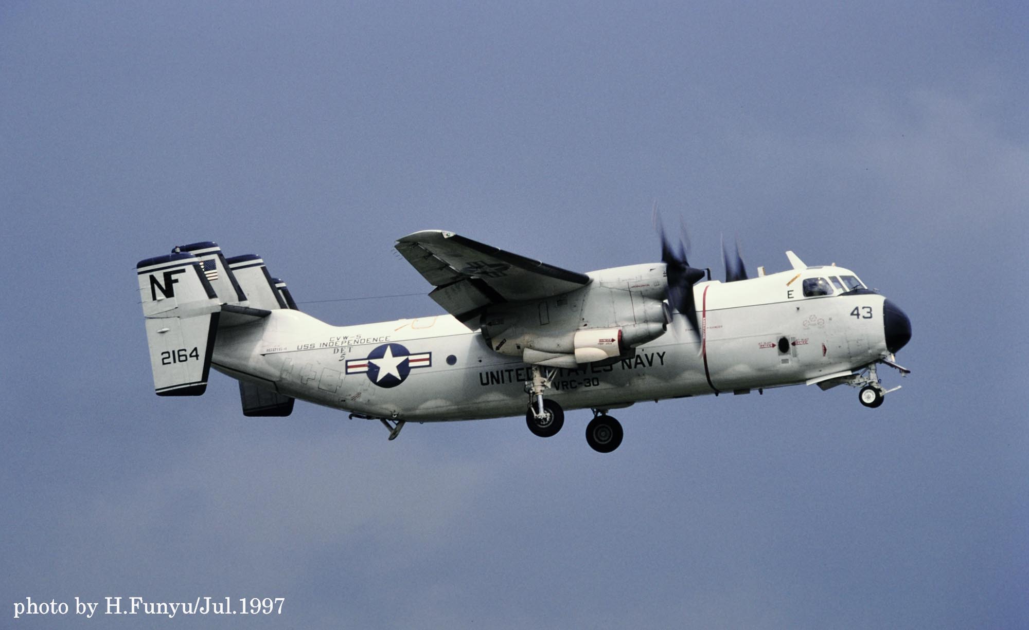 ↑ フニュウ師匠が1997年6月に厚木基地R/W-19で撮影されたVRC-30のC-2A/NF-43。胴体後部にVRC-30 Det-5と空母名USSインディペンデンスと書かれており 判り易い。