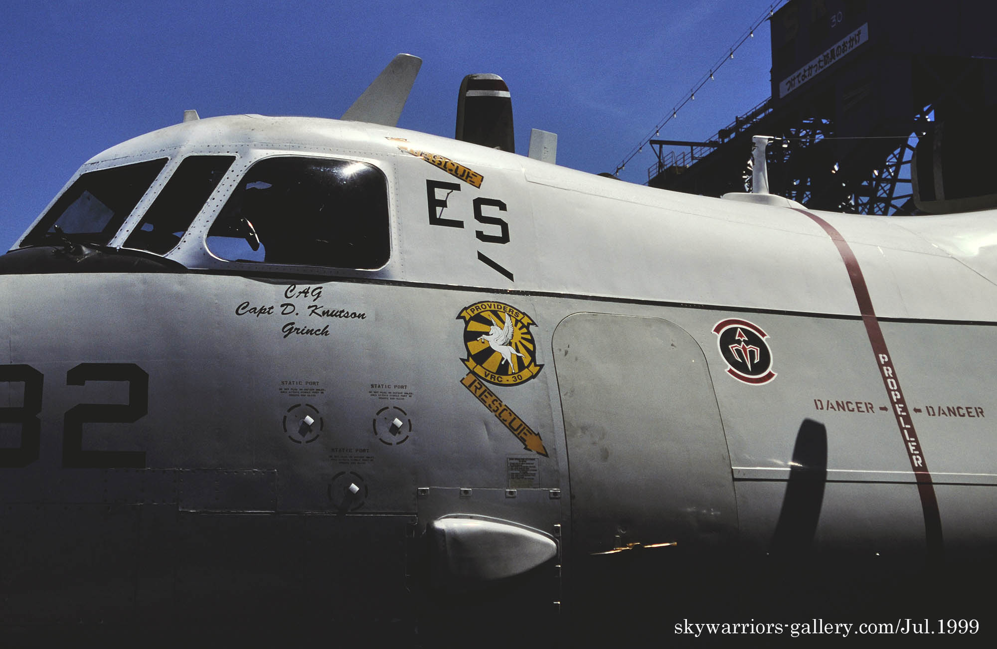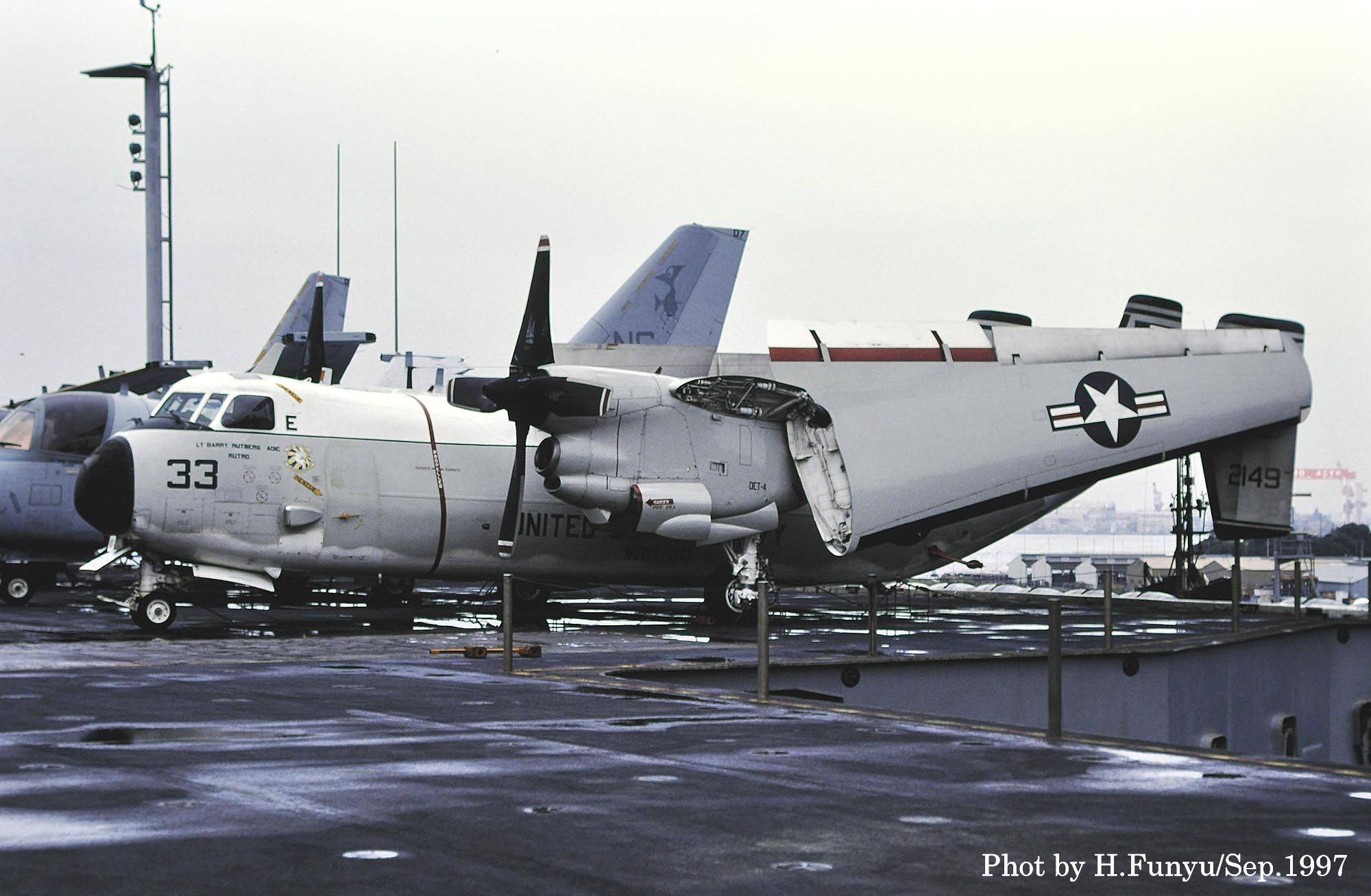 ↑ 1997年9月横須賀に寄港した原子力空母ニミッツ艦上にて、フニュ師匠が撮影したVRC-30のC-2A/Bu.No.162149。尾翼が隠れて確認できないが、”1枚上の写真と同様にのマーキングで、恐らくNG”のレターが入っていたのかもしれない。