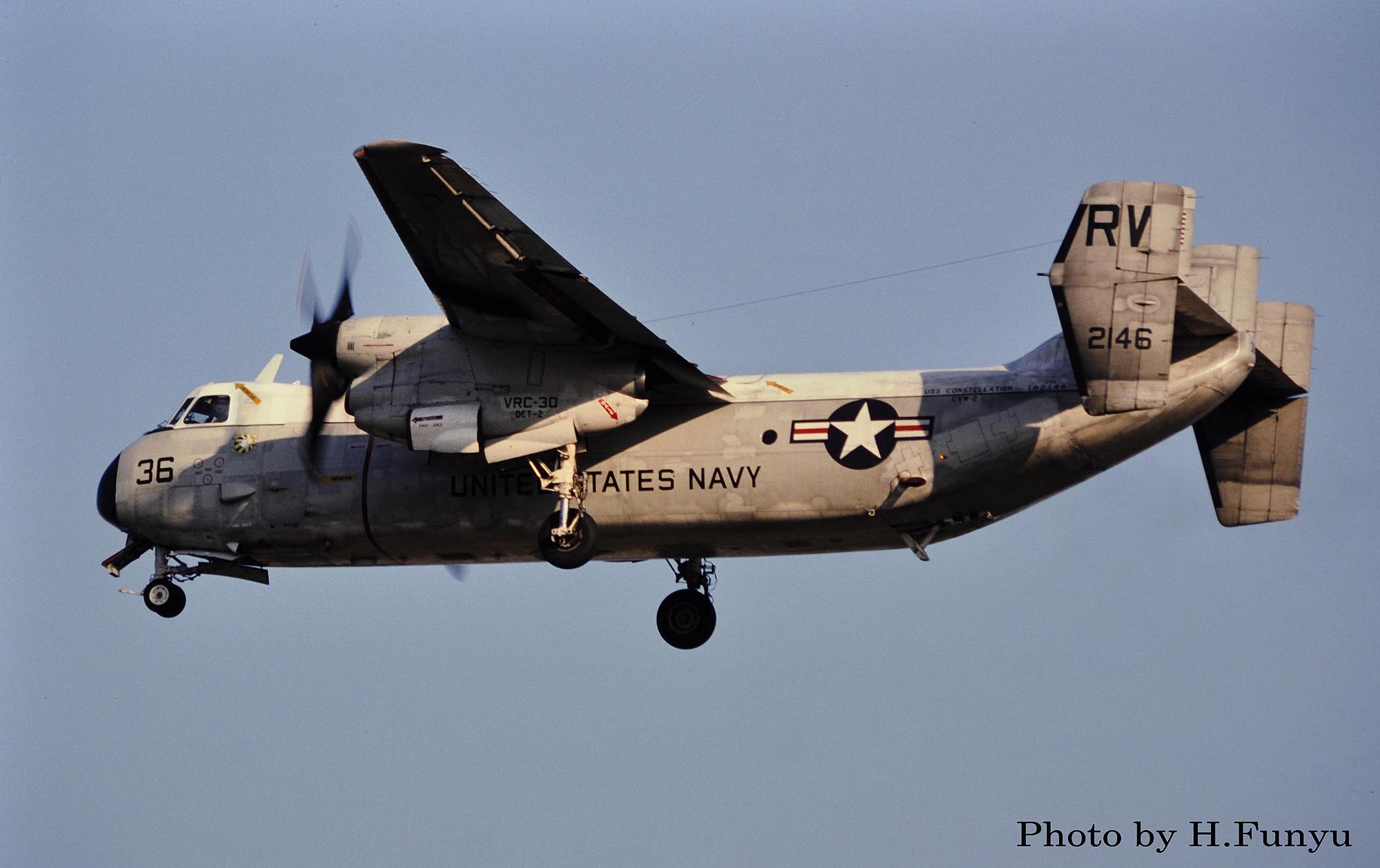 ↑ 撮影日不詳ながら、恐らくフニュウ師匠が1980年代後半に厚木基地R/W-01で撮影されたVRC-30のC-2A/RW-36。ラダーの交換かペイントの塗り直しかで”W”の文字が無いが、機首のインシグニアからVRC-30と判る。