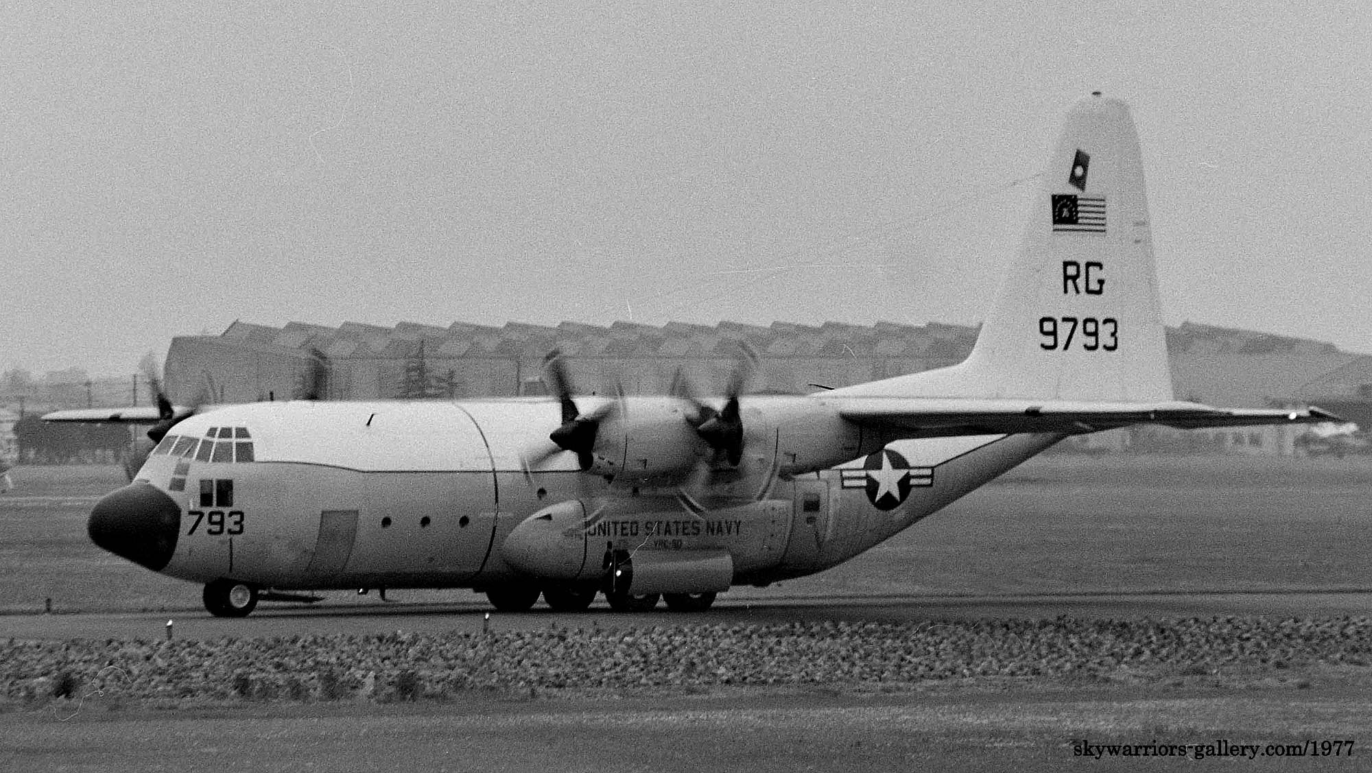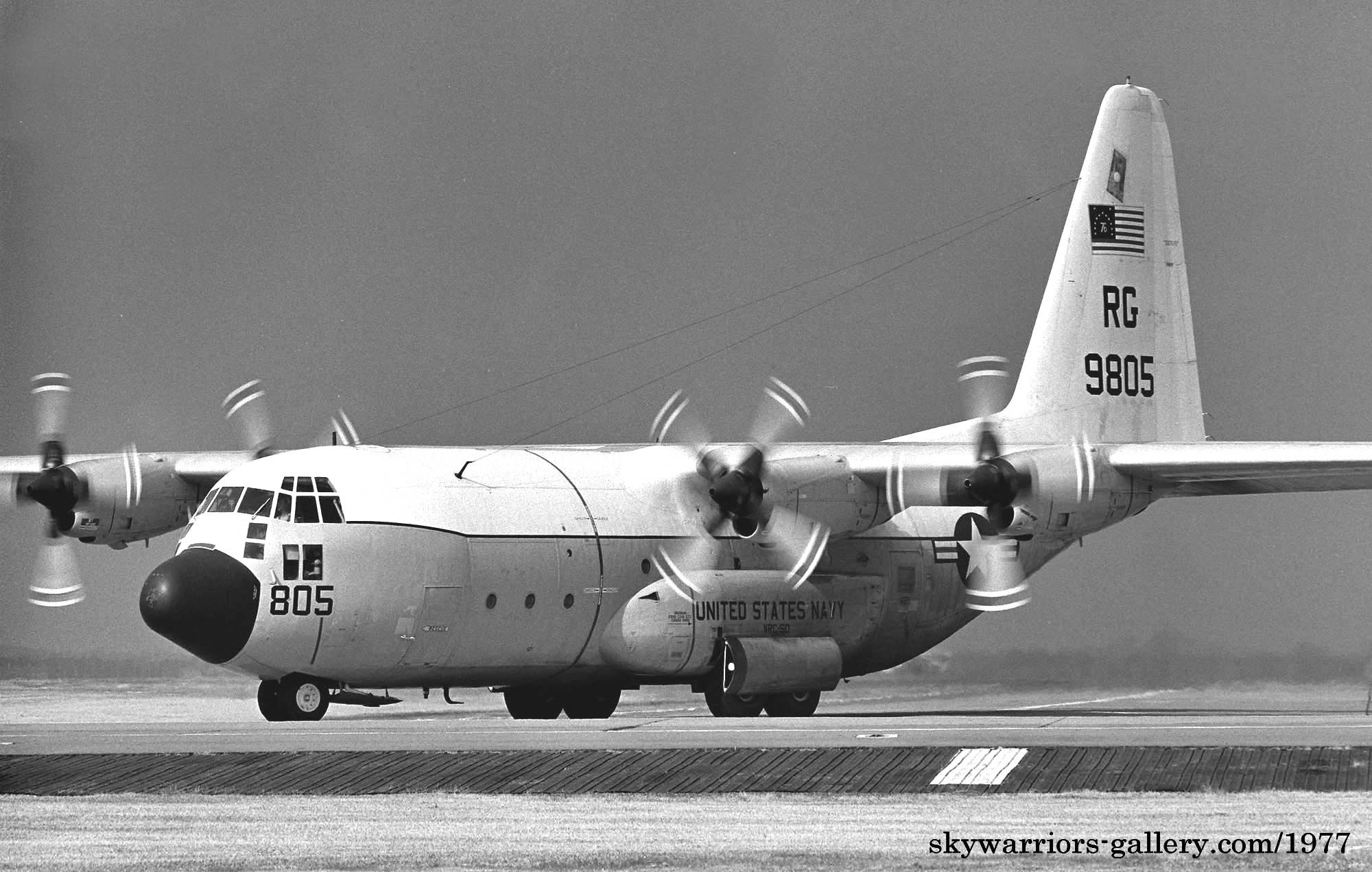 ↑ 上2枚の写真は何れも1977年に厚木基地と横田基地におけるVRC-50/C-130Fのタキシングの模様であるが、尾翼の星条旗は1976年に施したアメリカ建国200周年の記念塗装を残している。