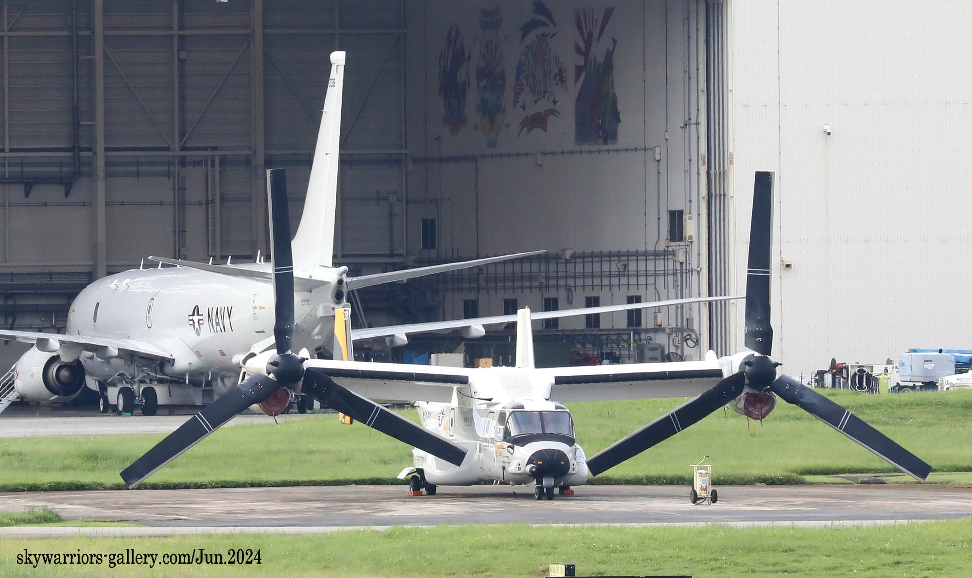 ↑ VP-4のP-8Aをバックに未だ駐機のままのオスプレーを見た。3月以来NAVYエリアで長い間全く動く事の無かったVRM-30 Det-1のCMV-22B。