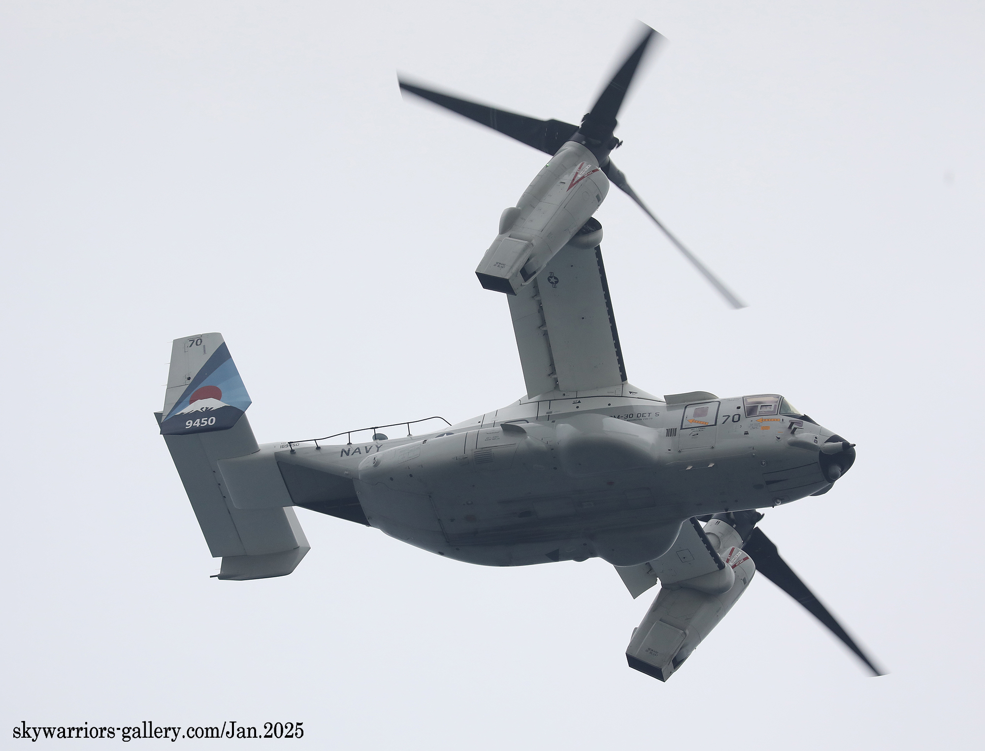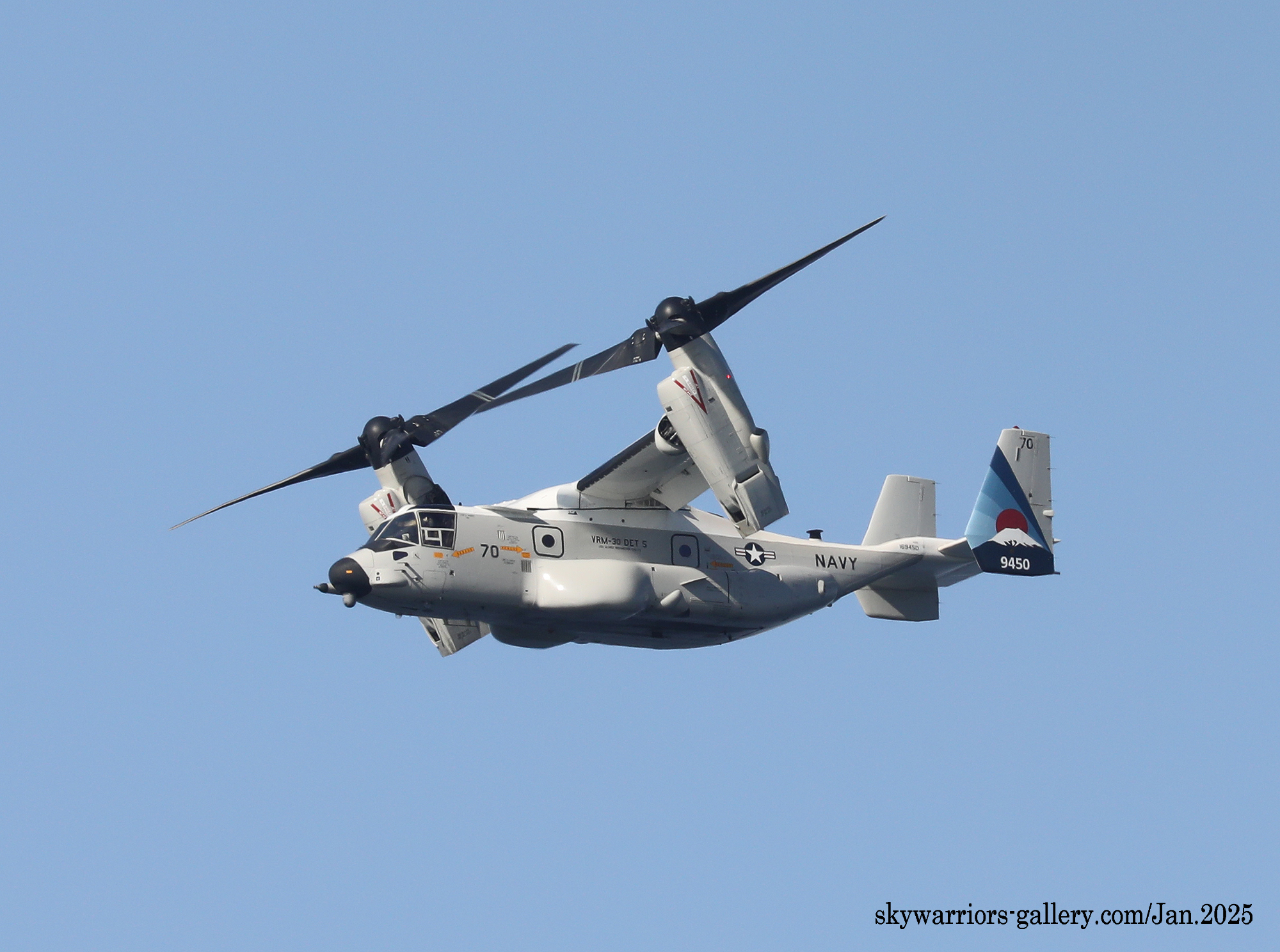 ↑ 2025年1月某日 普天間基地を離陸して沖縄本島北部へ訓練飛行に向かい再び普天間に帰還するVRM-30 Det-5のCMV-22B/Modex-70。2024年夏頃からアメリカ本国で発信されたSNSで見かけるようになった富士山の絵柄を描いたオスプレイ、日本と関係があるとは想像したが、岩国配備となるDet-5の塗装とは知らなかった。Det-5全機この塗装らしいので、今後は外来機との区別が付き易いが、Det(分遣隊)毎にマーキングが違うとなれば、面白い展開である。