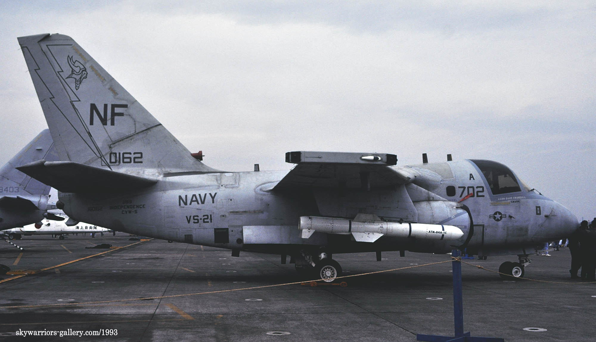 ↑ 1993年厚木基地航空祭Wing-93で展示されたS-3B NF-702 冷戦終了後ソ連の潜水艦隊が脆弱化して、対潜任務以外にシーコントロール任務が追加され、ハープーン対艦ミサイルも携行するようになった。