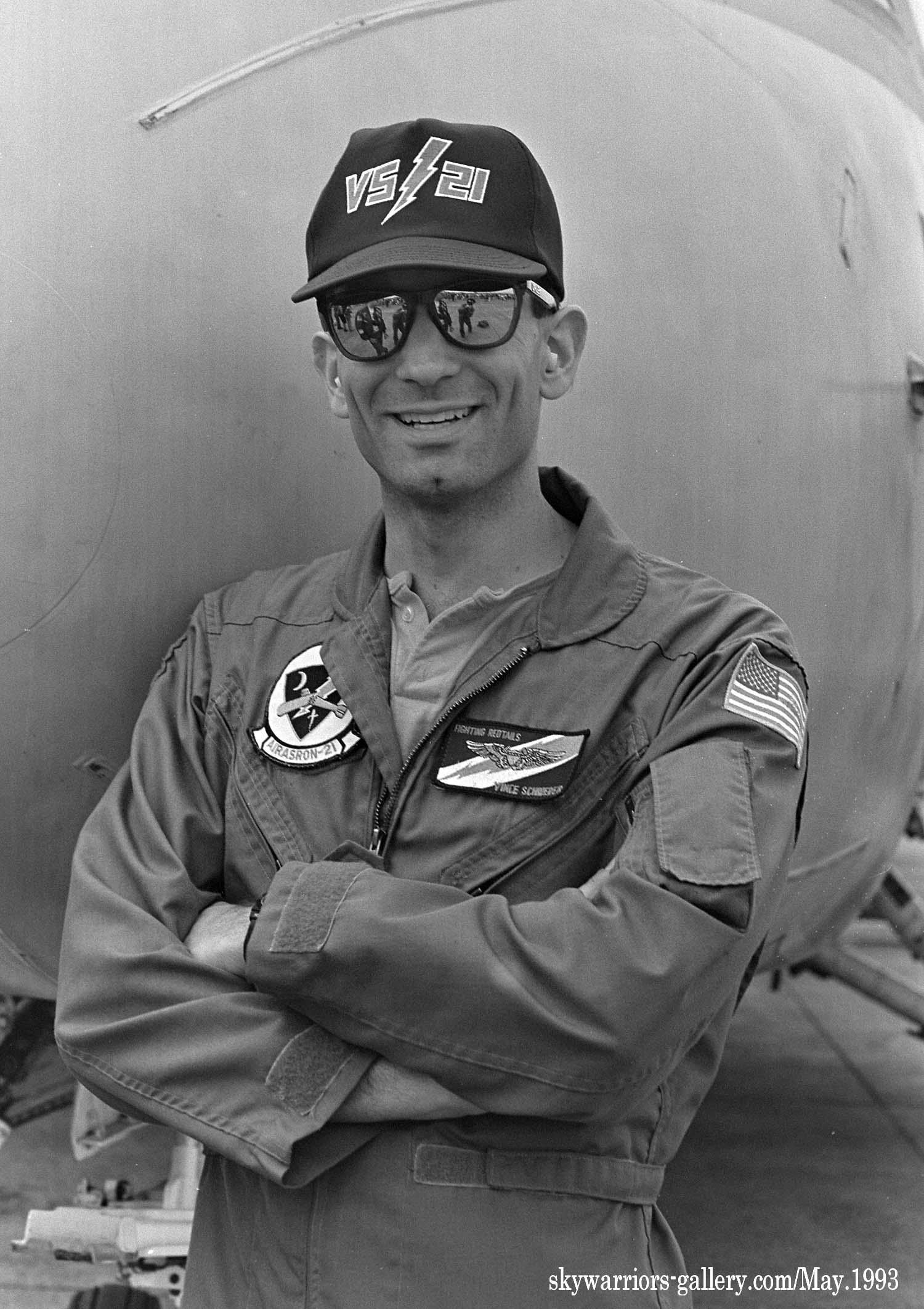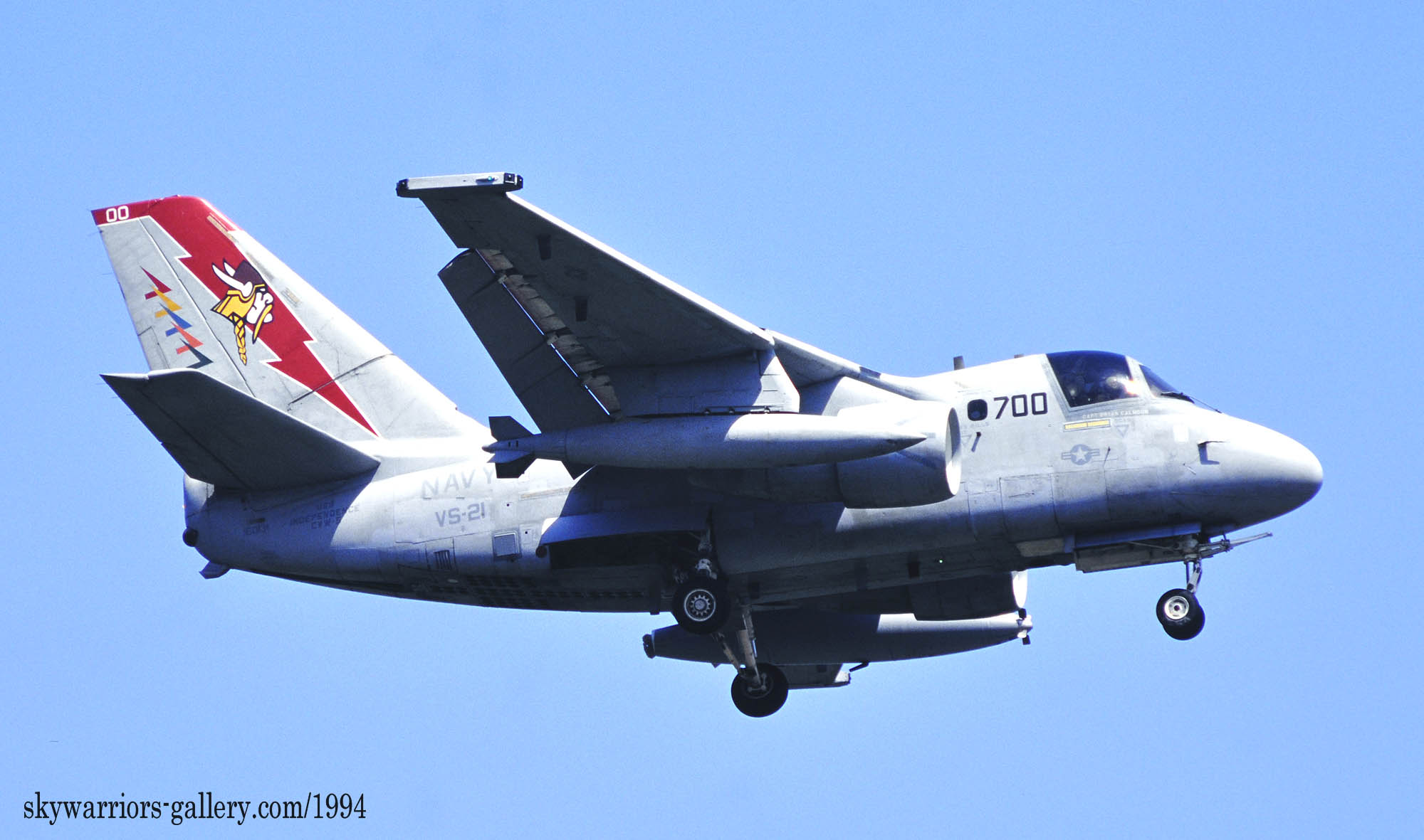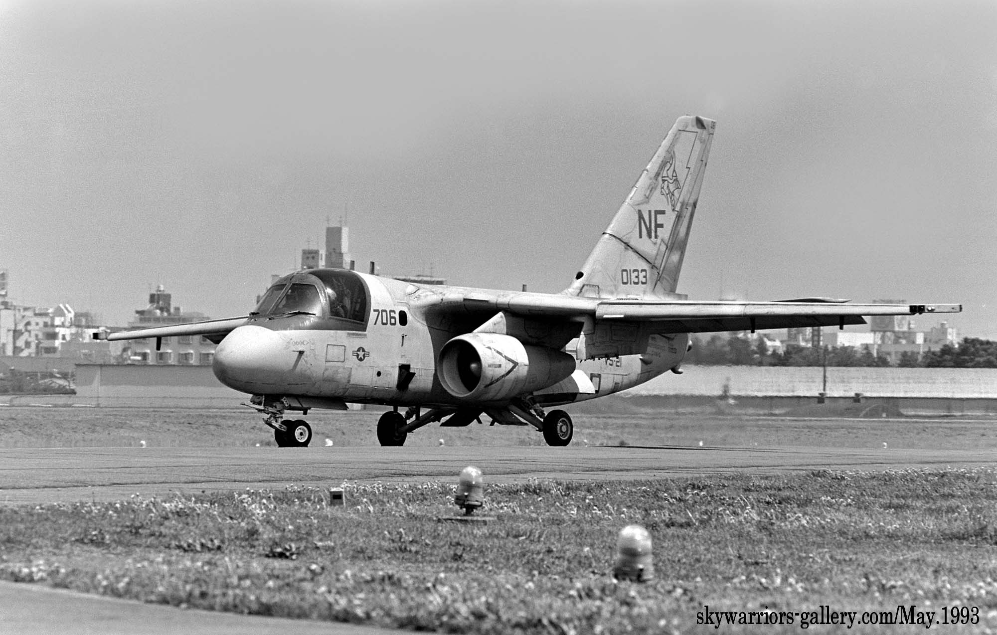 ↑ 1994年 遂に現れた尾翼に鮮やかな赤い電光が復活したS-2B/NF-700、しかもCVW-5の各飛行隊カラーもシェブロンでラダーに書き込まれた。素晴らしい・・・・