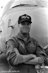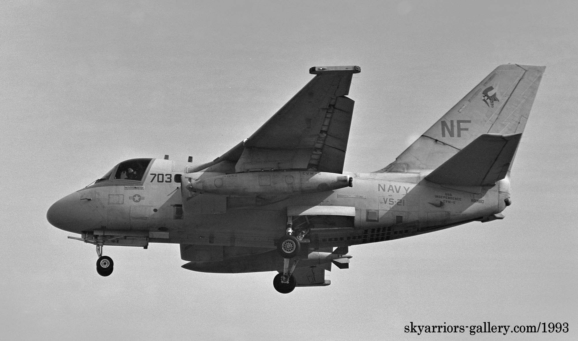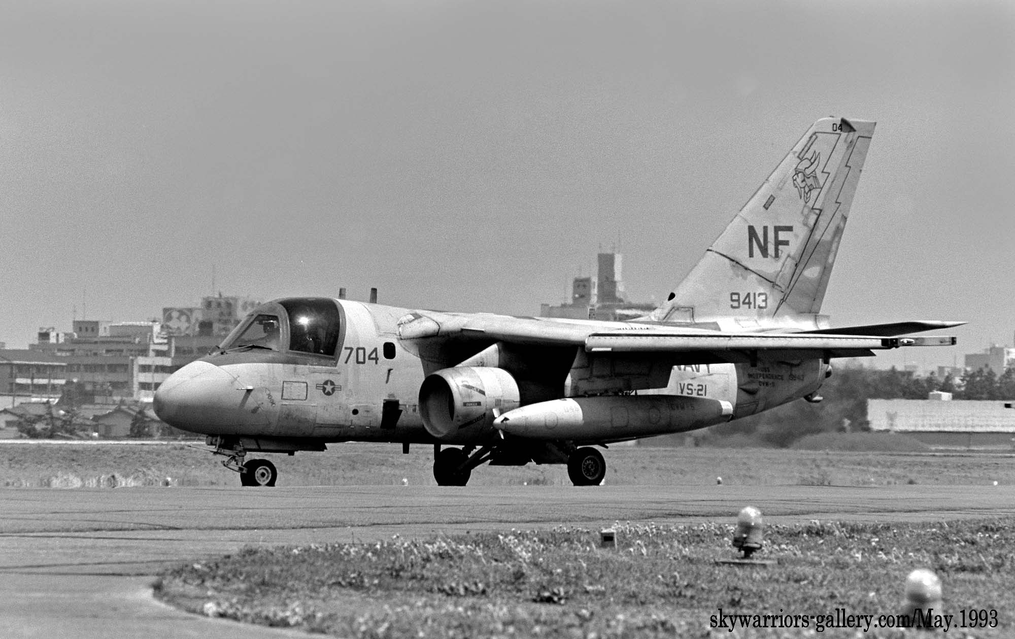 ↑ 1993年の春先に厚木基地で飛行訓練をするVS-21のS-3B。この機体の尾翼のバイキングマークは他の機体と違ったデザインであった。