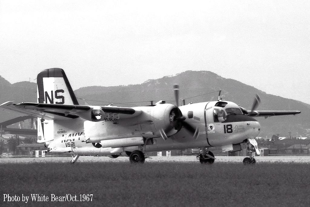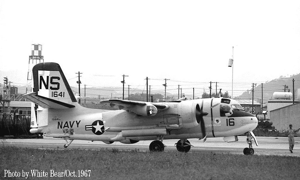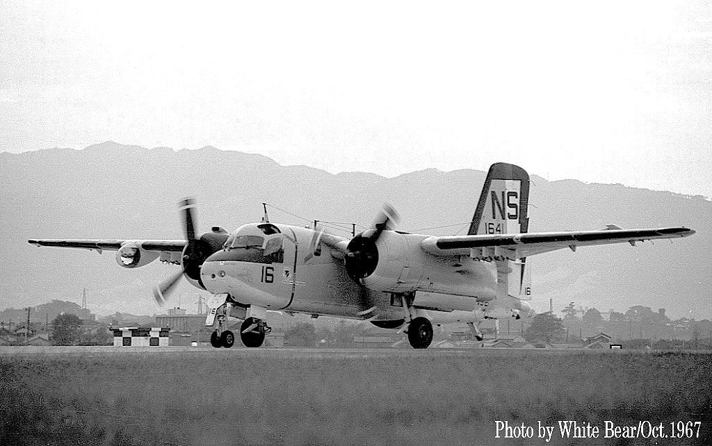 ↑ 1967年10月 White Bearさんが伊丹飛行場で撮影されたVs-21のS-2E/NS-16。White Bearさん曰く、当時は情報が全くなく、運だけが頼りだったが、この日運よく夕方近くになって突然2機のS-2Eが飛来したとの事。何故 2機での飛来かと言えば、1機が整備目的で飛来する場合、もう1機が整備対象の機体の乗員を回収して母艦に帰る為である。着陸後、1機は整備に入り、他の1機は乗員を乗せて対潜空母などに戻って行った。