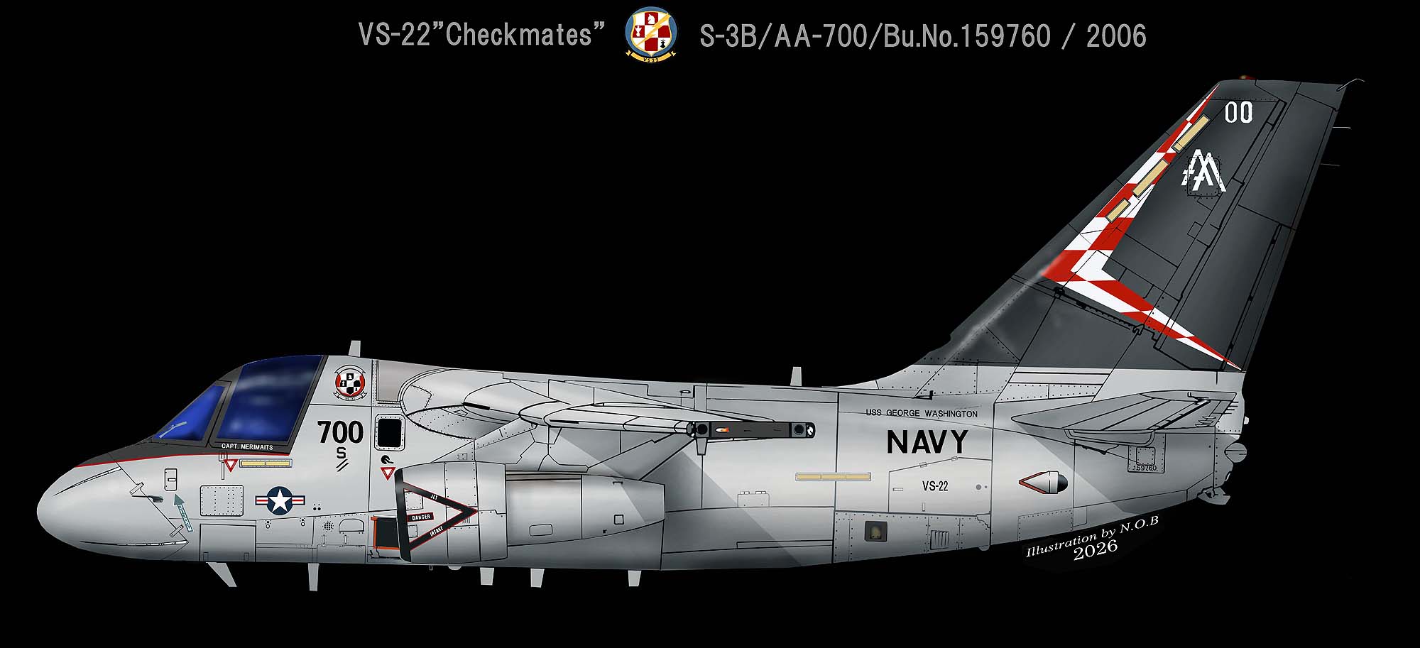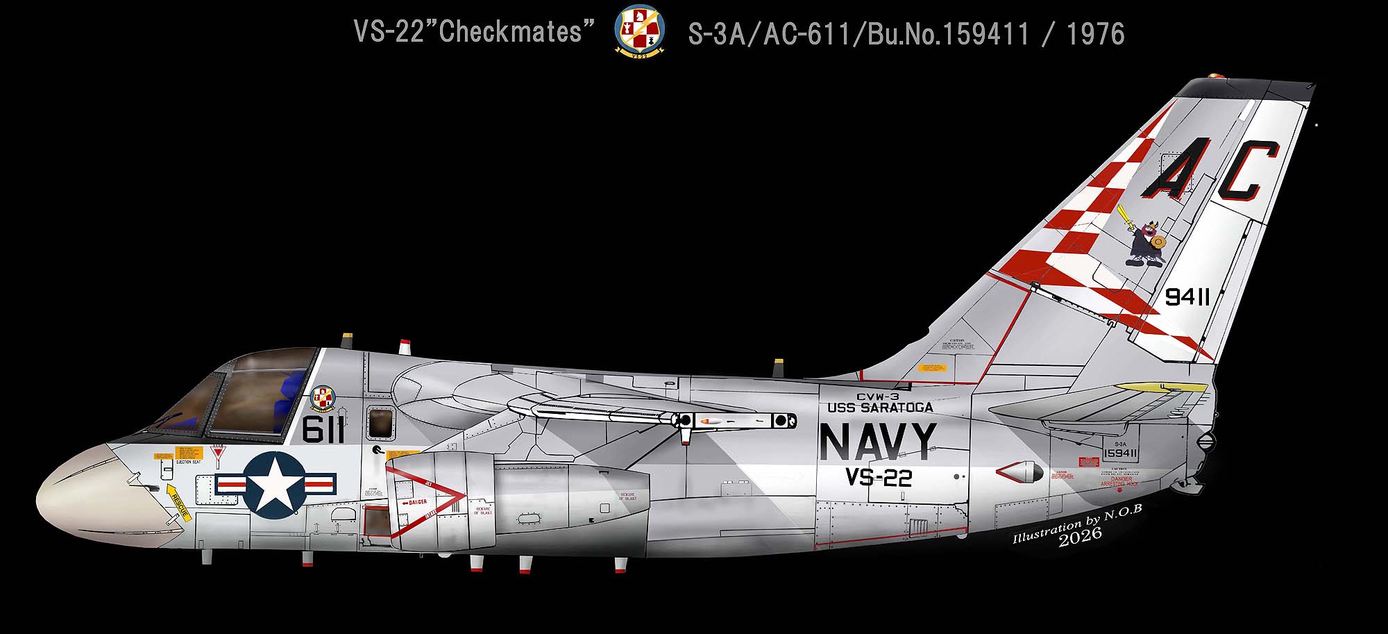 VS-22の起源となる飛行隊は諸説があるようだが、1945年にNASブラウンズウィックで雷撃隊として創設された部隊が、後にノーフォーク海軍基地で対潜飛行隊VS-22に生まれ変わったものと言う説と1960年にNASロードアイランドで創設されたVS-22が起源だと言う説である。両飛行隊共にチェックメイツというニックネイムを持っていた。まぁどちらが起源でもよいのであるが、S-3Aを運用したVS-22は、大西洋方面で初のS-3バイキング飛行隊として1974年からジェット化を進めてきた飛行隊である。最初に空母USSサラトガで運用され、1980年までの間4度の航海に出ている。1980年に空母サラトガが長期ドック入りした際に、CVW-3と共にUSSジョン・F・ケネディーに搭載され、この後にS-3Bに機種転換も行った。空母ジョン・F・ケネディでは7回も航海に出ており、特に1990年~1991のイラク戦争関連では300回以上の出撃を行っている。2000年以降はUSSトルーマンに載ってイラク解放作戦等に参加、この時には1100回以上の任務を御成したと言われる。部隊として最後に搭載されたのは、空母ジョージ・ワシントンでCVW-17に属し"AA"のテールコードを付けている。S-3Bを最後まで運用した飛行隊として2009年1月29日に解散した。(2026年2月 記)