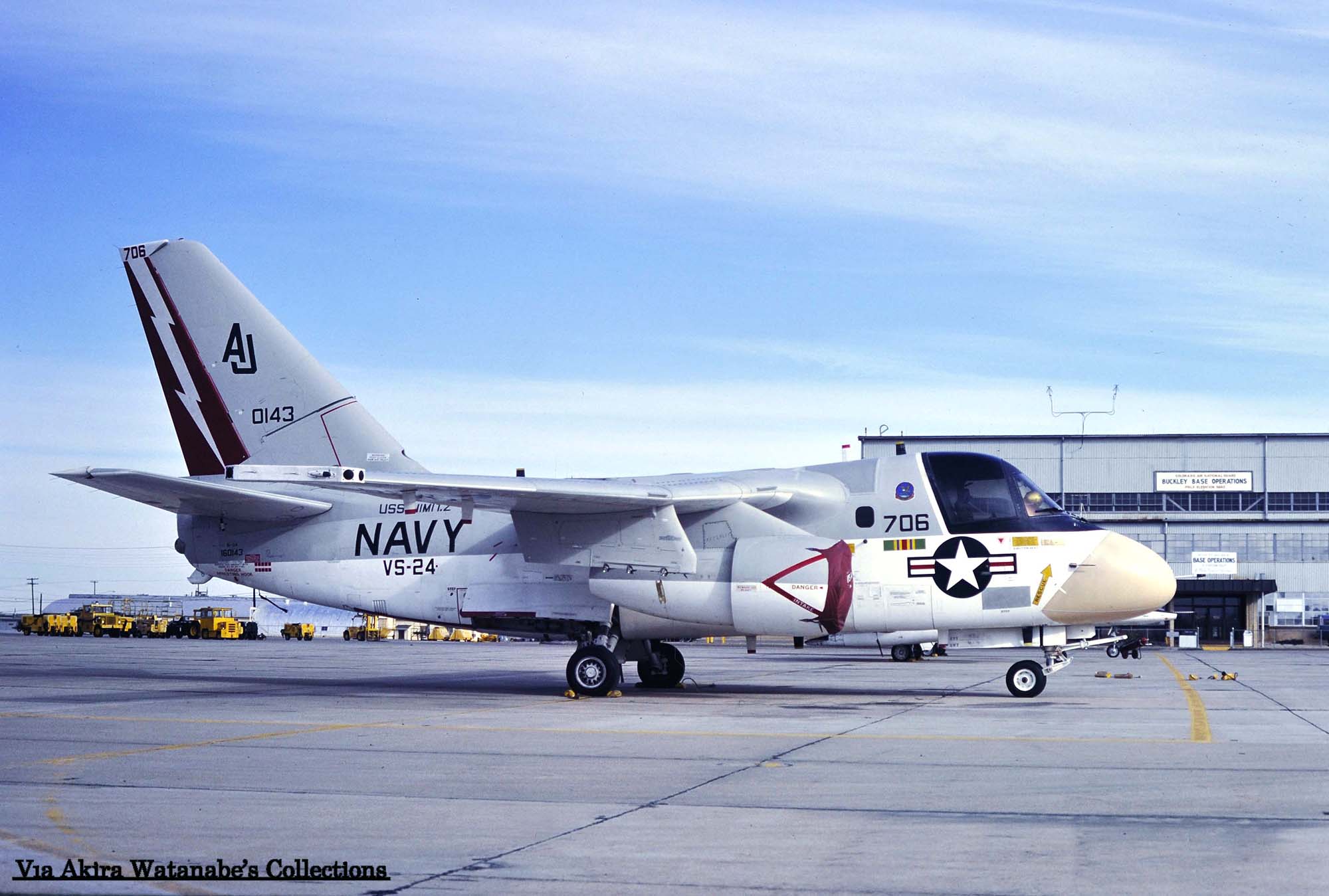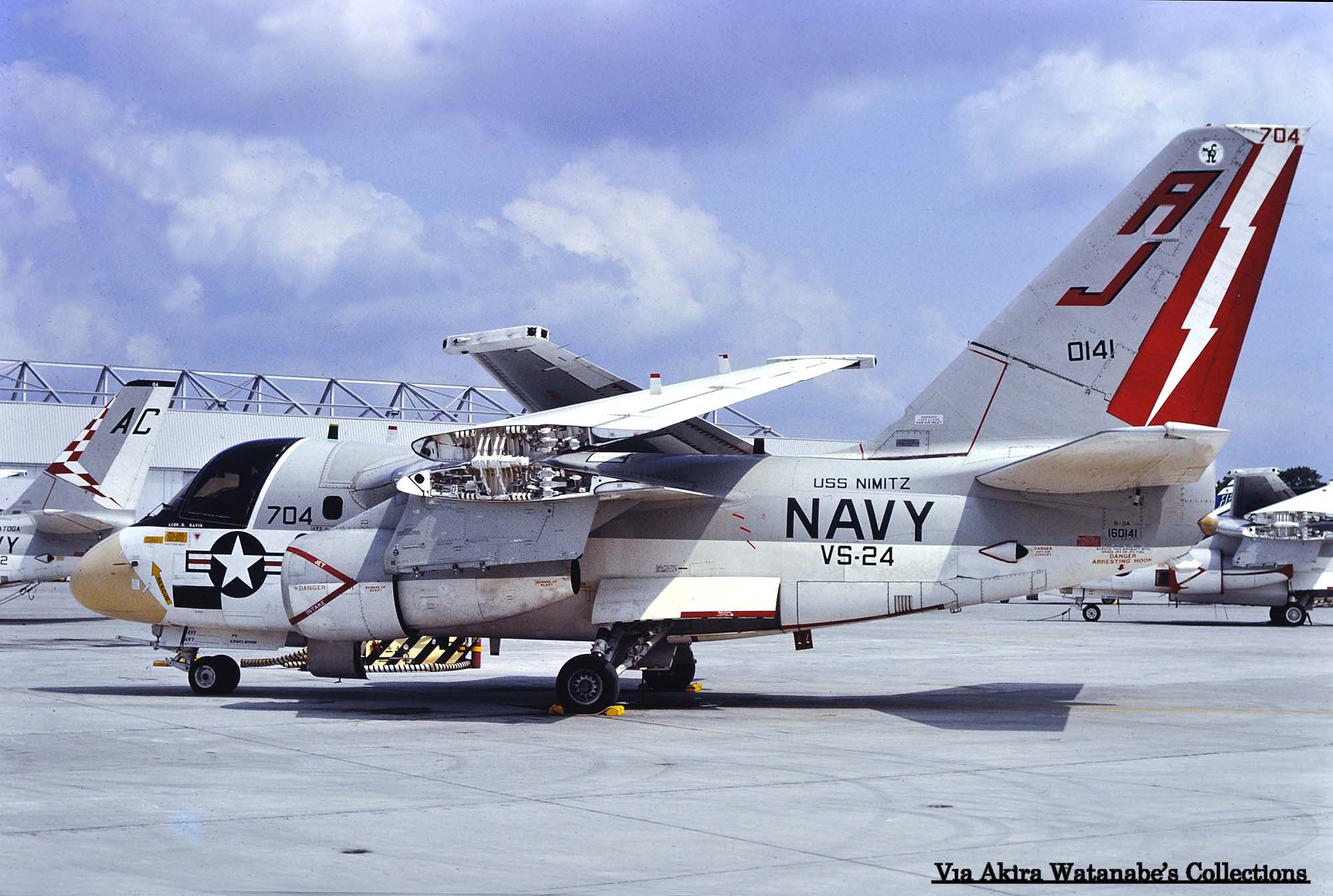 ↑ 1976年10月に撮影されたVS-24のS-3A/AJ-702。VS-24は1976年にS-3Aバイキングを装備して、最初は空母USSフォレスタルのCVW-17(AA)に配属予定だったので"AA"のテールレターを書き込んでいたが、空母フォレスタルにはVS-30が宛がわれたため、当時最新鋭の原子力空母USSニミッツへの搭載になった。最初の航海は1977年11月から8か月の長期航海となり、主に地中海方面での哨戒任務にあたっている。