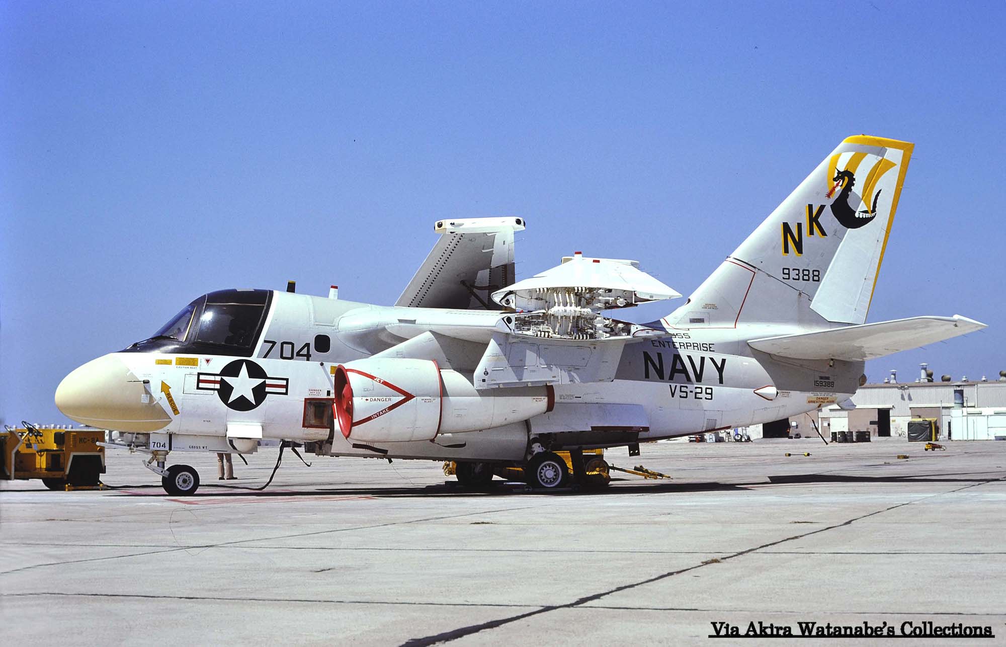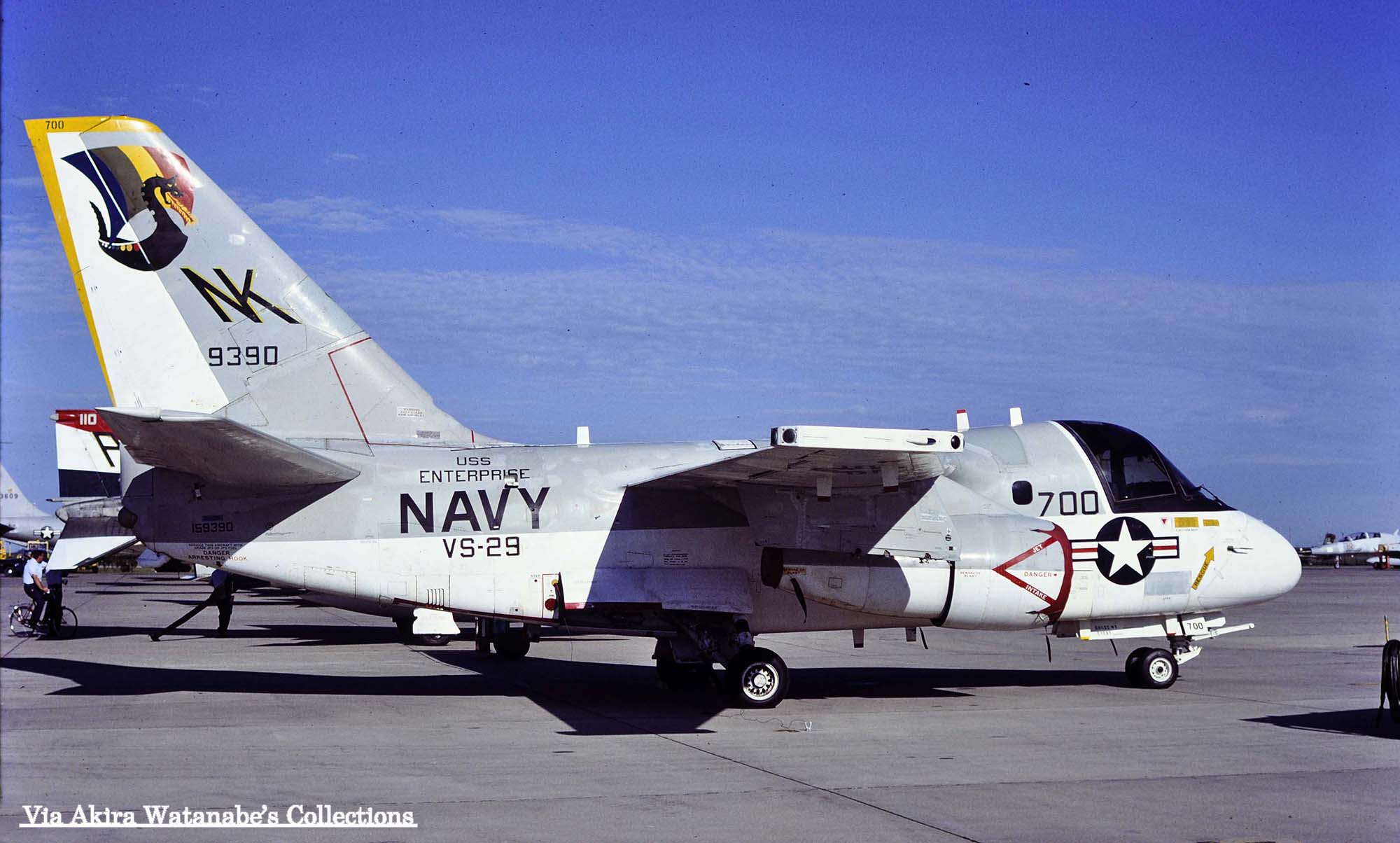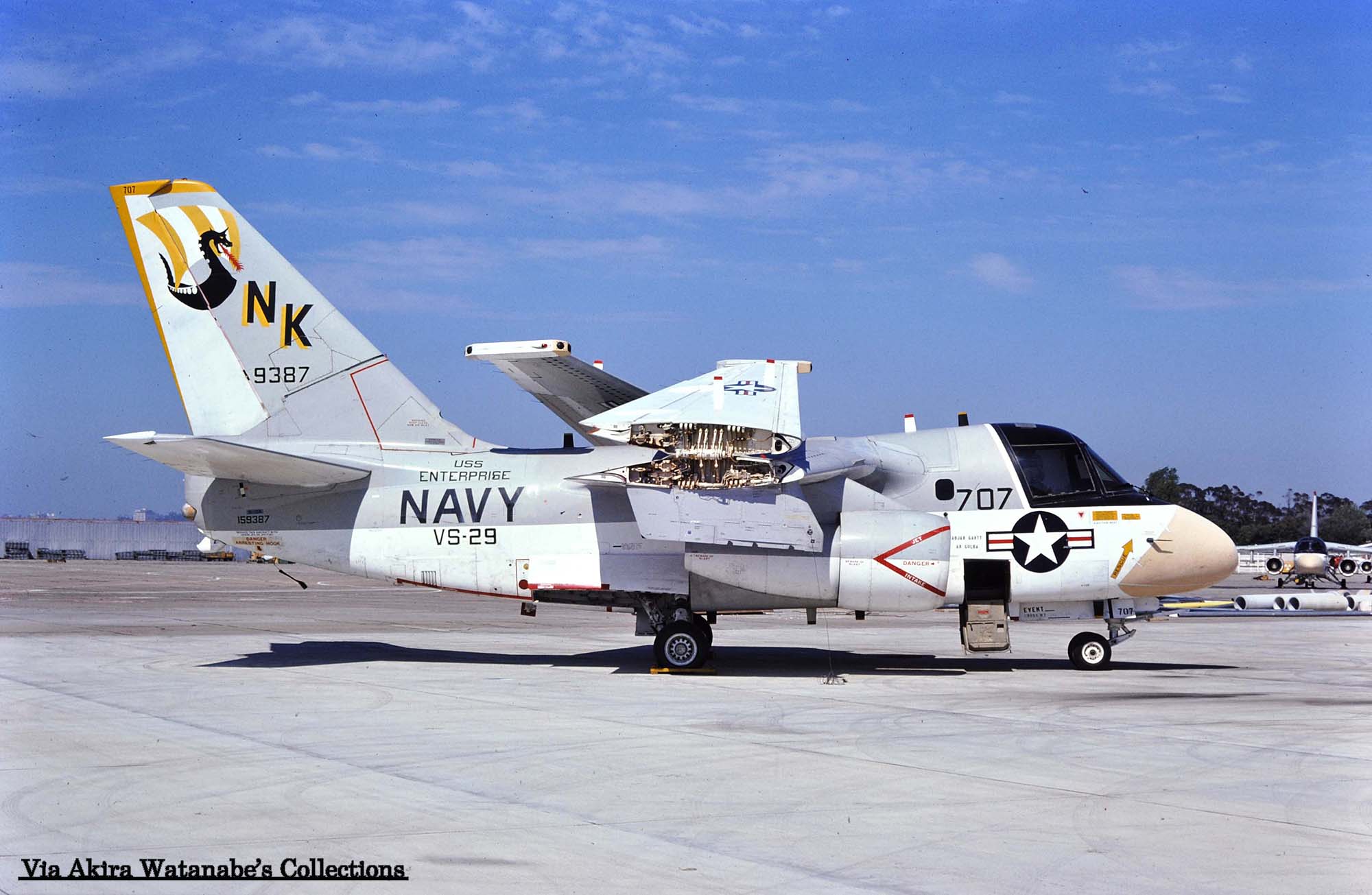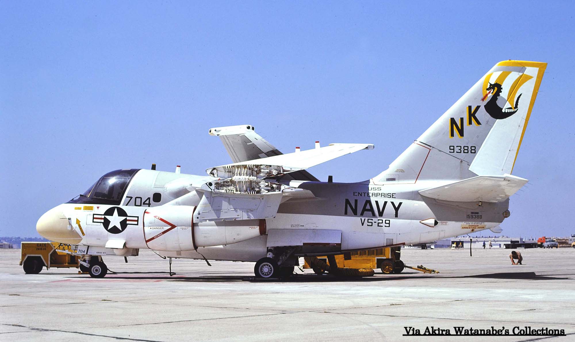 ↓ 太平洋方面では、初の艦載対潜哨戒機飛行隊の実戦部隊として、原子力空母USSエンタープライズに搭載されたVS-29のS-3A。尾翼のマークは、13世紀の北欧民族が使ったドラゴン船をモデルにデザインされたもので、CAG指定機以外は、白と黄の縞模様である。S-3A/NK-700/Bu.No.159390