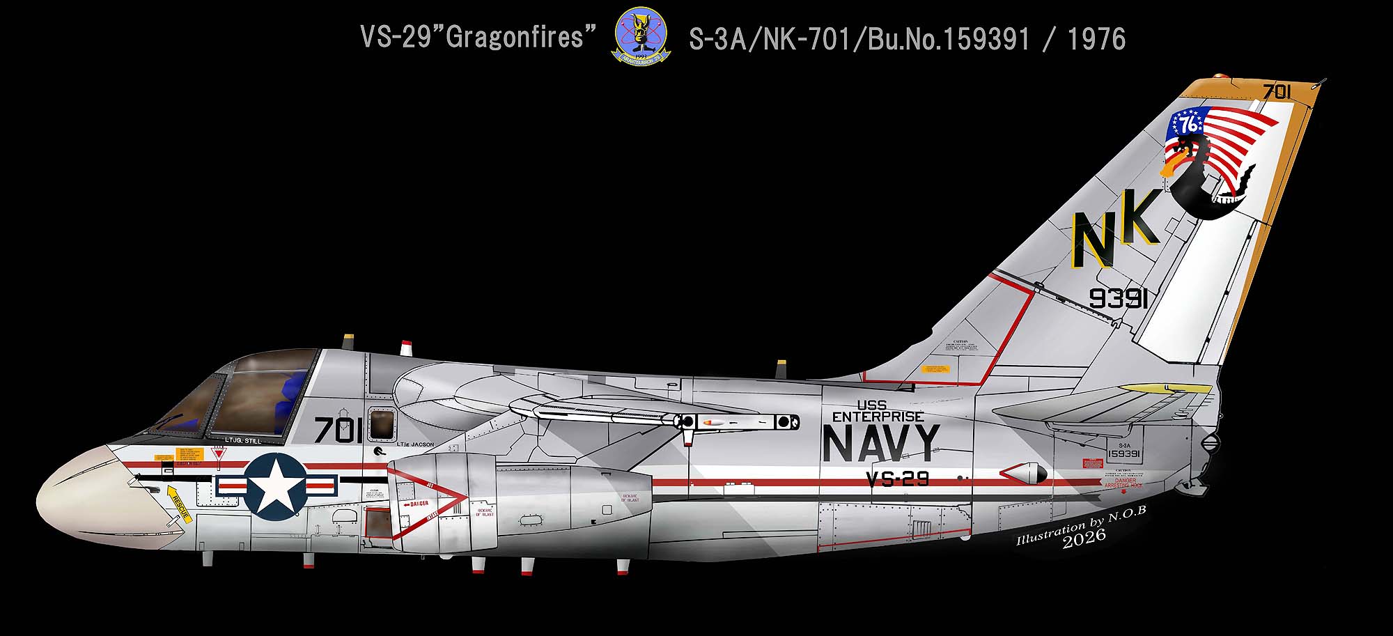 ↓ アメリカ建国200周年にあたる1976年にVS-29の飛行隊長指定機(CO機)に施された記念塗装で、ドラゴンシップの帆が星条旗とされて、1976年独立の年号が入っている。S-3A/NK-701/Bu.No.159391。この機体は後にES-3Aに改造された。