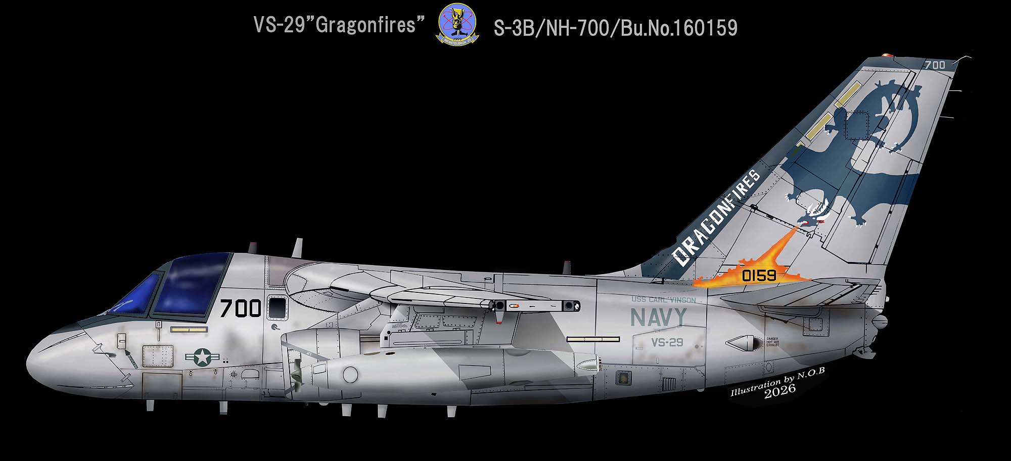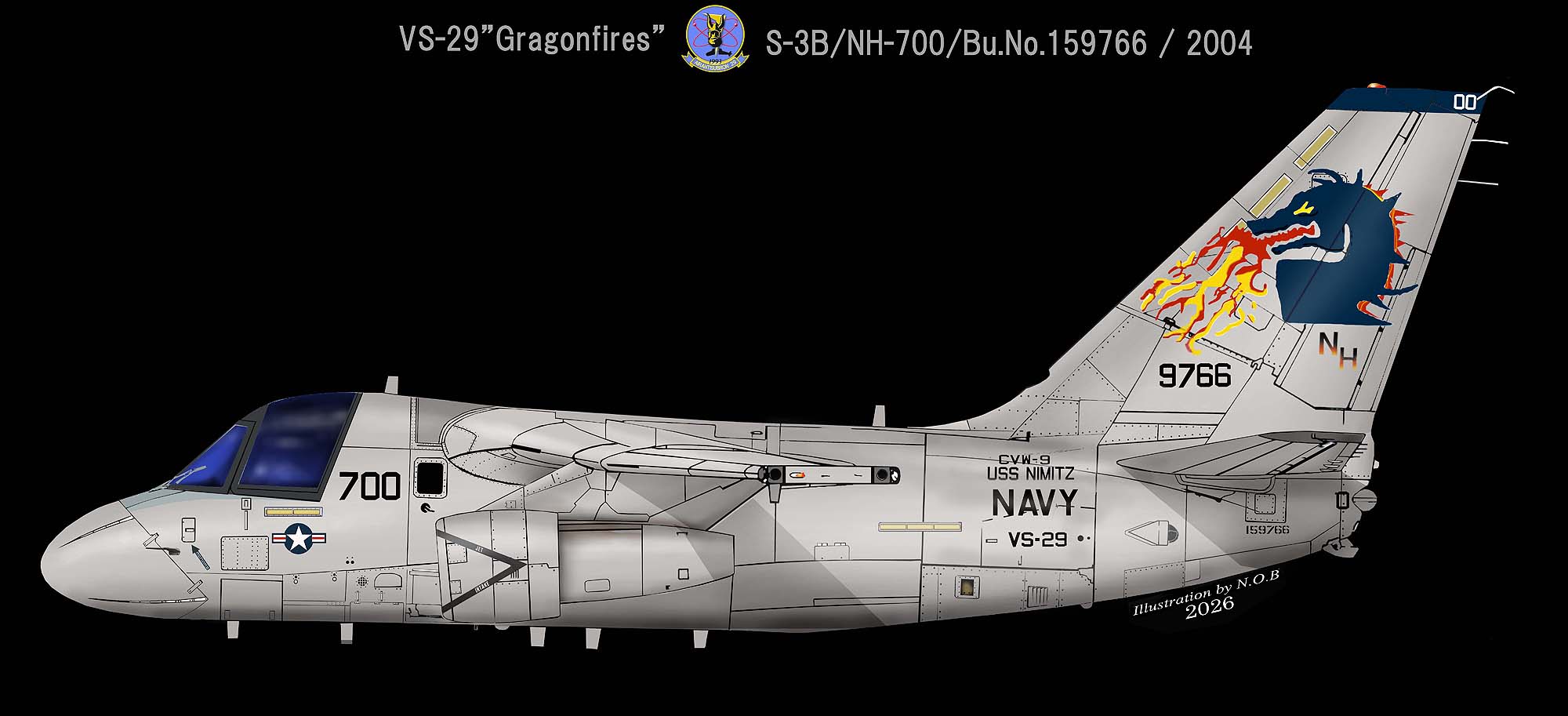 ↓ 1975年のS-3A運用開始から閉隊の2004年4月までVS-29は太平洋方面の空母航空団に所属した。最後に所属した航空団はCVW-9で搭載空母は、2003年からの原子力空母USSニミッツだった。その最後を飾るショーバードが、↑の機体で2代目大きく炎を吐くドラゴン。テールコード"NH"も炎のグラディ―ションとなっている。S-3B/NH-700/Bu.No.159766