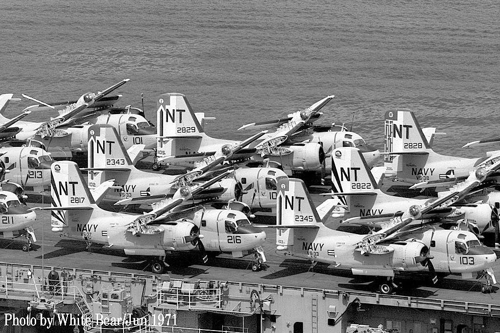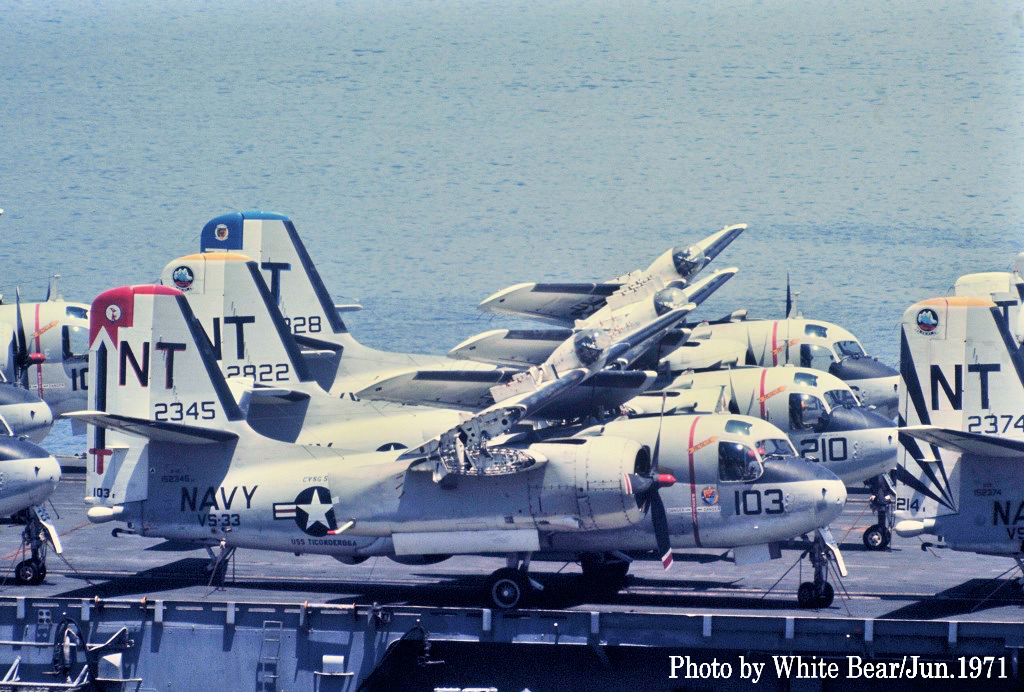 ↑ 1971年6月に佐世保に寄港したUSSタイコンデロガの艦上に駐機するVS-33のS-2E。艦上運用となった関係で機首番が三桁に変っており、また艦上運用とは関係ないが、スクリューバードのマークはエンジンナセル後方から尾翼の先端に移っている。White