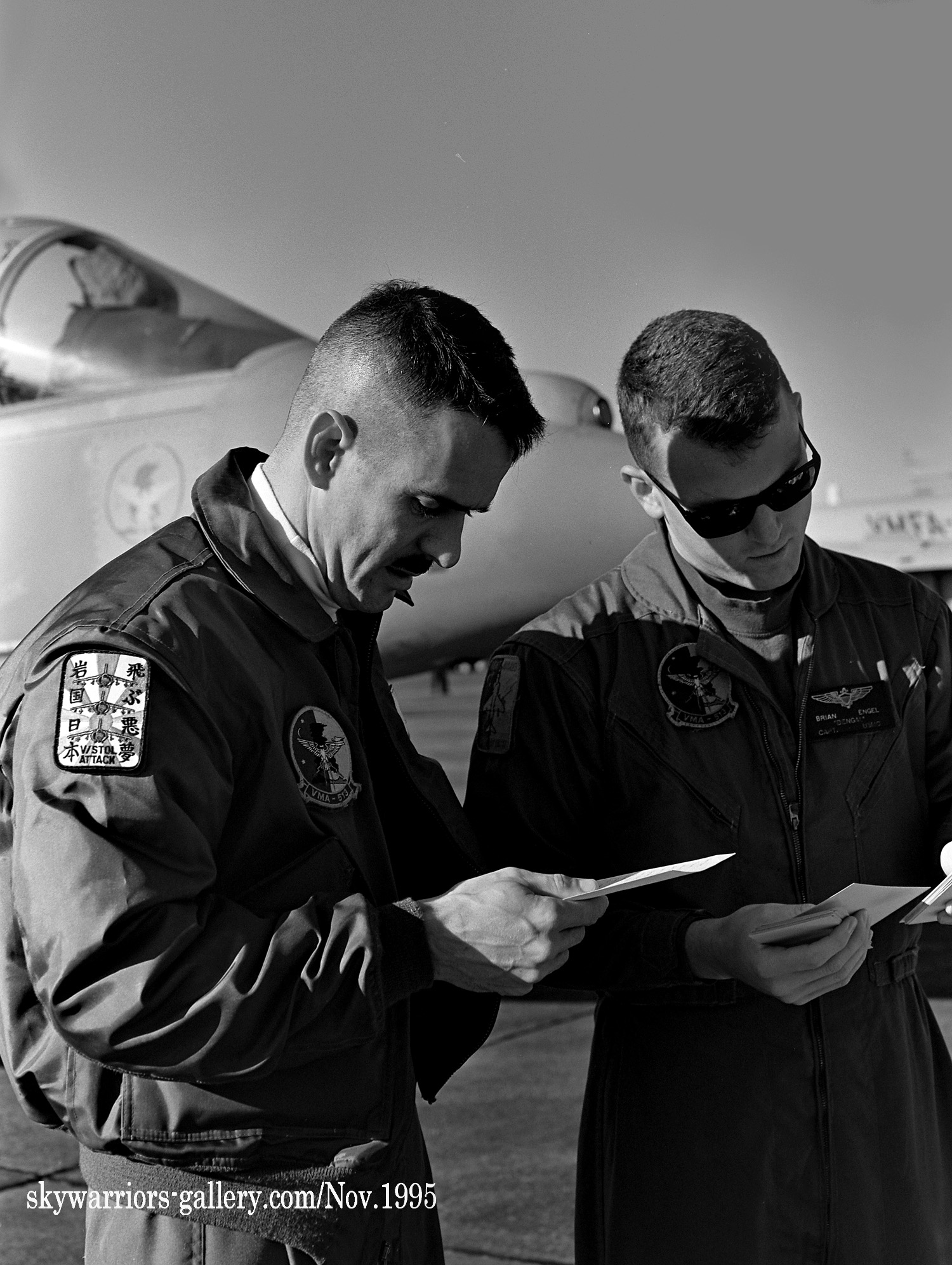 機体が海兵隊グレーに塗り直されて以降、嬉しい事は、インシグニアに因んだ梟のシルエットを尾翼に書込み始めた事だろう。しかも 機首には部隊のインシグニアまで入っている。尾翼を良く見ると「月&星」も書かれているのだ。↓