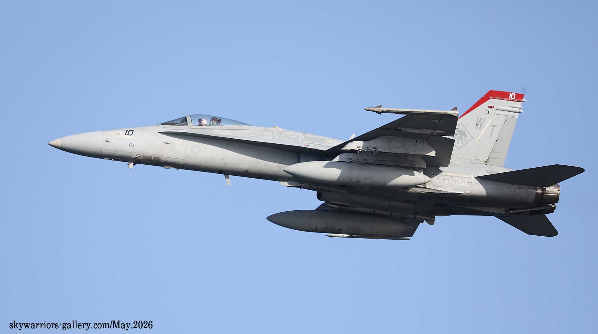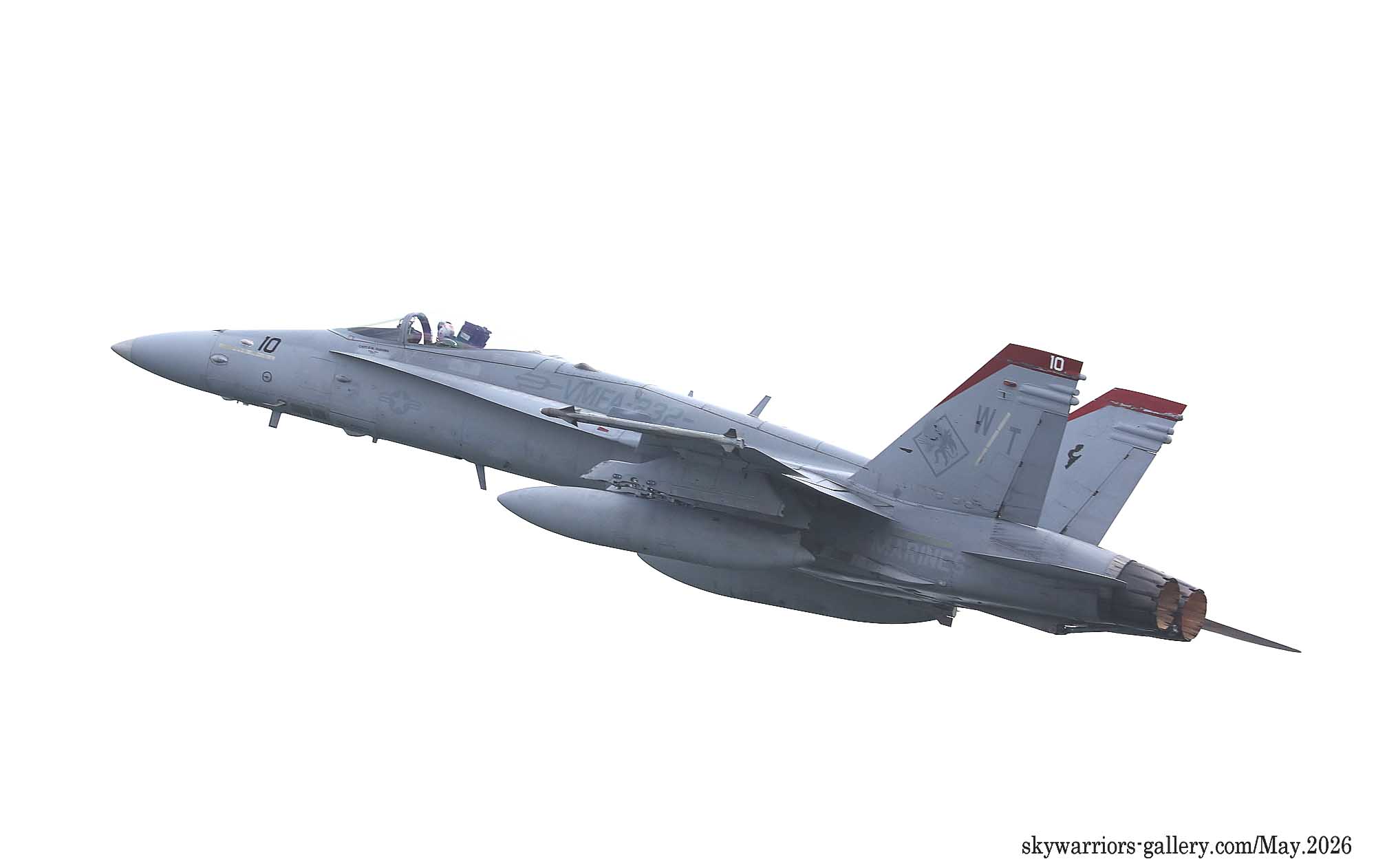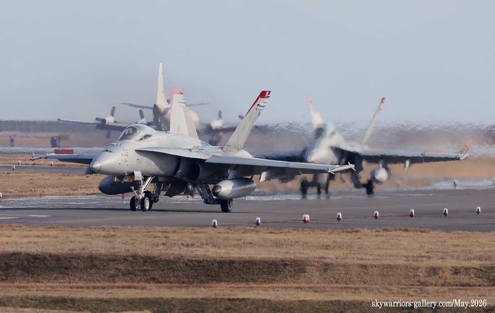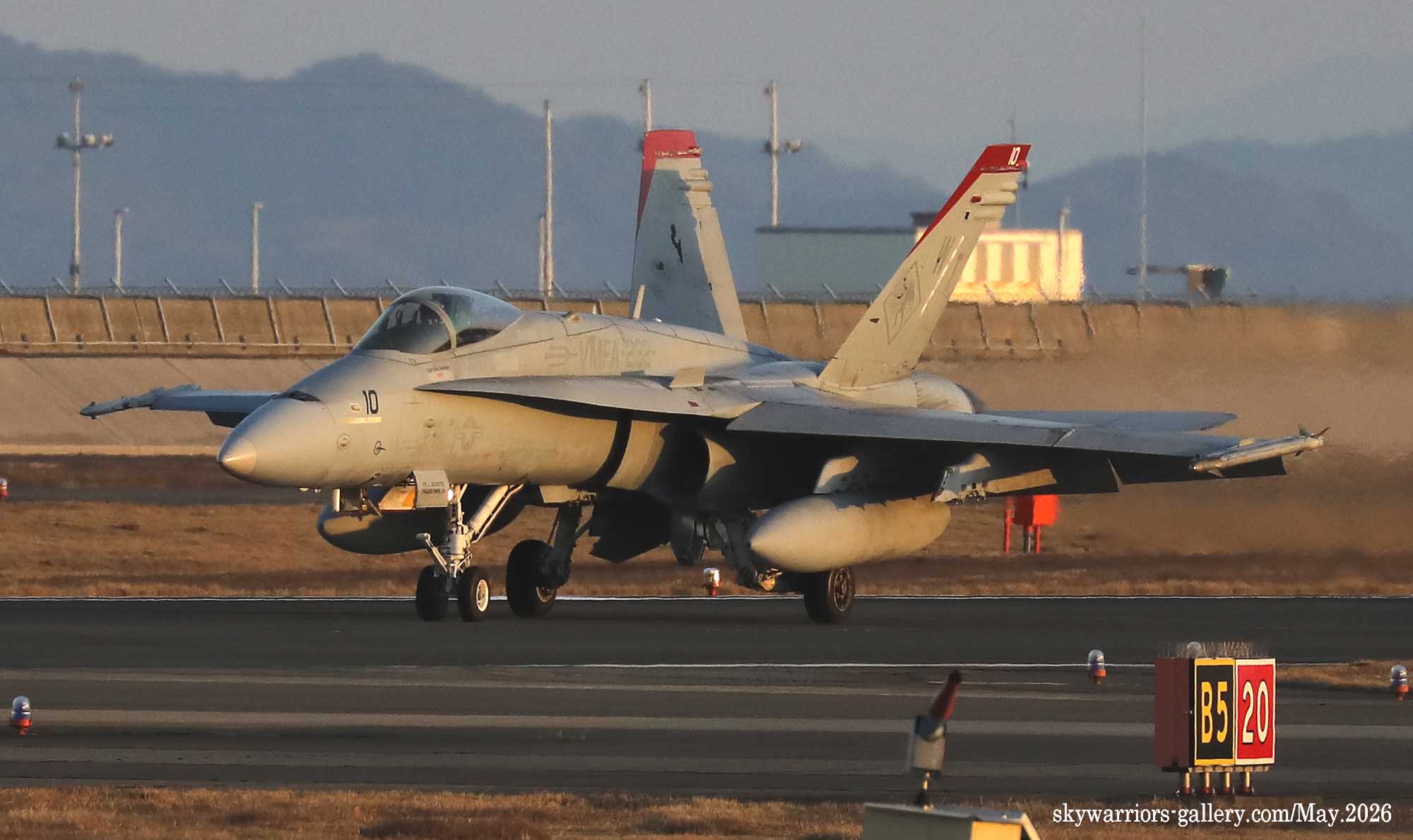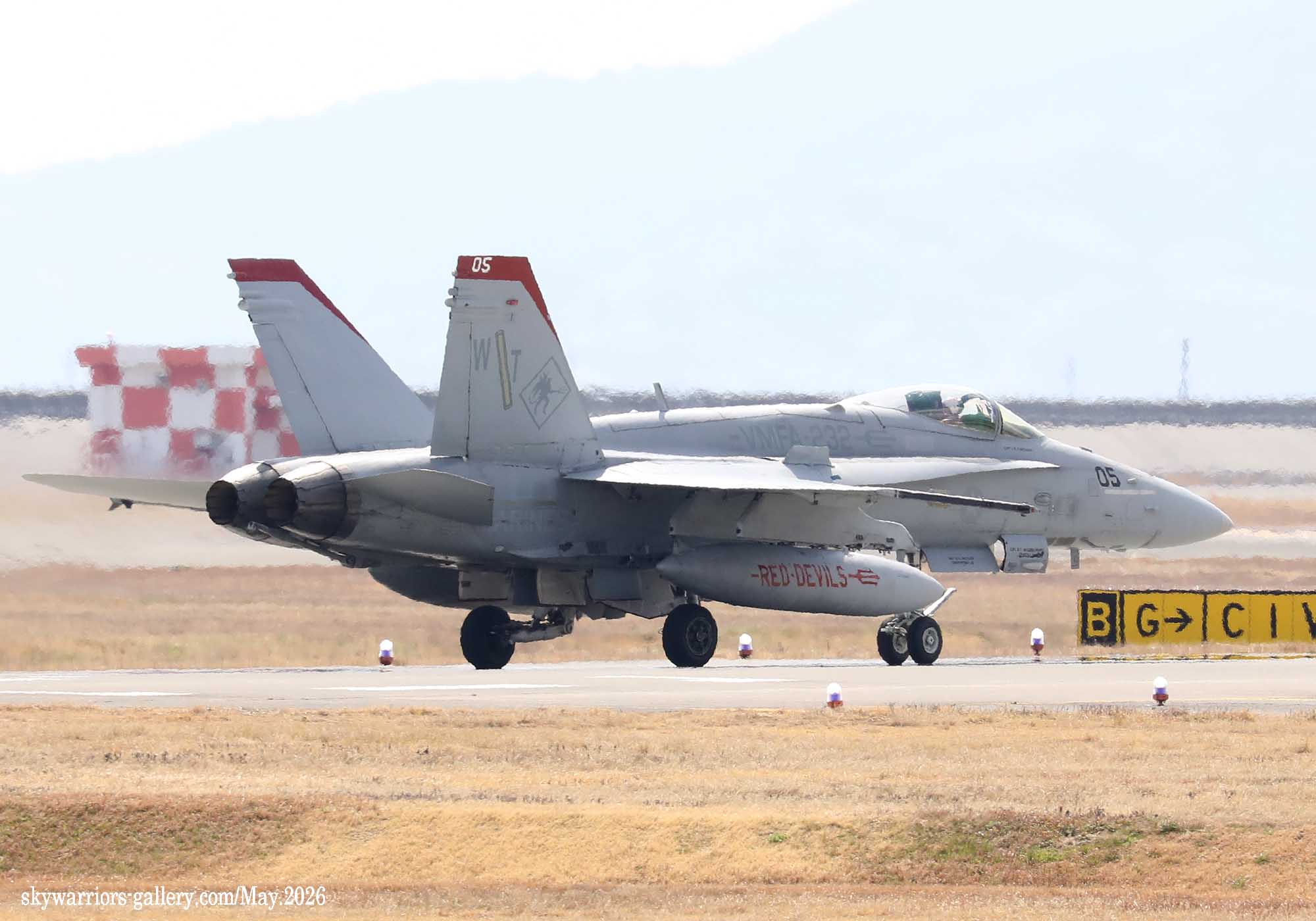恐らくFA-18C/Dにおける最後のページとなる本項では、今回の遠征の最終日に何とか撮影にこぎつけたWT-00からUPしたい。2026年3月遠征初日の月曜日から5日の日程で岩国基地に張り付いたが、寒い風が吹く中先週まで1日に2フライトもしていたらしいWT-00のブラックデビル君は木曜日までフライトなし、地元では「調子が悪く格納庫入り?・・・簡易ハンガーに姿なし」との噂まで出ていたが、最後の金曜日に昼前に離陸姿を見た。光は良くないが、ブラボーで曲がらずエンドまで来てくれることを願いひたすら待つ、願いは漸く叶いファインダーに収める事が出来た。光は良くないが撮れただけ良しとしなければならない。どうもこの部隊の後継と目されるVMFA-311の方はイラン戦争の関係か来日が遅れそうである。暫く岩国でもまだ撮れるチャンスがありそうであるが、私は今回でピオルドを打って、次回VMFA-232を取り上げる場合はページを作新してF-35Cとしてご紹介したい。(2026年3月 記)