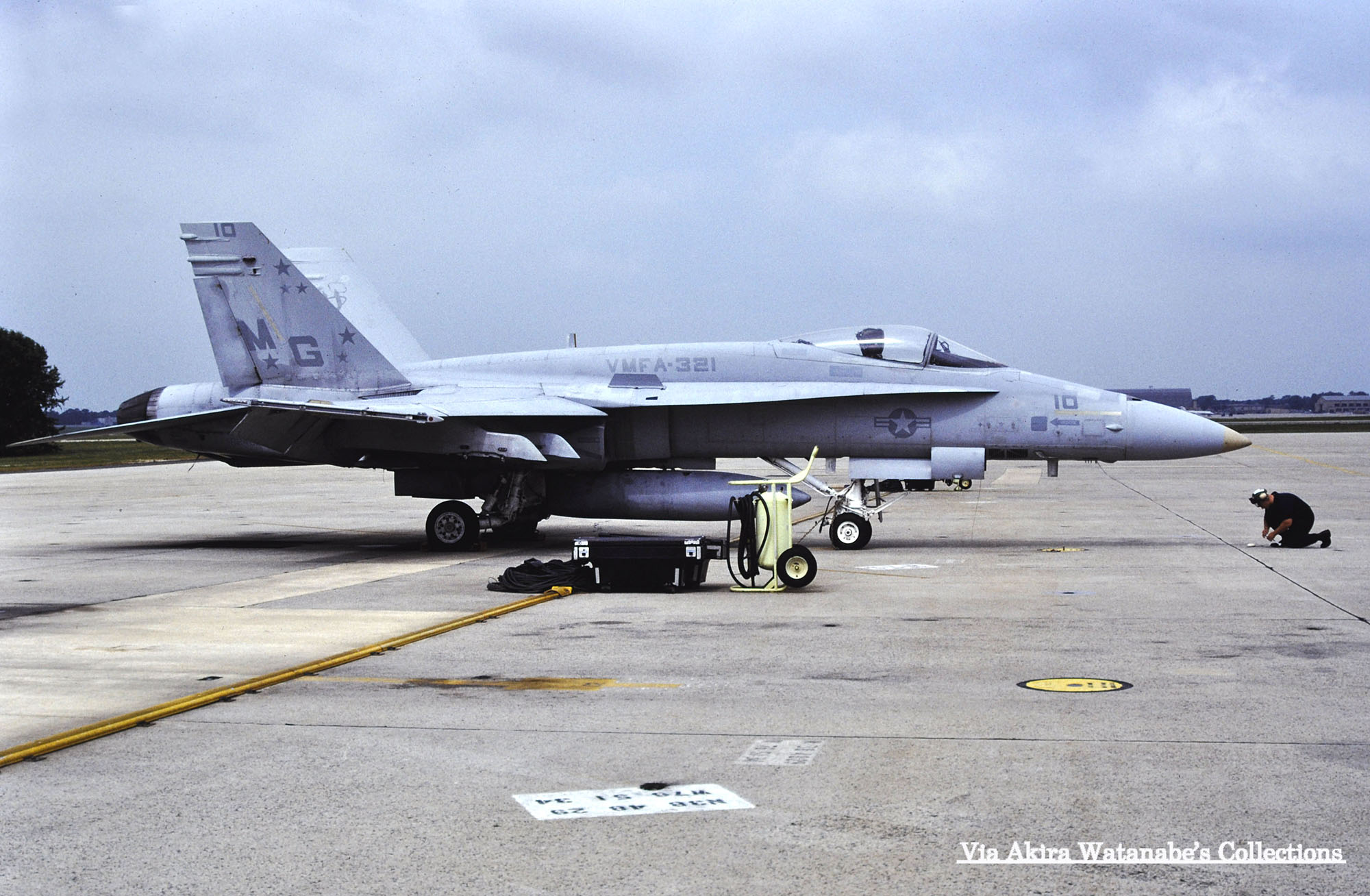 ↑ 1998年ミンディンホールの航空ショーに出展されたVMFA-321のF/A-18A この部隊がホーネットを受領しておそらく最初のフルカラーマーキングで F-4Sでの引退時の塗装を踏襲したものと考えられる。但し Modex.部隊ナンバー 尾翼のマーキング以外は、ロービジ基準になっていた。