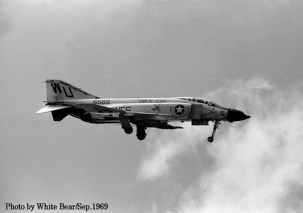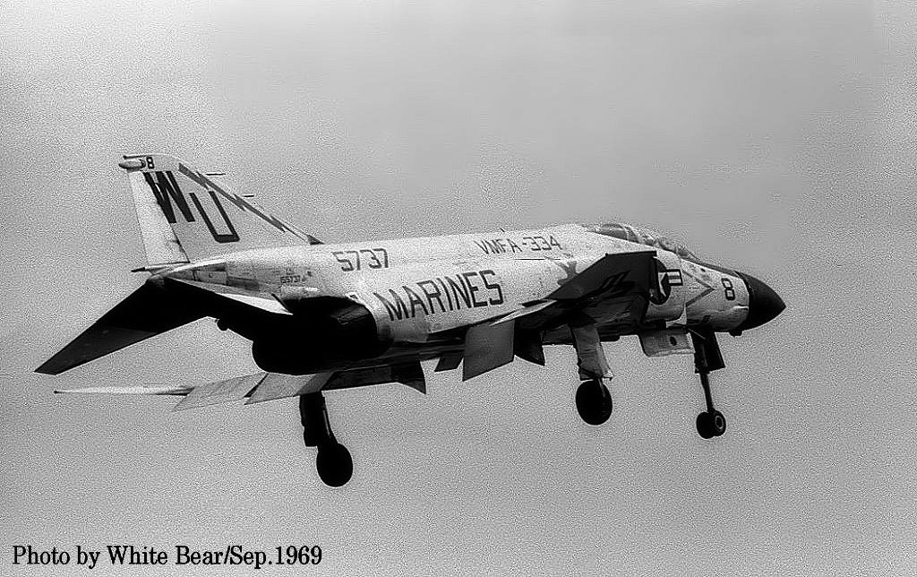 ↑ 本項一連の写真は全て、White Bearさんが1969年9月岩国基地で撮影されたVMFA-334のF-4Jの写真である。岩国の旧滑走路をR/W-02で離陸するVMFA-334のF-4J/WU-01。この機体は1979年にVMFA-235/DB-162として岩国に来ている。