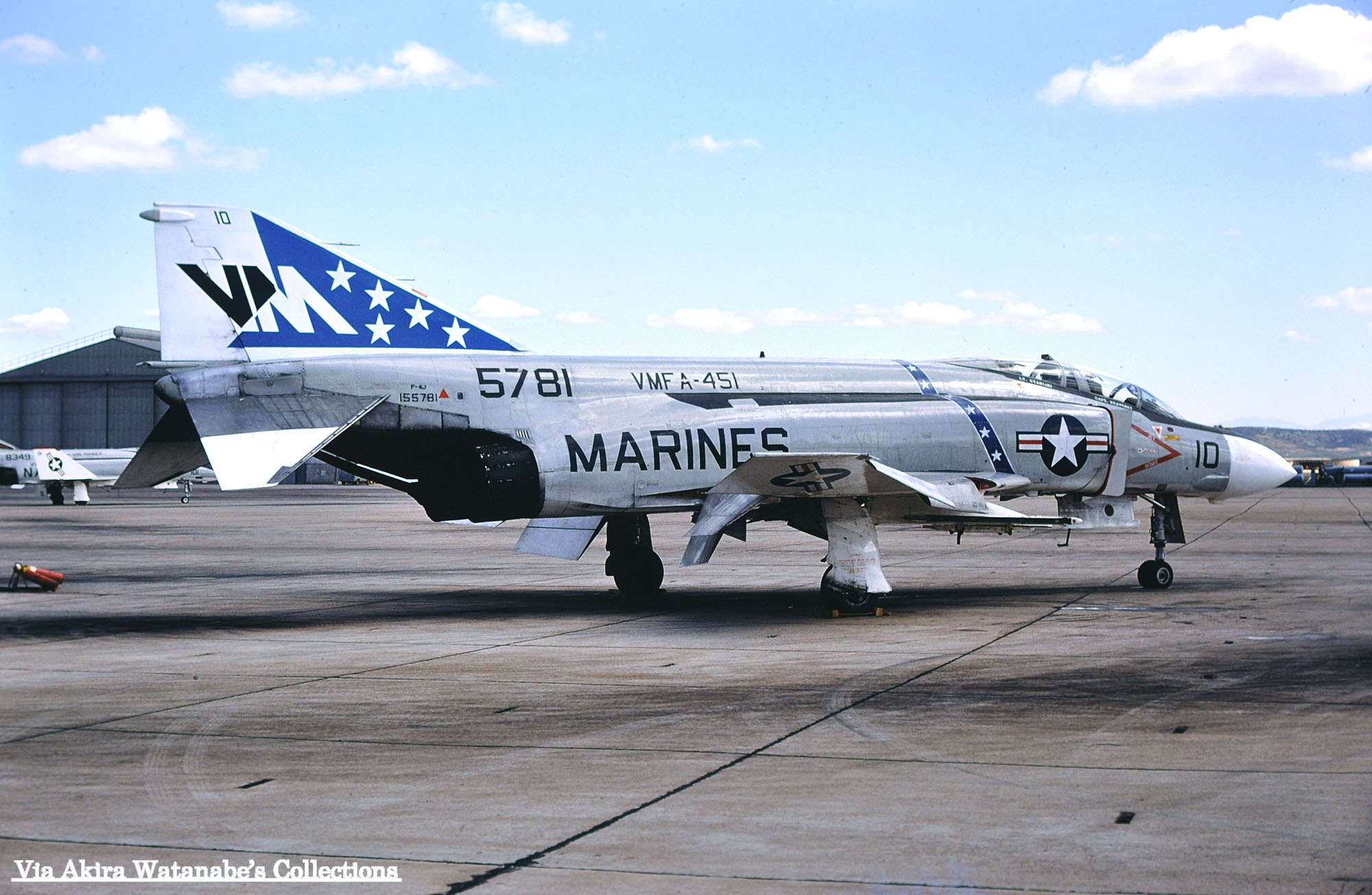 創隊当初の初期マーキングとされるVMFA-451のF-4J。尾翼の5つ星のシェブロンと側面に5つの星が入った帯が入っていた。胴体の帯は海軍機ではよく見られたが、海兵隊機では同隊とVMFA-323以外殆ど見られないものだった。F-4J/VM-13/Bu.No.155528