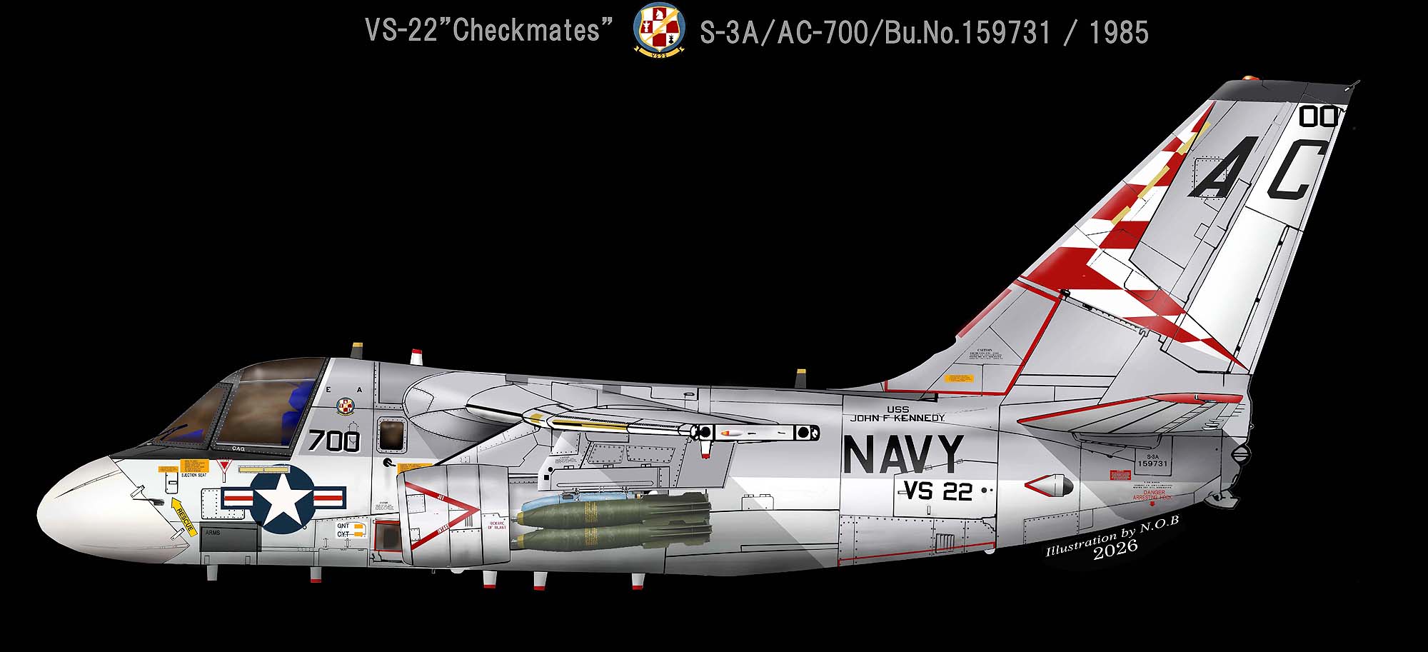 VS-22の起源となる飛行隊は諸説があるようだが、1945年にNASブラウンズウィックで雷撃隊として創設された部隊が、後にノーフォーク海軍基地で対潜飛行隊VS-22に生まれ変わったものと言う説と1960年にNASロードアイランドで創設されたVS-22が起源だと言う説である。両飛行隊共にチェックメイツというニックネイムを持っていた。まぁどちらが起源でもよいのであるが、S-3Aを運用したVS-22は、大西洋方面で初のS-3バイキング飛行隊として1974年からジェット化を進めてきた飛行隊である。最初に空母USSサラトガで運用され、1980年までの間4度の航海に出ている。1980年に空母サラトガが長期ドック入りした際に、CVW-3と共にUSSジョン・F・ケネディーに搭載され、この後にS-3Bに機種転換も行った。空母ジョン・F・ケネディでは7回も航海に出ており、特に1990年~1991のイラク戦争関連では300回以上の出撃を行っている。2000年以降はUSSトルーマンに載ってイラク解放作戦等に参加、この時には1100回以上の任務を御成したと言われる。部隊として最後に搭載されたのは、空母ジョージ・ワシントンでCVW-17に属し"AA"のテールコードを付けている。S-3Bを最後まで運用した飛行隊として2009年1月29日に解散した。(2026年2月 記)