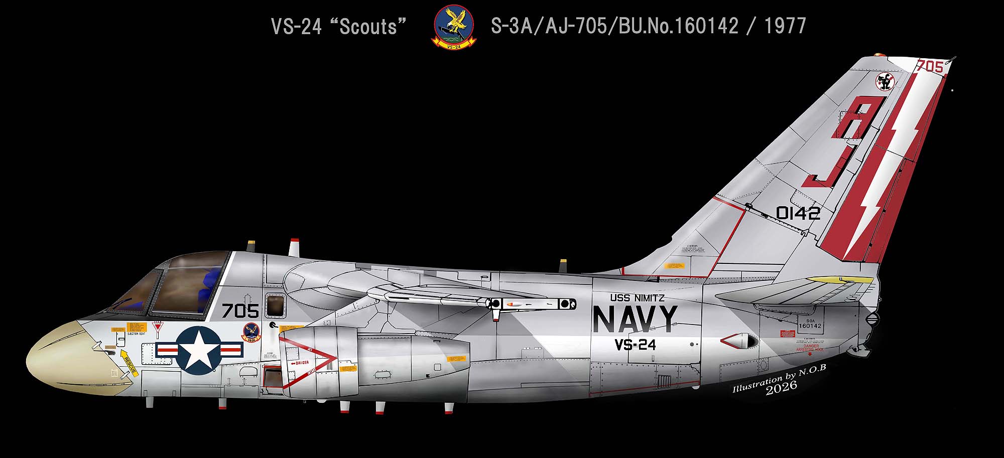 ↓ 1977年12月から最新鋭の原子力空母ニミッツ級1番艦USSニミッツへの搭載が決まり最初の航海に出た頃のVS-24のマーキング。新しいインシグニアは、機首に、古いダーティキャッツのインシグニアを尾翼の先端に付けていた。S-3A/Bu.No.160142。