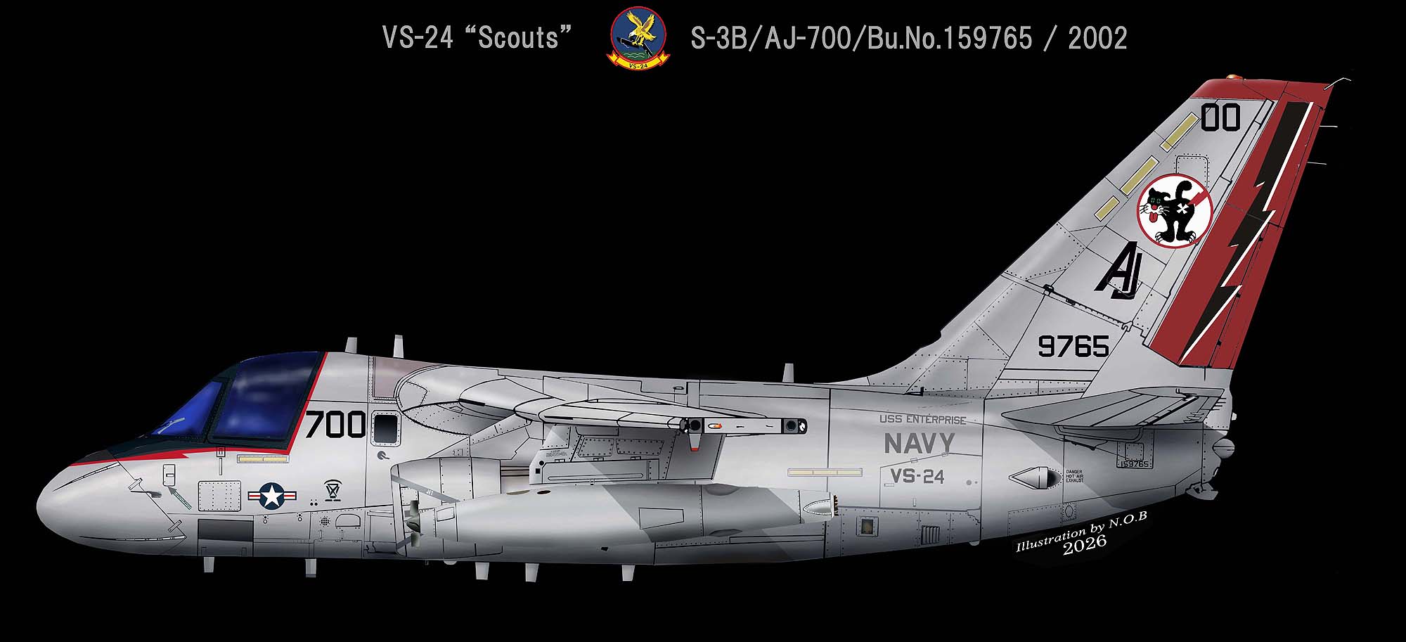 ↓ VS-24最後の空母での航海となった2005年の9月USSセオドア・ルーズベルト艦上で確認された恐らく最後のCAGマーキングのS-3B/AJ-700。テールコード"AJ"は、赤いシャドーが尾を引いており、機首のコックピットの縁取りも赤いシャドー付でレドームまで伸びている。給油ポッドには"SCOUTS"の部隊名が記され派手なデザインとなった。S-3B/Bu.No.160143