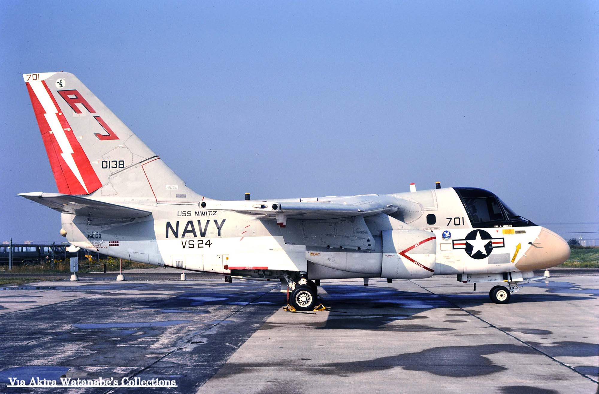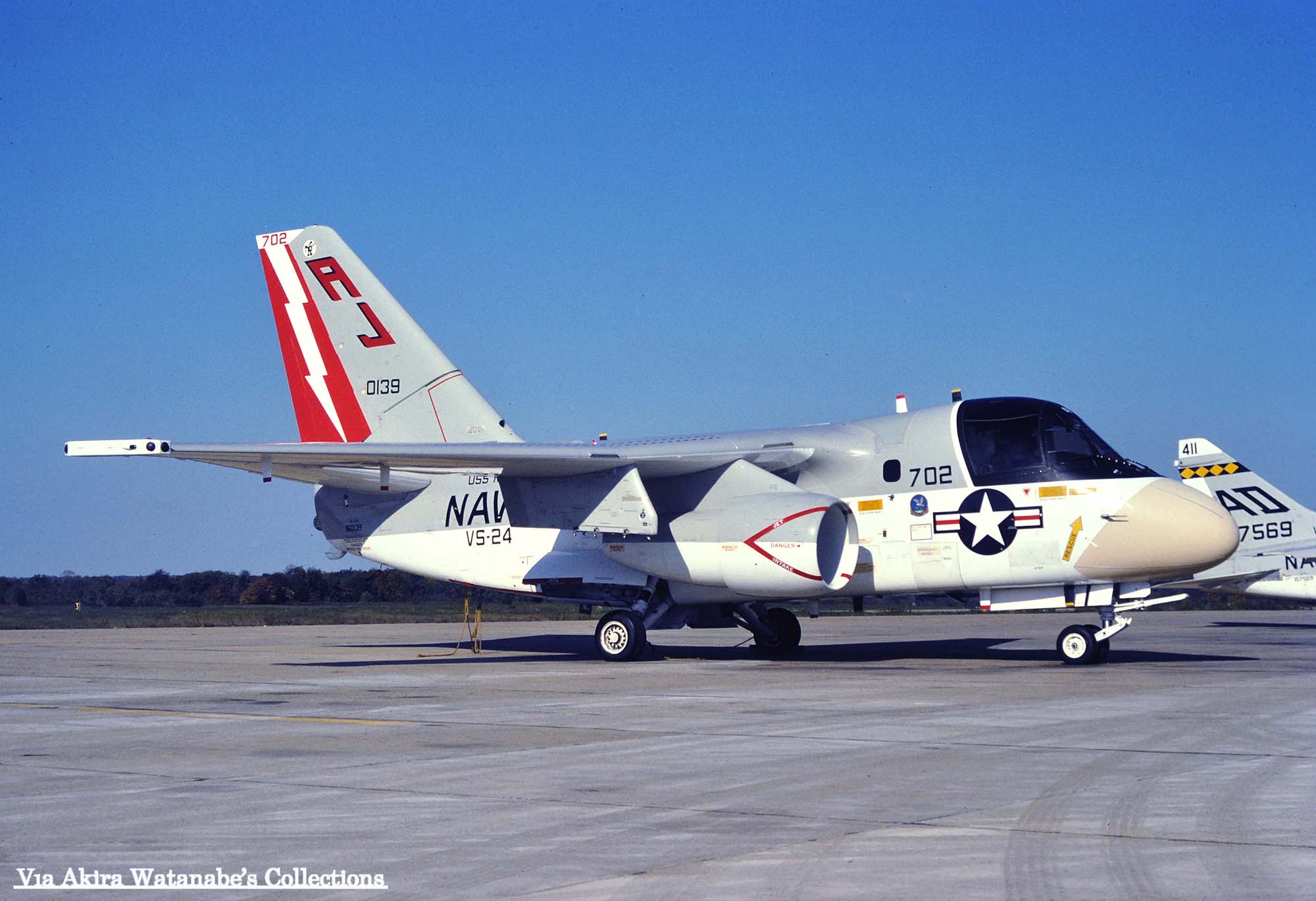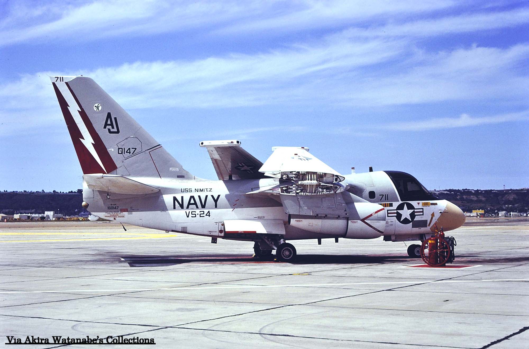 ↑ 1976年10月に撮影されたVS-24のS-3A/AJ-702。VS-24は1976年にS-3Aバイキングを装備して、最初は空母USSフォレスタルのCVW-17(AA)に配属予定だったので"AA"のテールレターを書き込んでいたが、空母フォレスタルにはVS-30が宛がわれたため、当時最新鋭の原子力空母USSニミッツへの搭載になった。最初の航海は1977年11月から8か月の長期航海となり、主に地中海方面での哨戒任務にあたっている。