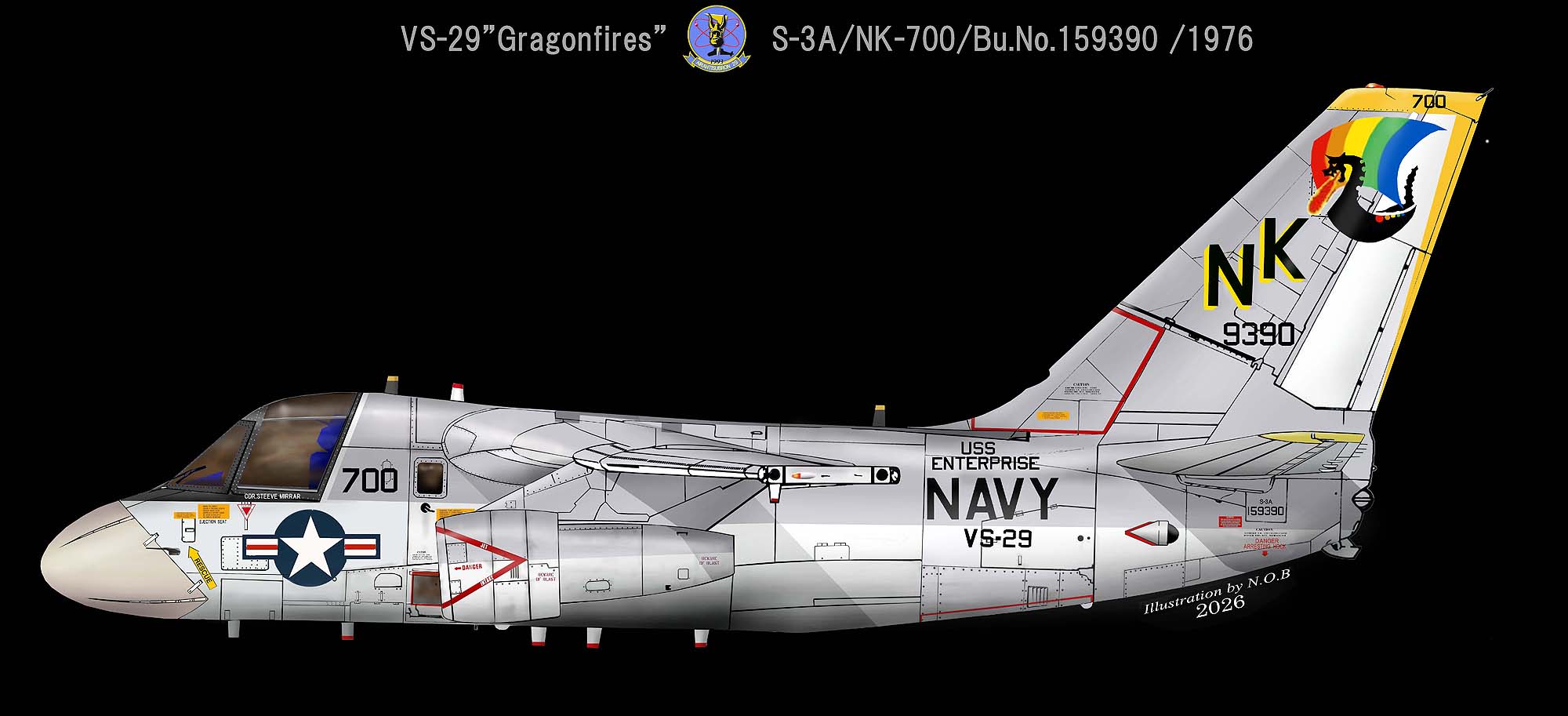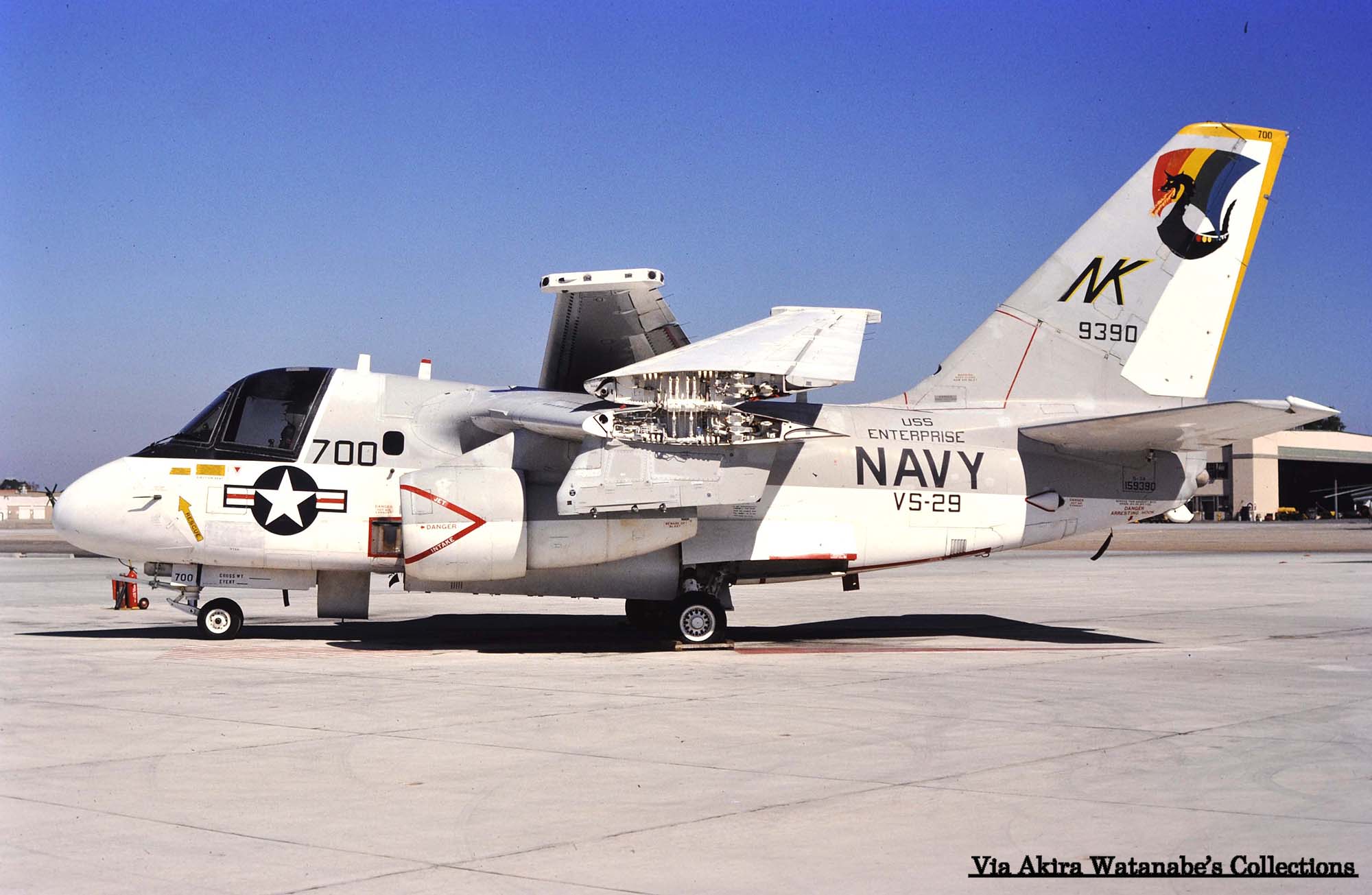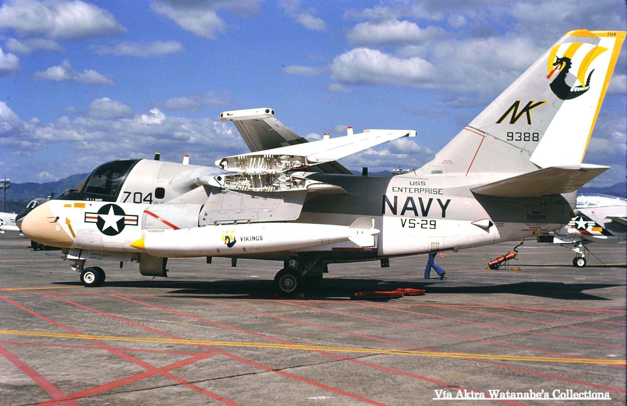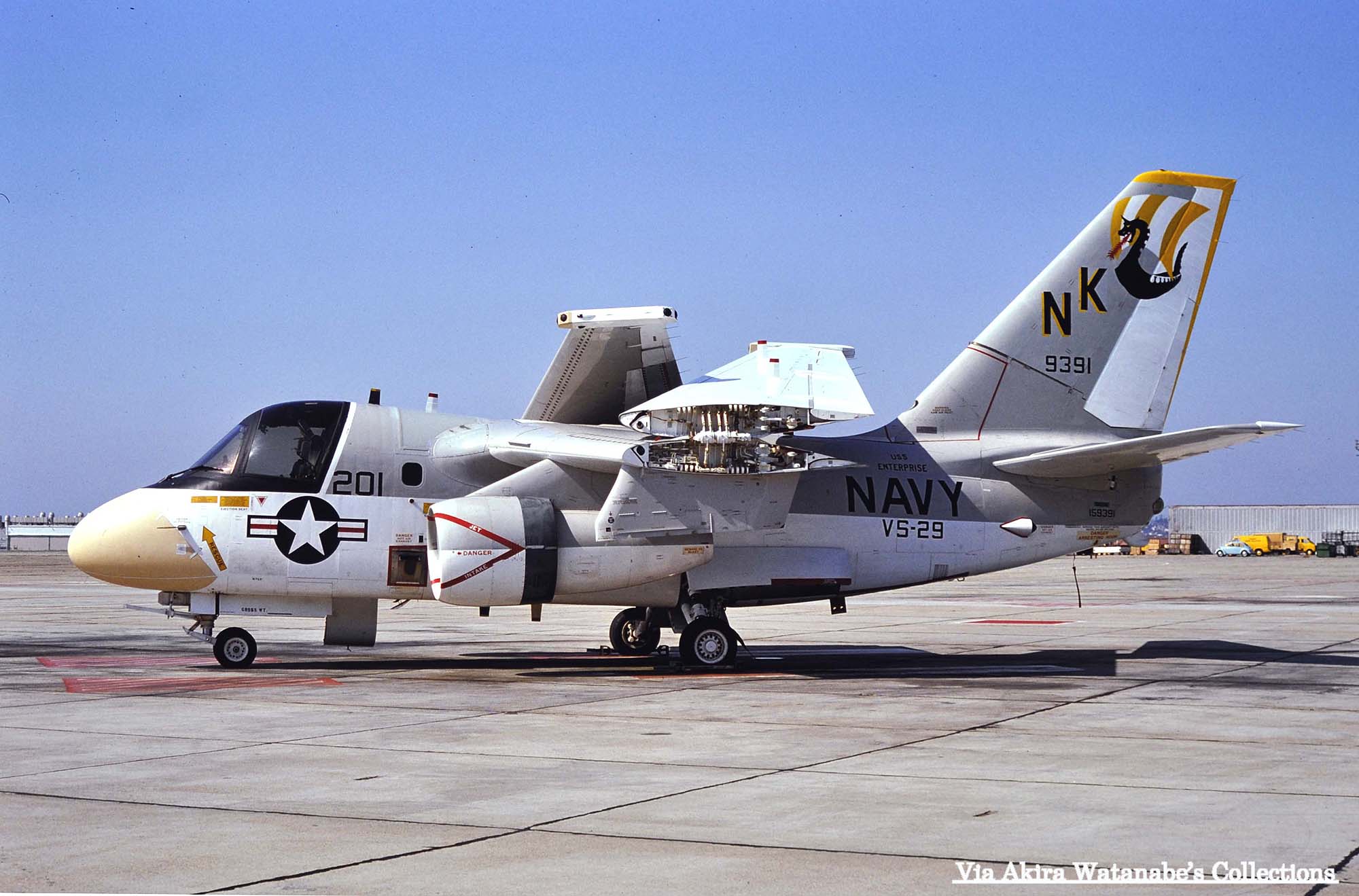 ↓ 太平洋方面では、初の艦載対潜哨戒機飛行隊の実戦部隊として、原子力空母USSエンタープライズに搭載されたVS-29のS-3A。尾翼のマークは、13世紀の北欧民族が使ったドラゴン船をモデルにデザインされたもので、CAG指定機以外は、白と黄の縞模様である。S-3A/NK-700/Bu.No.159390