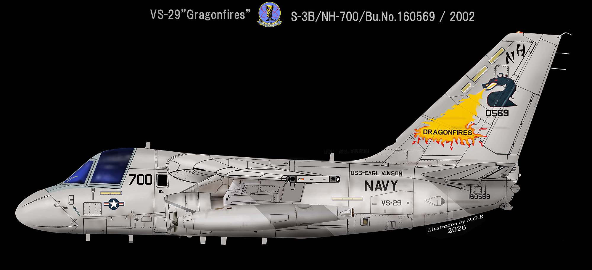 ↓VS-29がS-3Bを運用して1998年からCVW-9の傘下で搭載された空母がUSSカールビンソンだった。この時期対潜任務が主ではなく、給油機としての航空団支援業務だったので、尾翼絵柄も大量の油というイメージが強いデザインとなったか?・・・S-3B/NH-700/Bu.No.160569
