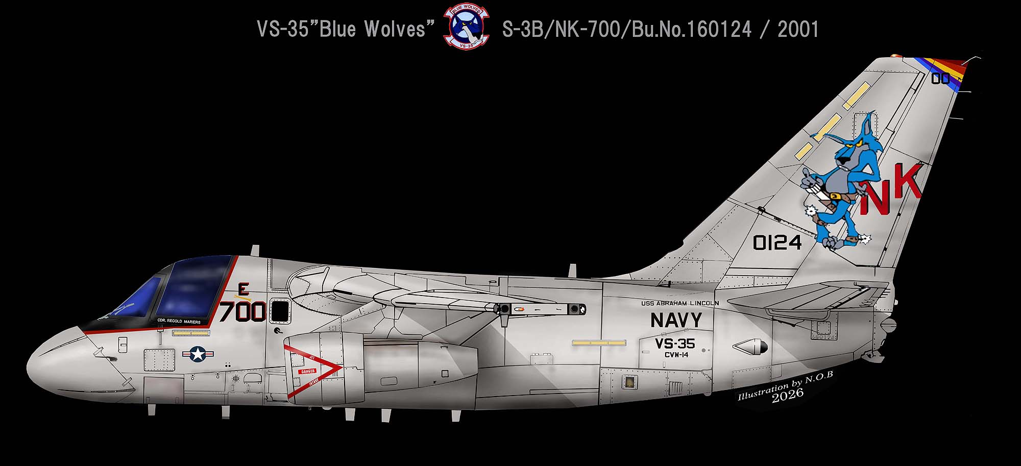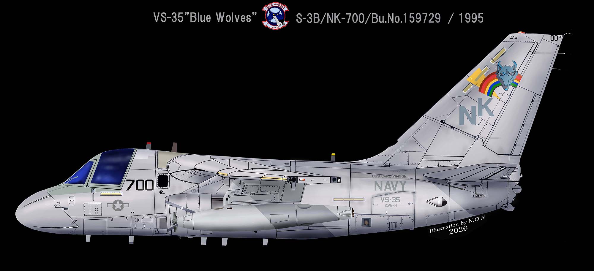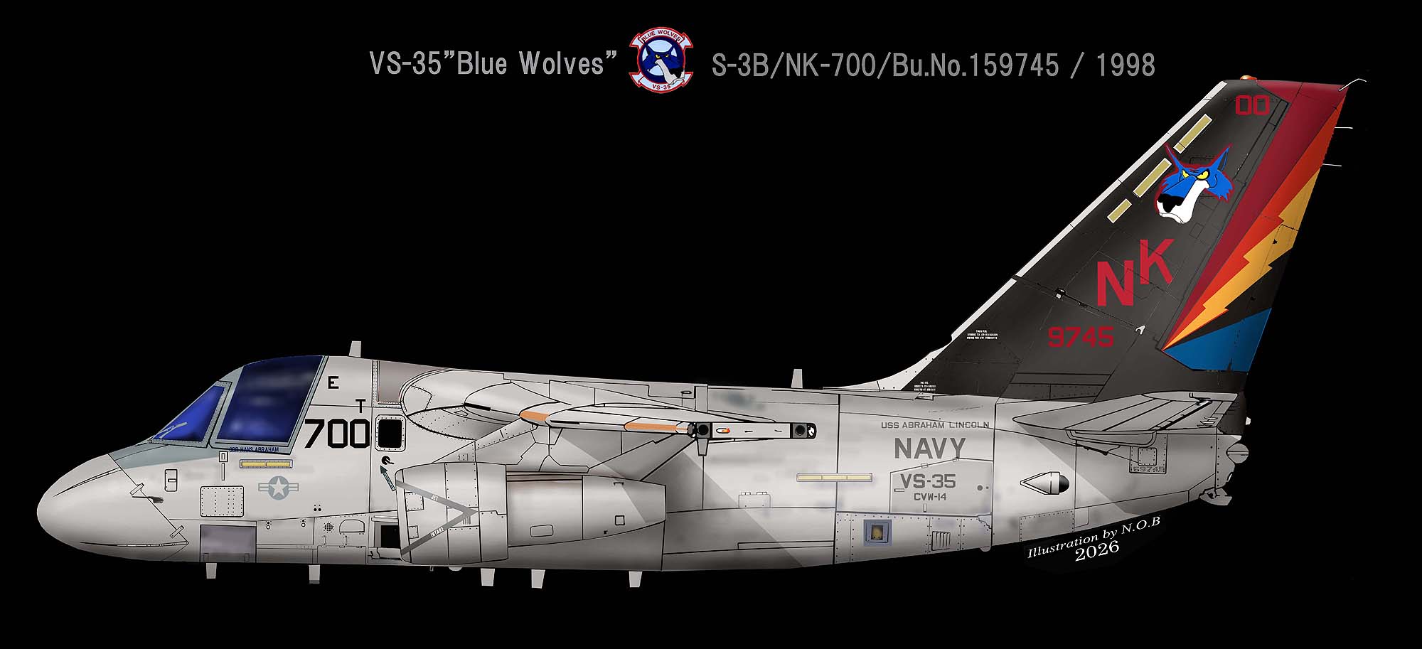 ↓ 1998年 USS エイブラハム・リンカーンに搭載されていた頃のCAGマ^キングで、1997年までは同じデザインで尾翼はグレーの下地のままだった。空母エイブラハム・リンカーンには1997年から2003年まで搭載されており、この期間にブルーウルフは、アニメチックなデザインに変更されている。S-3B/NK-700/Bu.No.159745