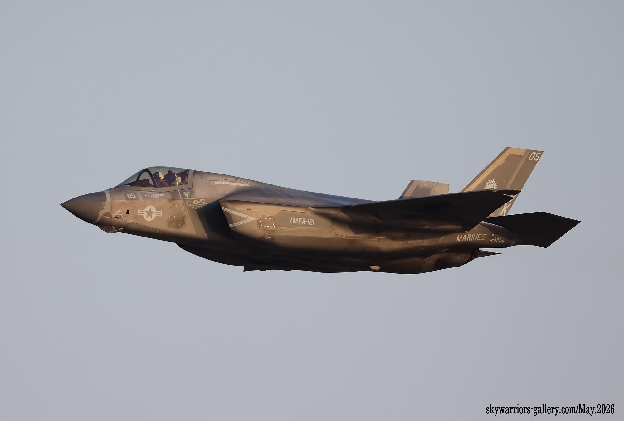2026年3月初旬に岩国基地展開を始めたが、目的はそろそろ本国帰国と目されるVMFA-232のFA-18C/Dとその後継部隊として来日が予定されている(あくまで噂)のVMFA-311だったが、F-35Cを擁するVMFA-311の初来日は目にする事が出来なかった。緊迫するイラン情勢でスケジュールが変更されたか、キャンセルとなった可能性すら考えられるが、本項ではその際に撮影できたVMFA-121のF-35Bの写真から展示する。同隊は、既にトランプ政権が佐世保の強襲揚陸艦トリポリをペルシャ湾に向かわせようとしていた事から、その艦と共に一部が向う可能性も有り、その動向が注目された。(2026年3月 記)