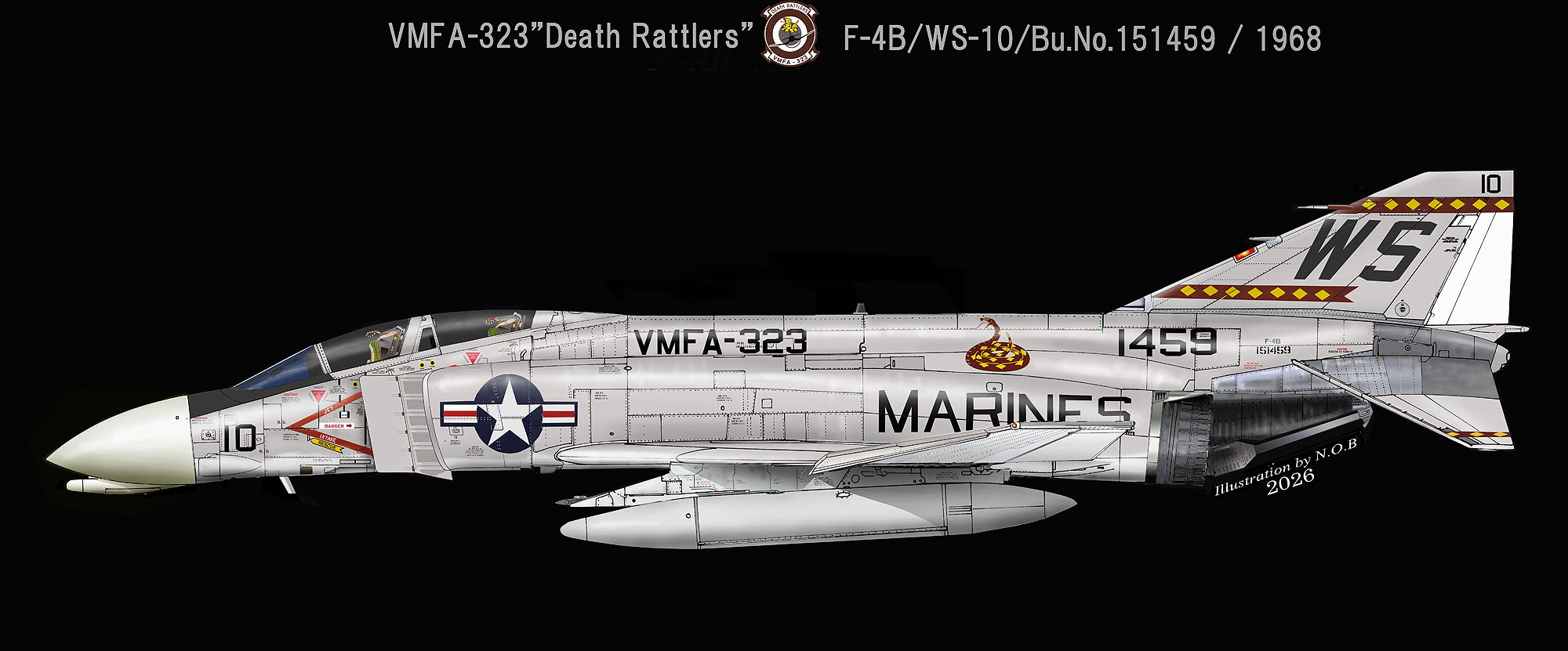 ↑ 1968年再び同隊が、ダナン空軍基地に展開した時のマーキングで、とぐろを巻いたガラガラヘビのマークが胴体後方に移動している。1968年の1月に始まったベトコンによるテト攻勢では空軍基地が狙われ、同隊の人員にも死者が出るなど被害が出ている。横にいたVMFA-314では2機のF-4Bが被害を受けたが、同隊は機材の被害は少なかったようだ。F-4B/WS-10/Bu.No.151459