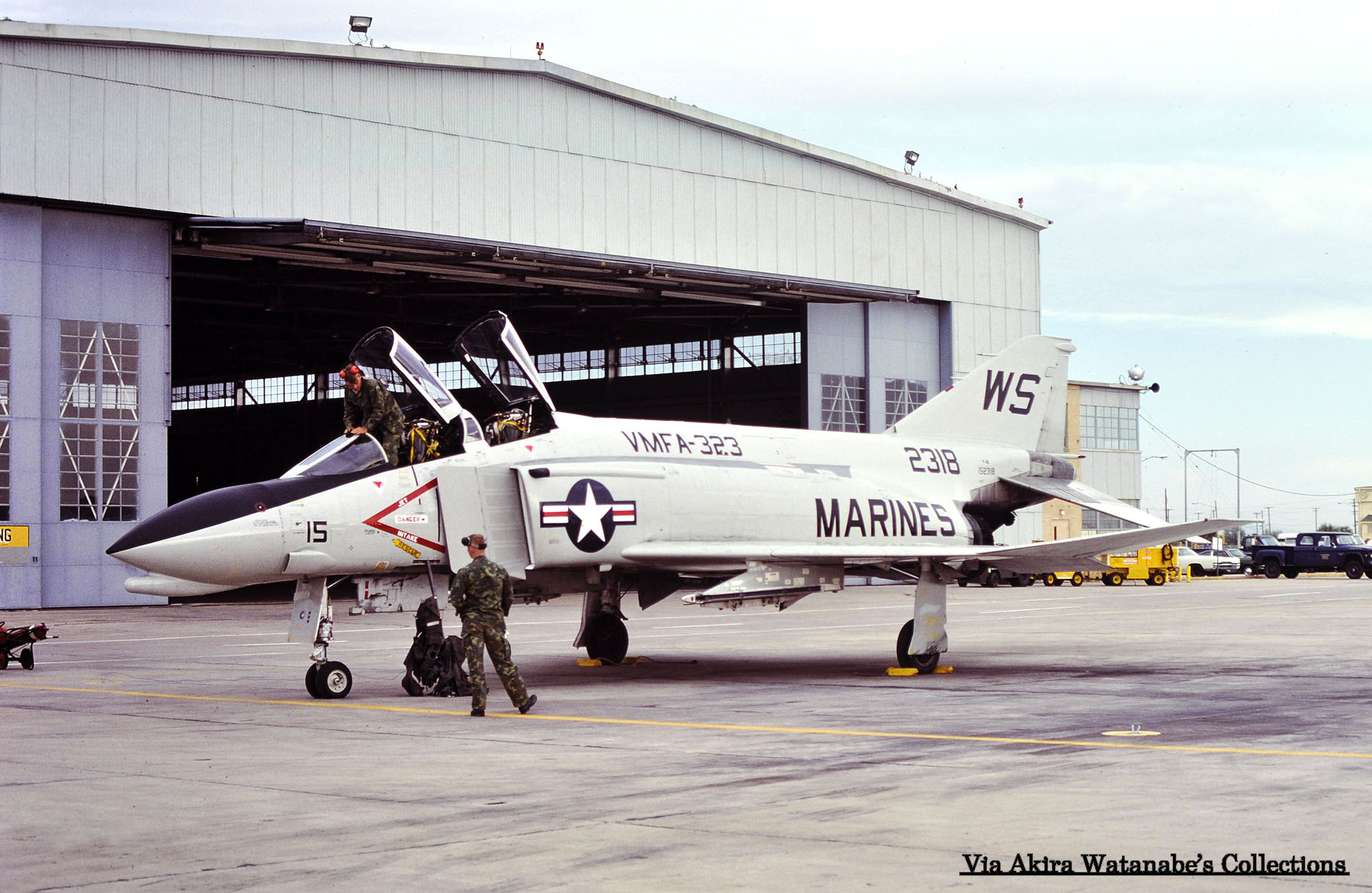 ↑ 上の2枚の写真は、1978年の6月にバックレイ空軍基地で撮影されたVMFA-323のF-4N。WS-15とWS-6共に同じ塗装であるから、同隊が一時的にマーキングをロービジに変えた事が判る。一般SNSには殆ど出ていない塗装の写真であり、興味深い。彼らは、1980年には空母コーラルシーに載ってアジア経由で中東に派遣されるが、マーキングはベトナム戦時代のものが復活している。次ページで確認して頂ける。