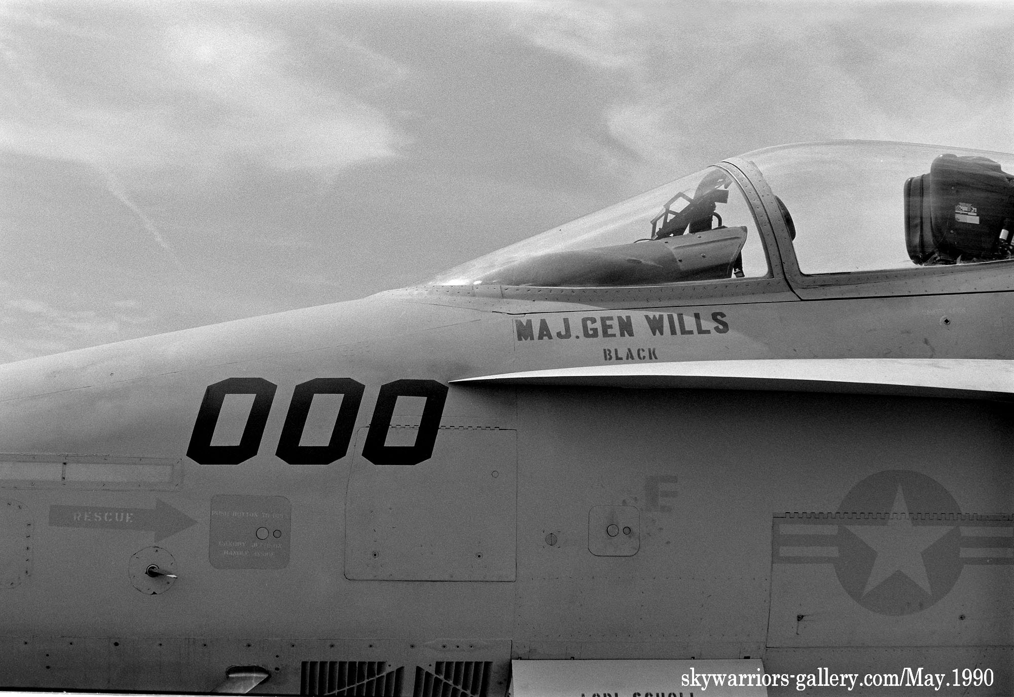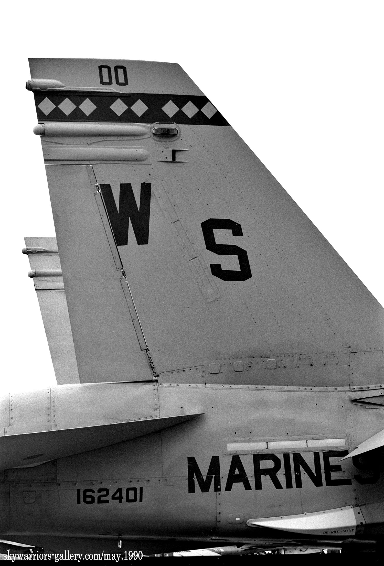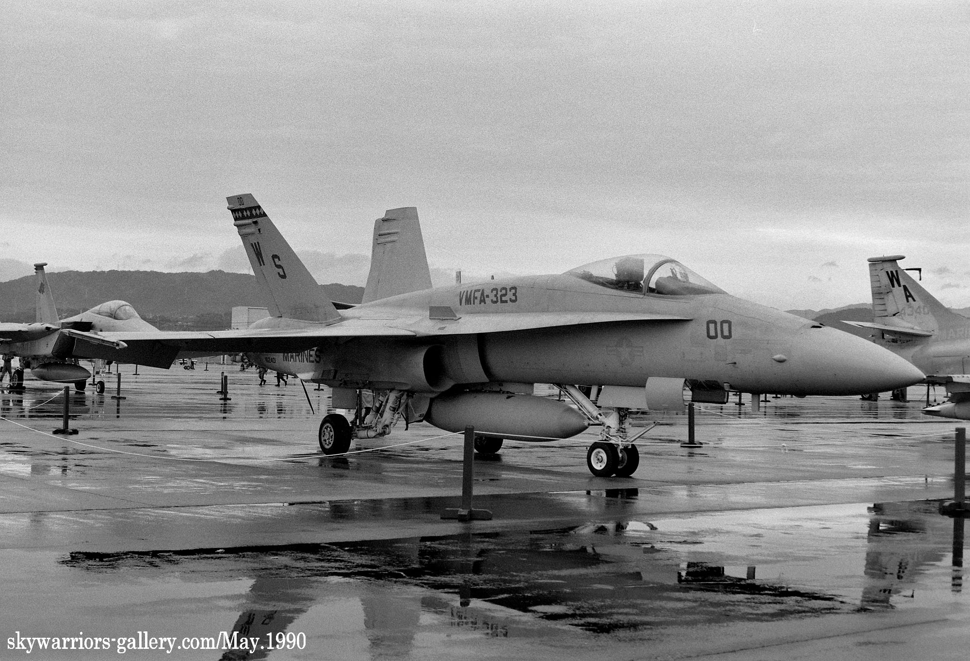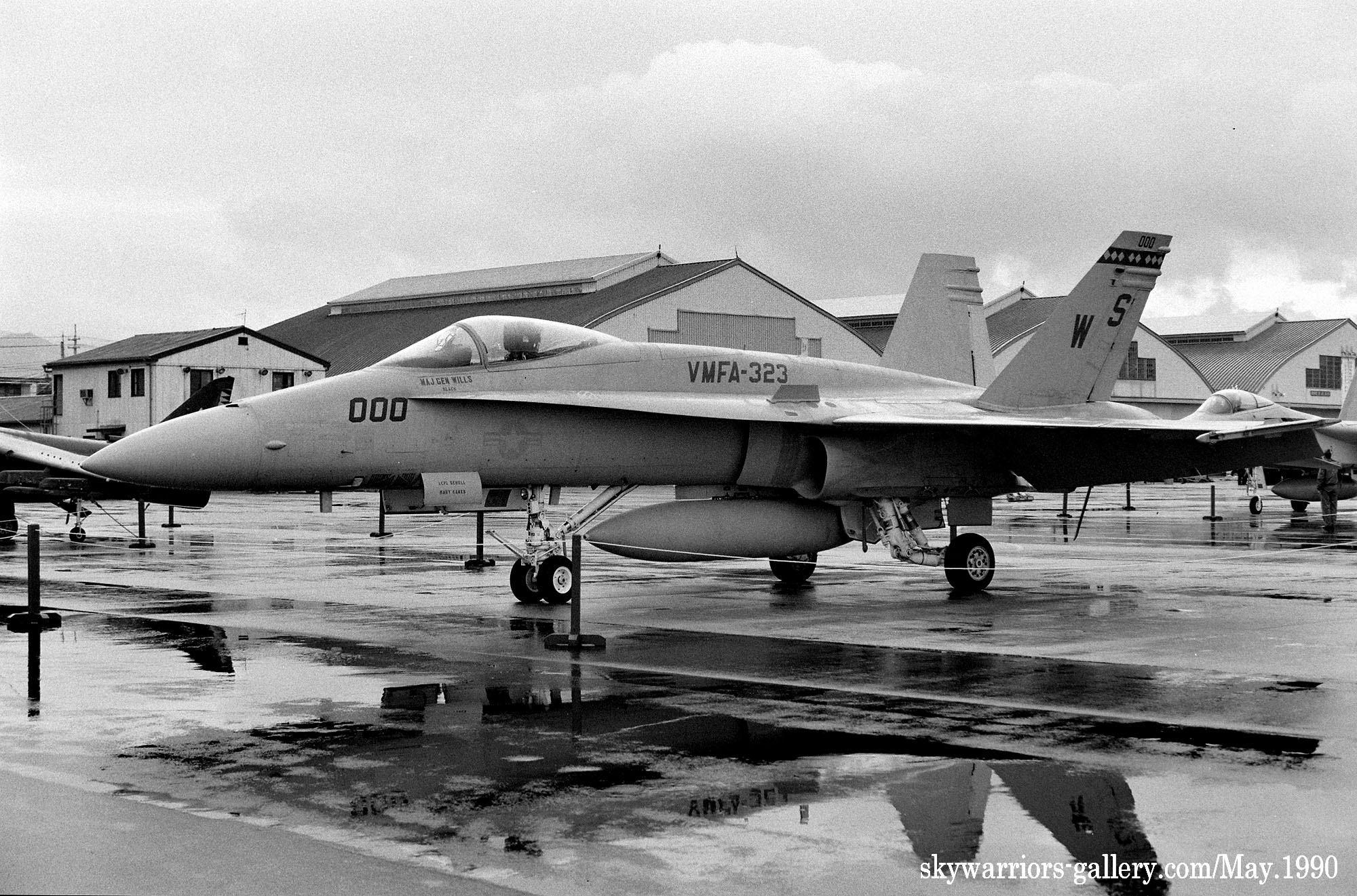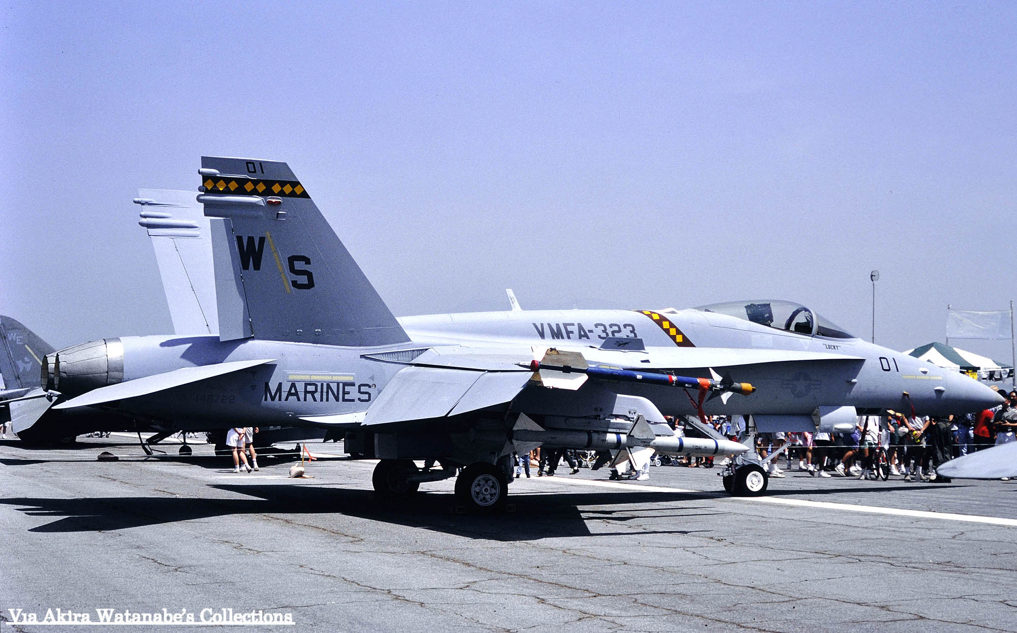 ↑ 1990年5月岩国基地に展示されたVMFA-323のFA-18A/WS-00-WS-000/Bu.No.162401 。機体の左右でModexが異なるのが面白いが、左側面のトリプルナッツは、当時の第一海兵航空団司令(少将)に敬意を表したものと推測される。