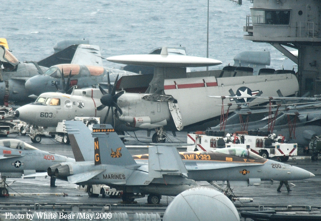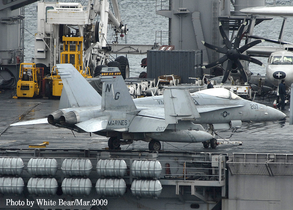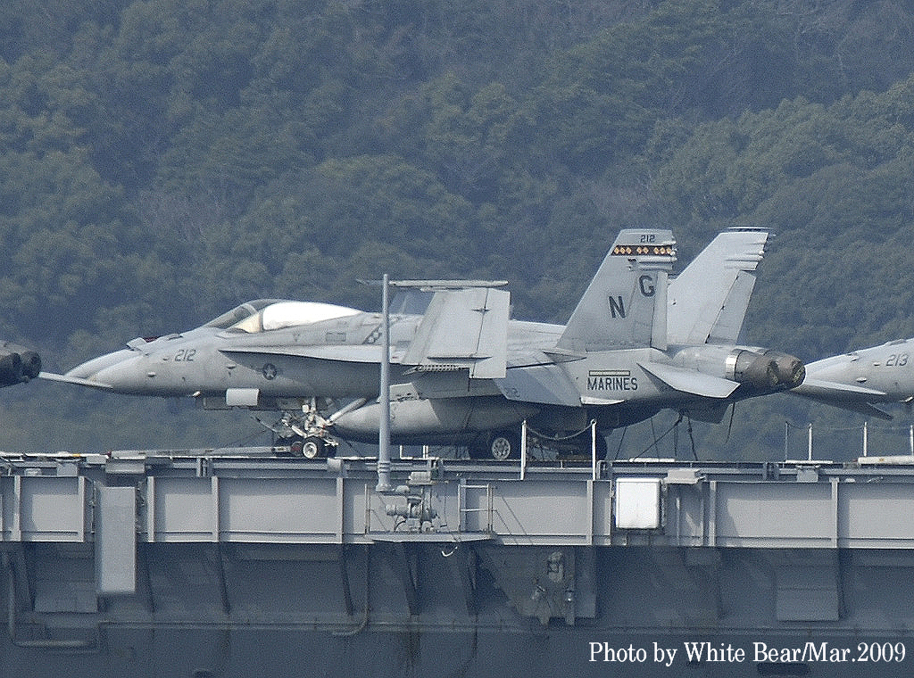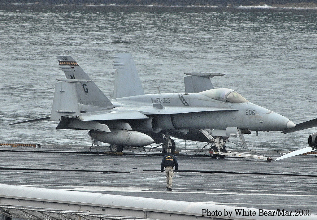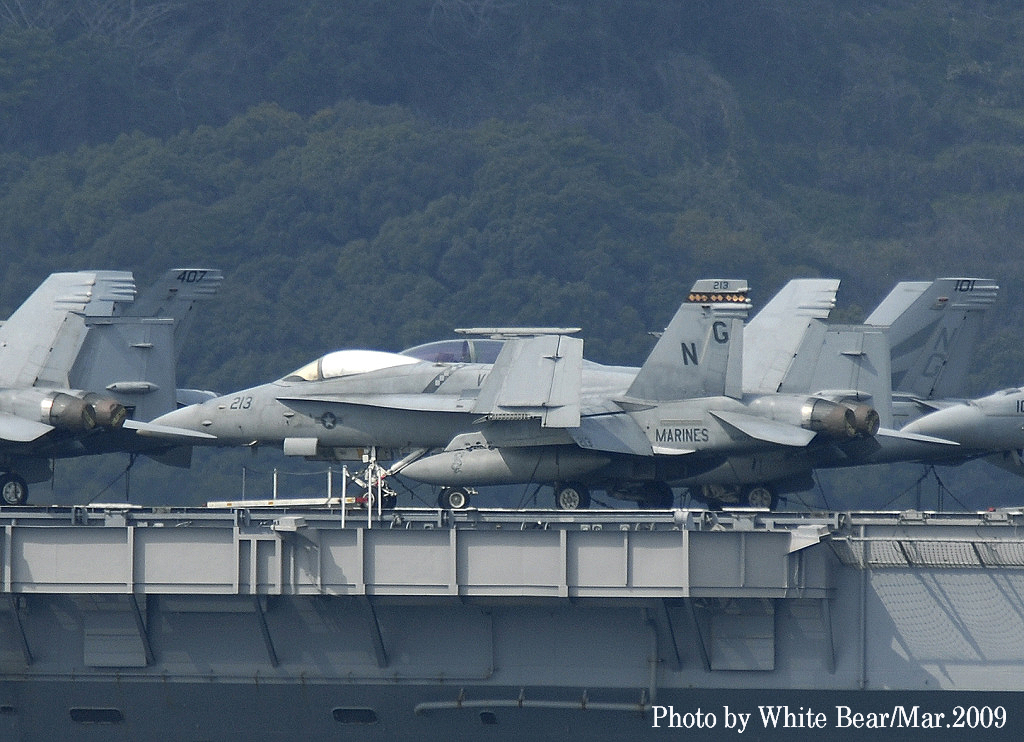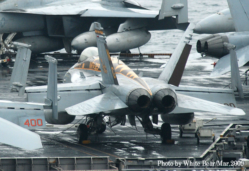 ↑ White Bearさんは、2009年3月佐世保に寄港した原子力空母ジョン・C・ステニスを追って撮影に行かれた。前日まで晴天であったが、到着当日は生憎の雨にやられてしまったそうである。USSニミッツ級原子力空母の7番艦である同艦は2007年からCVW-9(NG)を搭載するようになっていた。