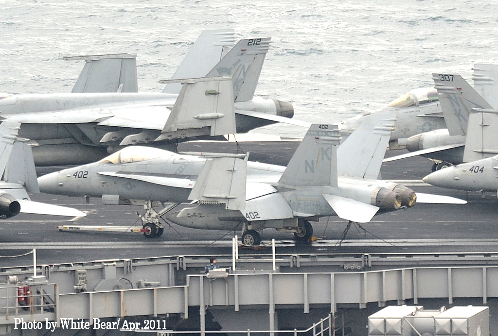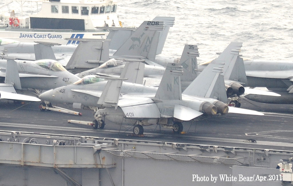 ↑ 2009年にWhite bearさんが佐世保でステニスを撮影されてから2年後の2011年4月佐世保軍港にはUSSロナルド・レーガンが寄港し、再び撮影に行かれたそうである。羨ましい事に艦上には艦載機が満載状態。空母航空団はCVW-14(NK)であるが、2年前と同じくVFA-147の機体も見える。但し機体はFA-18Eに更新されているようである。