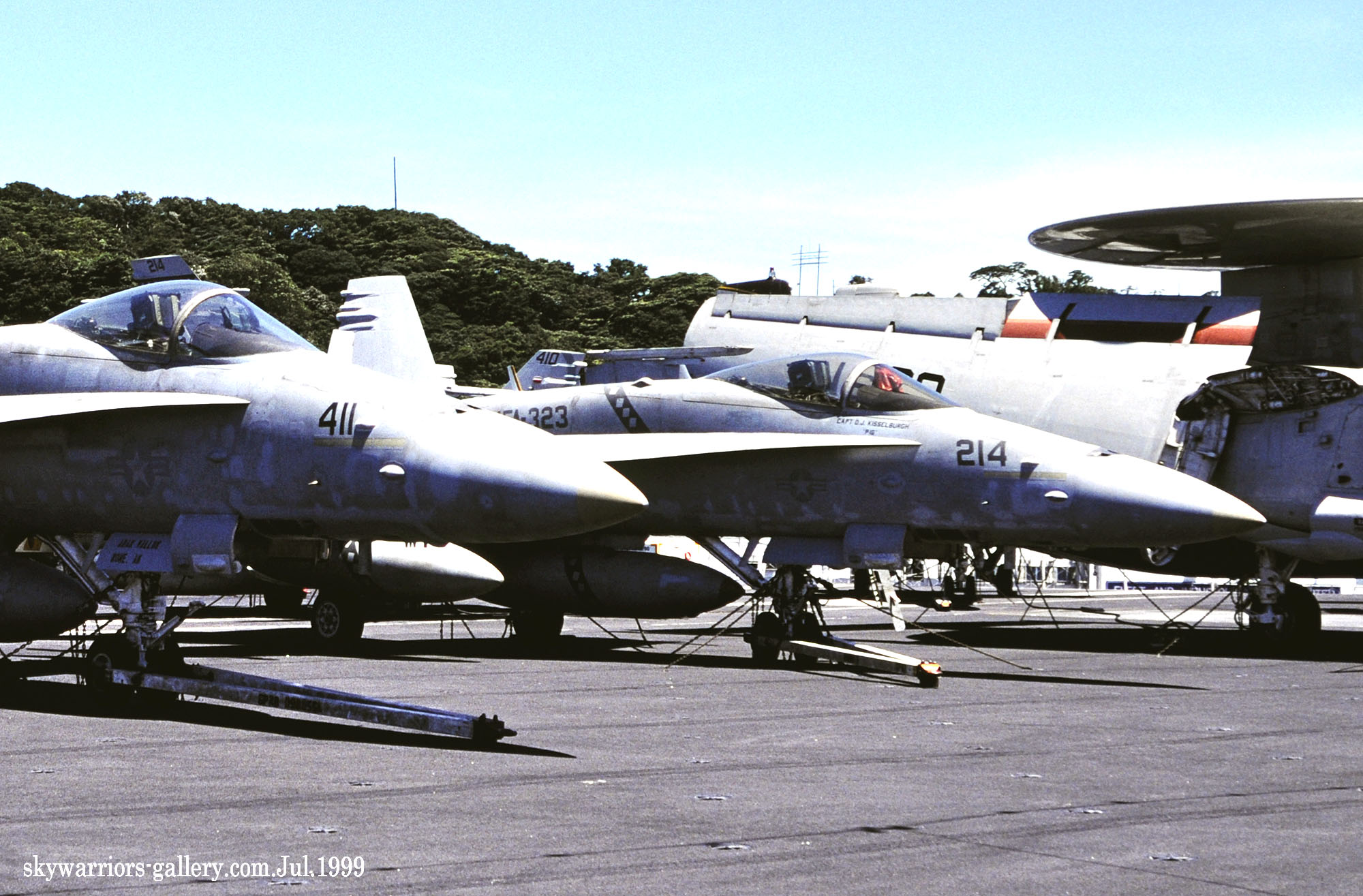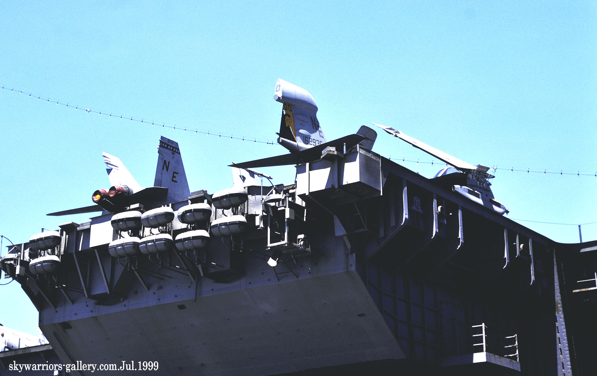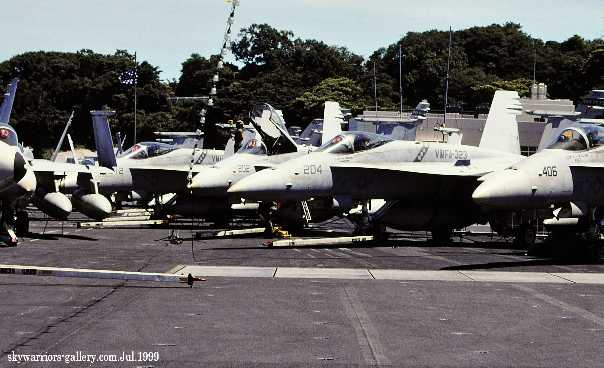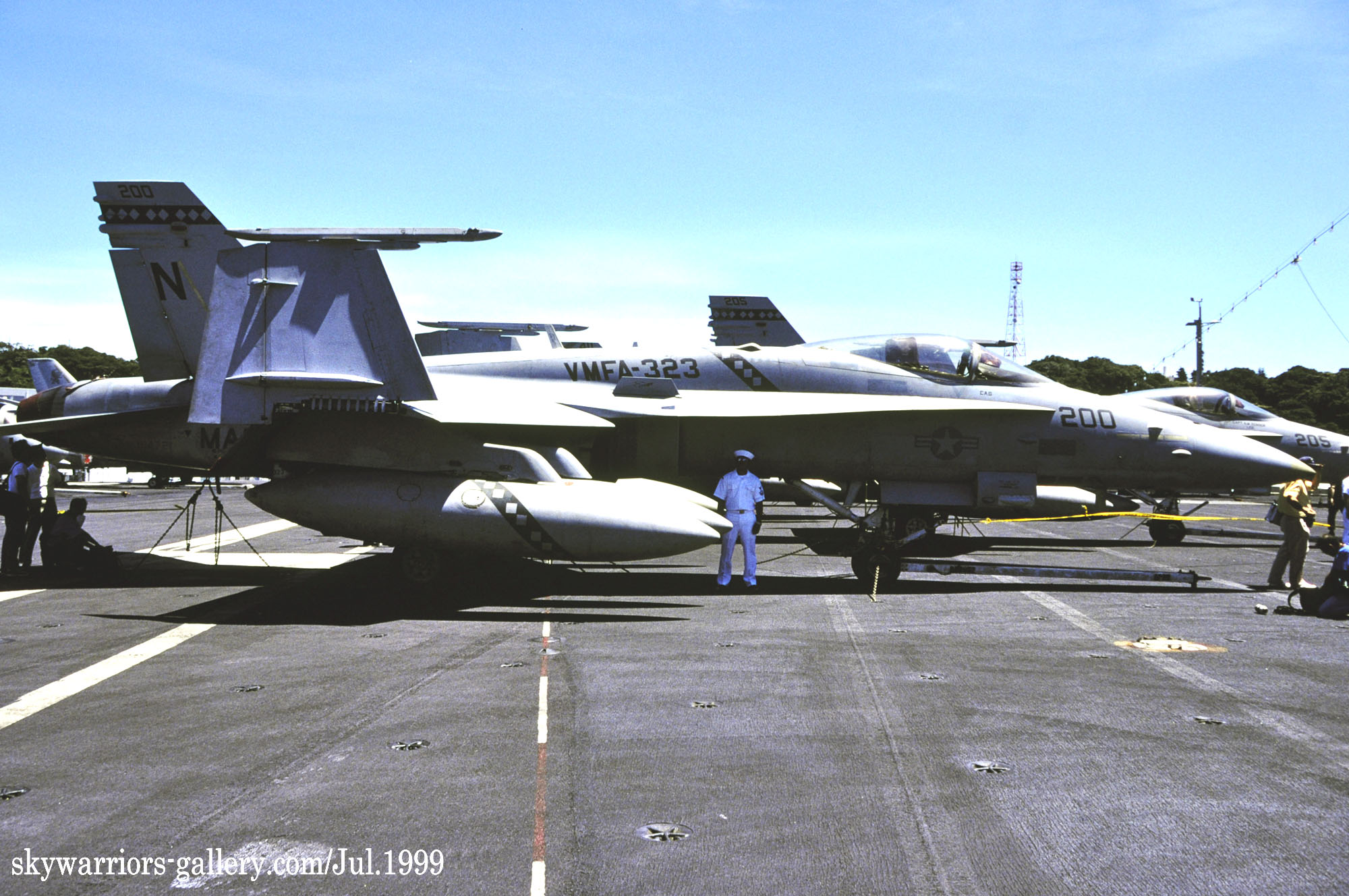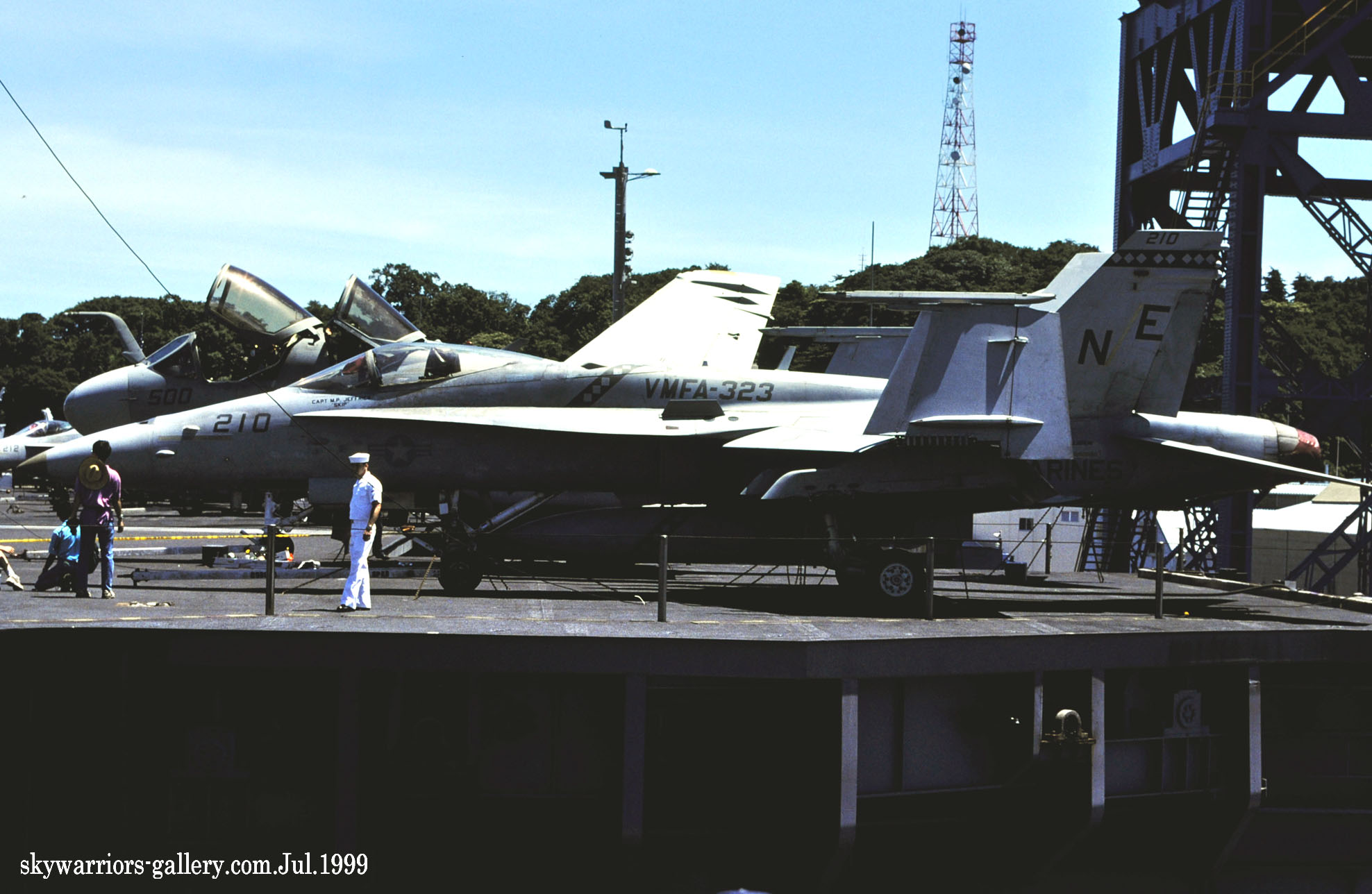 ↑ 1999年6月久々に横須賀港に寄港したUSSコンステレーションは、日曜日に空母甲板を一般公開した。艦上にはF-14Aを有するVF-2や海軍のVFA-137など艦上戦闘機の中に海兵隊のVMFA-323のFA-18Cが並んでいた。