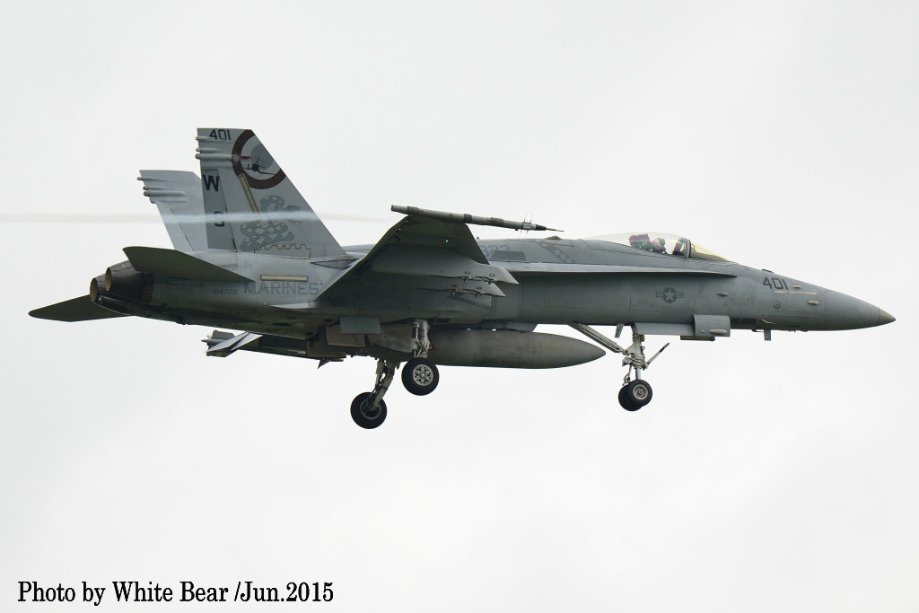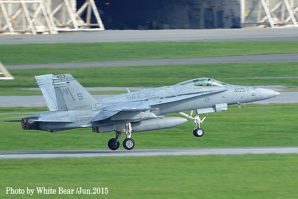 2015年6月 嘉手納に赴いた私は、2015年2月12日から岩国に配備されたデス・ラトラースのレガシーホーネットFA-18Cを幸運にも撮影することができた。Modexは、空母展開する上で 3桁の400番台を付けており 海兵隊の二桁Modexでないことが、多少私にとっては残念であったが、十年以上ご無沙汰していた部隊だったのでありがたく撮影を楽しむ事とした。ニュースによると 2015年2月に岩国に配備されたVMFA-323のFA-18Cは10機、派遣要員は約200名との事である。私が今回も撮れなかったVMFA-115の交代でNASミラマーからハワイのMCASカネオヘ経由で岩国に飛来したそうである。(2015年6月 記)