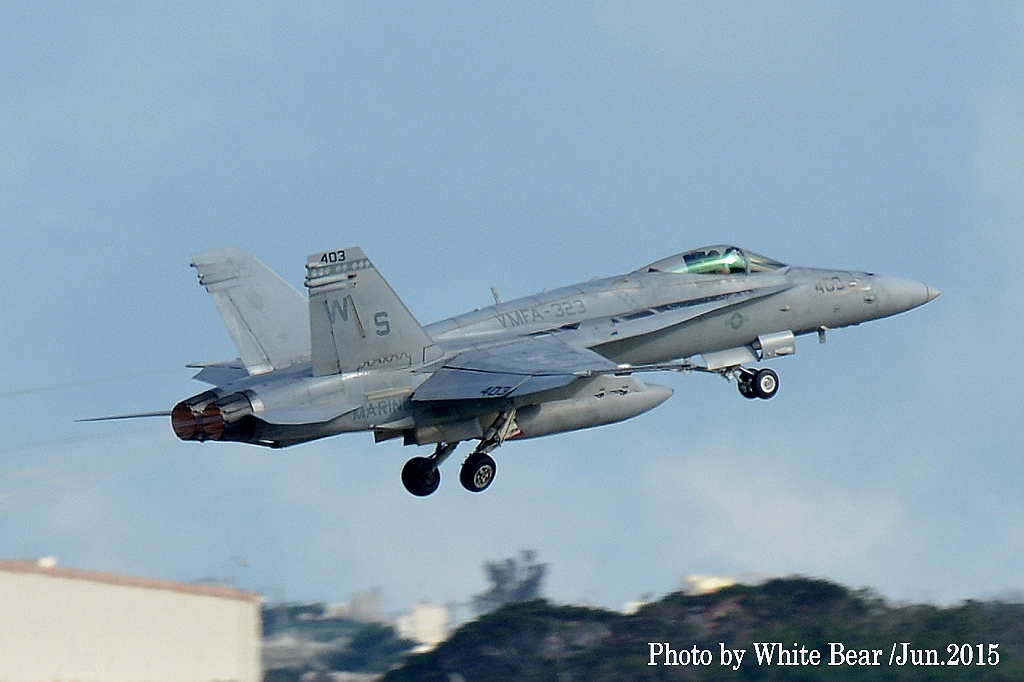 ↑ 訓練を終え嘉手納基地へ着陸するVMFA-323のFA-18C/WS-404。White Bearさんと私は写真の日付を見ると約1週間のずれがあっただけで、6月の初旬と中旬にすれ違うように訪問していたようである。