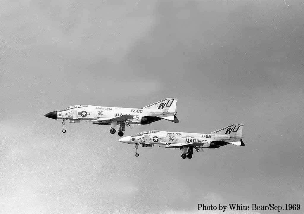 ↑ 本項一連の写真は全て、White Bearさんが1969年9月岩国基地で撮影されたVMFA-334のF-4Jの写真である。岩国の旧滑走路をR/W-02で離陸するVMFA-334のF-4J/WU-01。この機体は1979年にVMFA-235/DB-162として岩国に来ている。