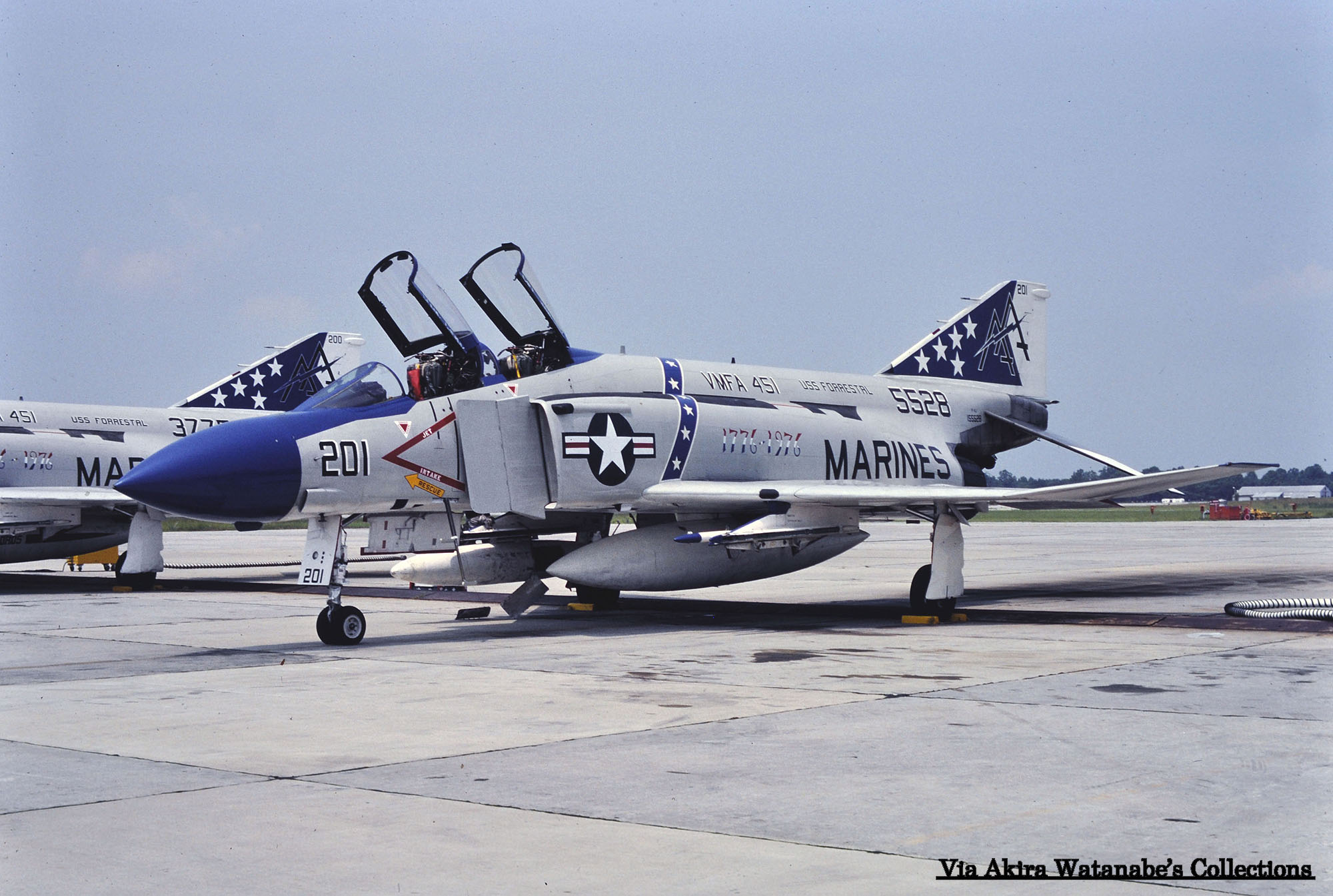 ↑ 1976年7月ビューフォート海兵隊基地で撮影されたVMFA-451のF-4J。胴体には"1776-1976"とトリコロールで書かれており、この年がアメリカ建国200周年に当たる記念マーキングである事が判る。レードームまでマリンブルーに塗るなど派手すぎる出で立ちだ。この時期同飛行隊は、空母フォレスタルに搭載されて訓練航海に出ており、テールコードはVMではなく、CVW-17の所属を示す"AA"が使われた。しかし、予定されていた地中海方面の航海は中止された。