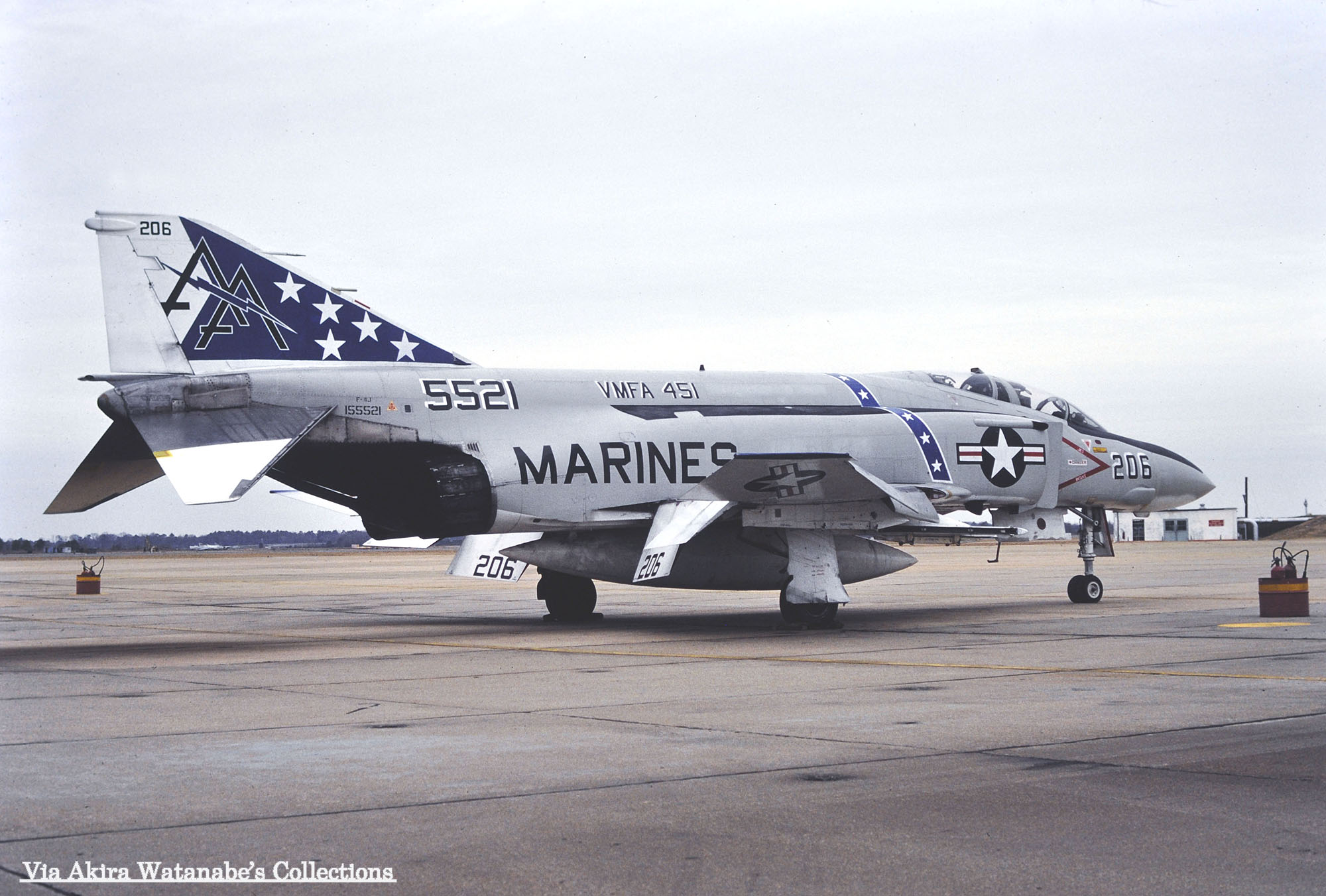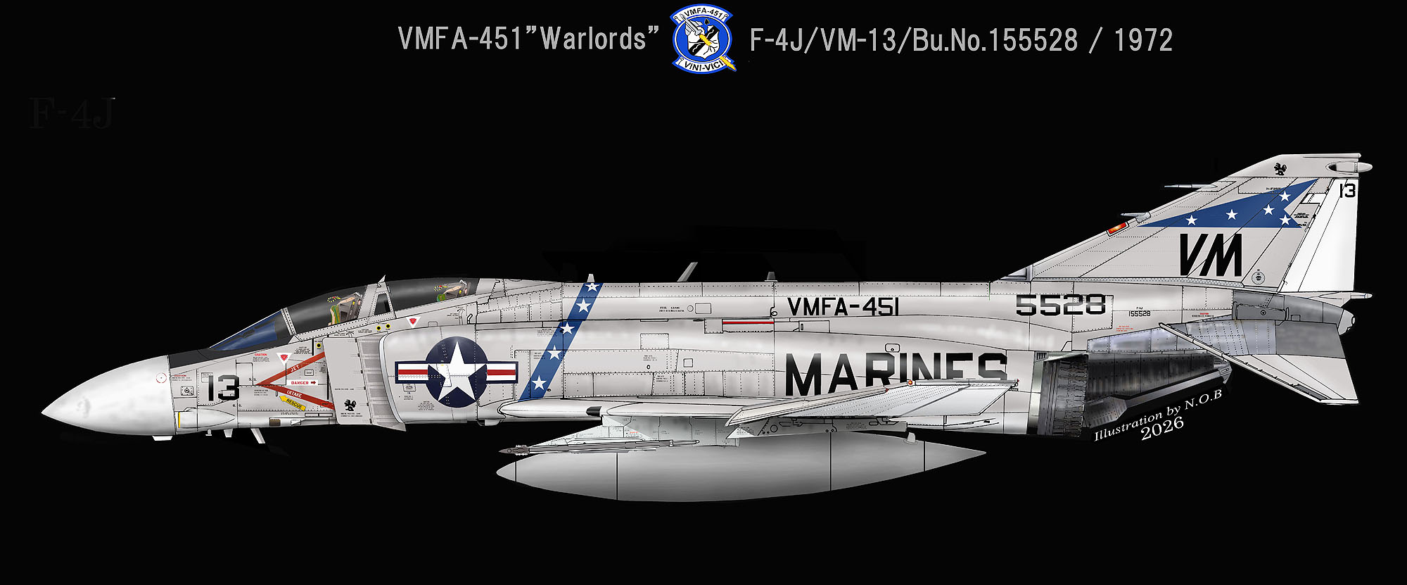 創隊当初の初期マーキングとされるVMFA-451のF-4J。尾翼の5つ星のシェブロンと側面に5つの星が入った帯が入っていた。胴体の帯は海軍機ではよく見られたが、海兵隊機では同隊とVMFA-323以外殆ど見られないものだった。F-4J/VM-13/Bu.No.155528