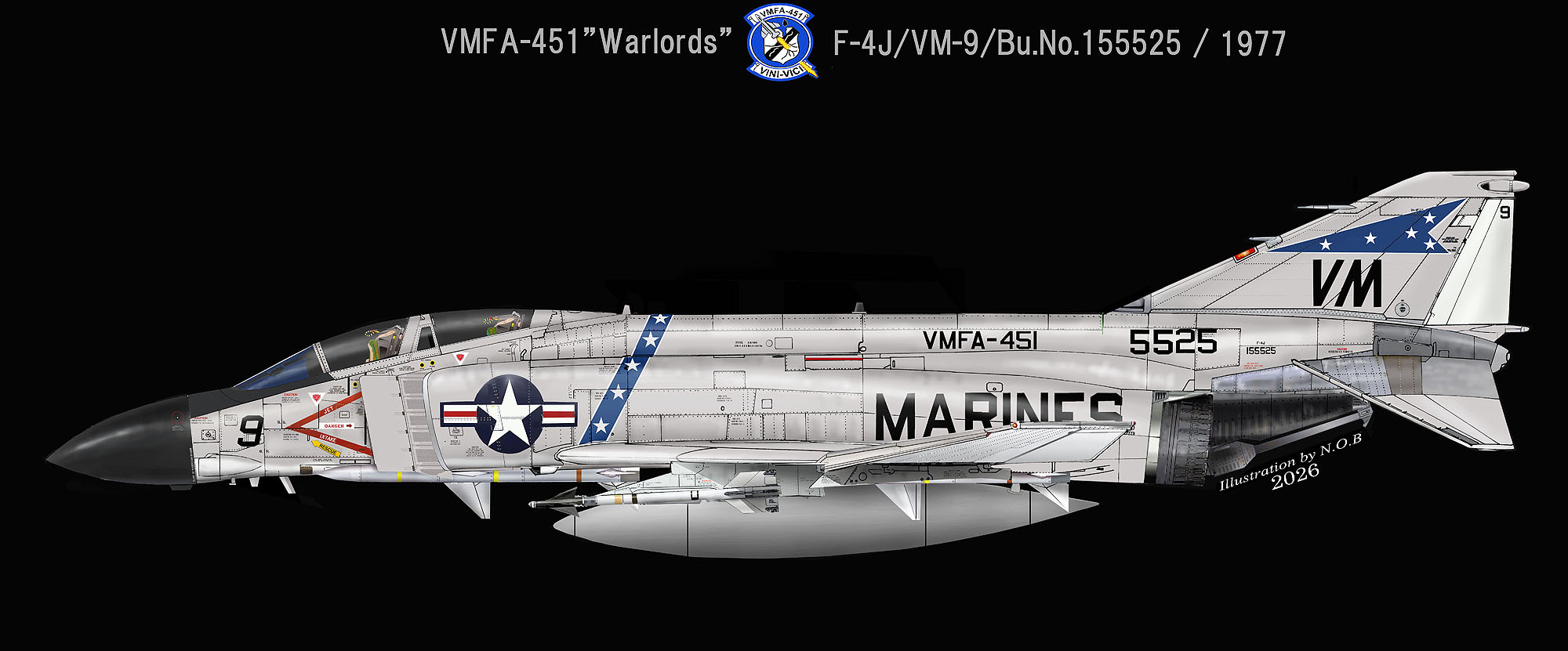 ↑ 次ページのイラストで再現した新マーキングに混じって1977年まで、このシェブロンの塗装は残った様である。一時的に機首のModexは、斜文字を使っていた。本機"VM-9"は、シェブロンも帯も白い枠付きである。部隊番号"VMFA-451"の記載位置が他の飛行隊に比べ胴体後方であるのも特徴。F-4J/VM-9/Bu.No.155525